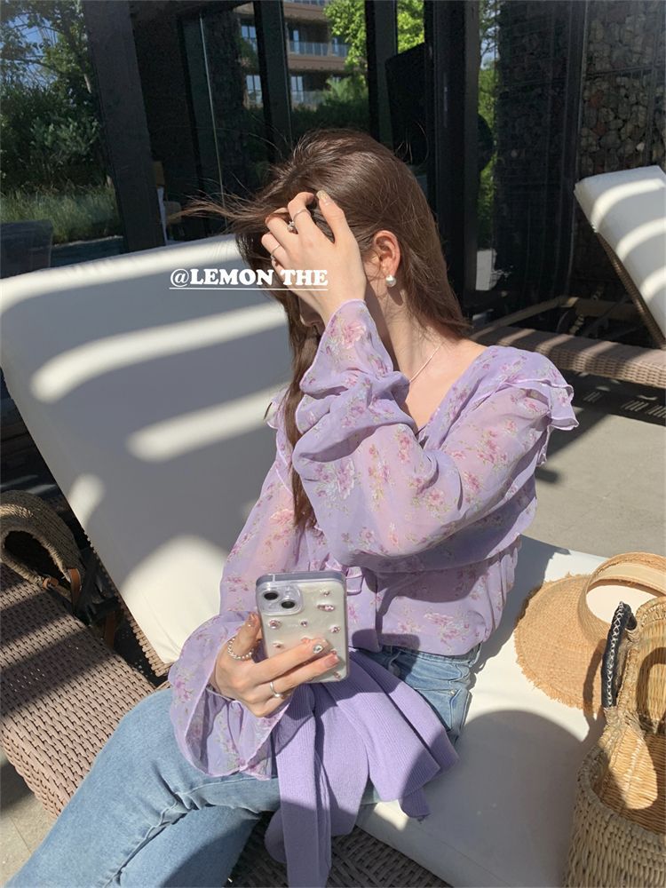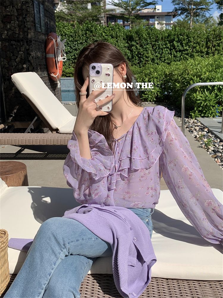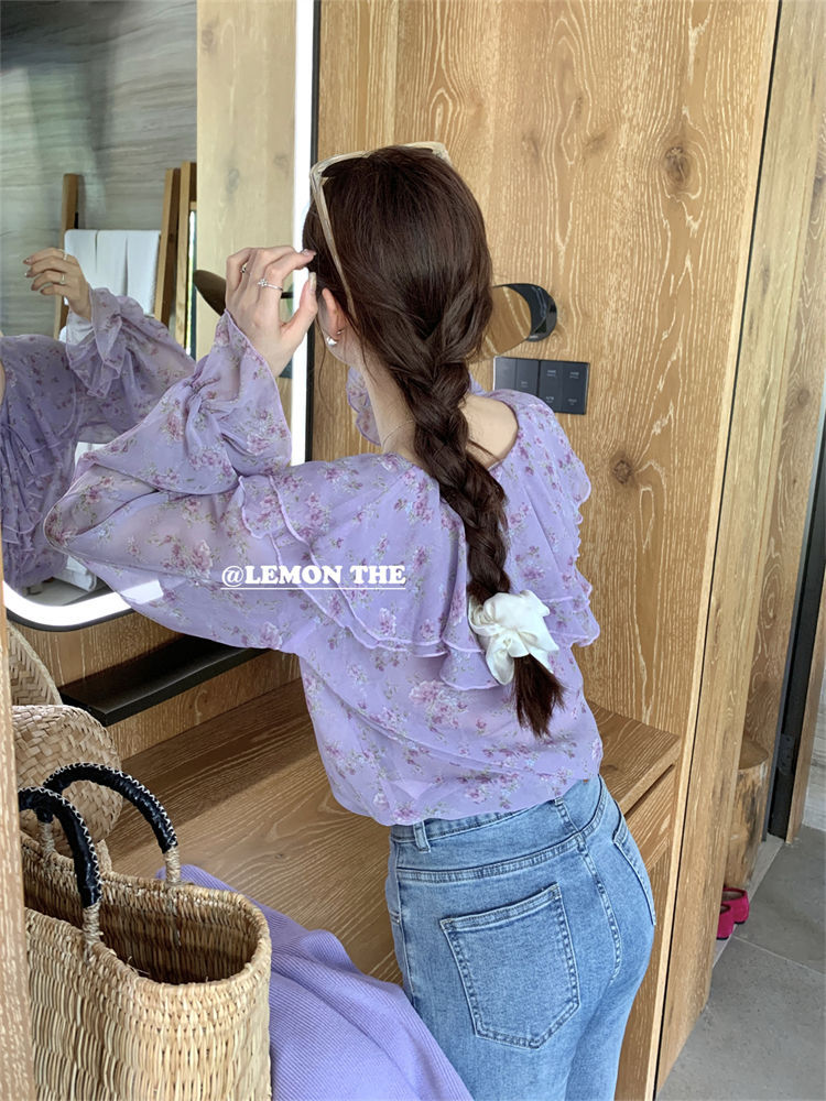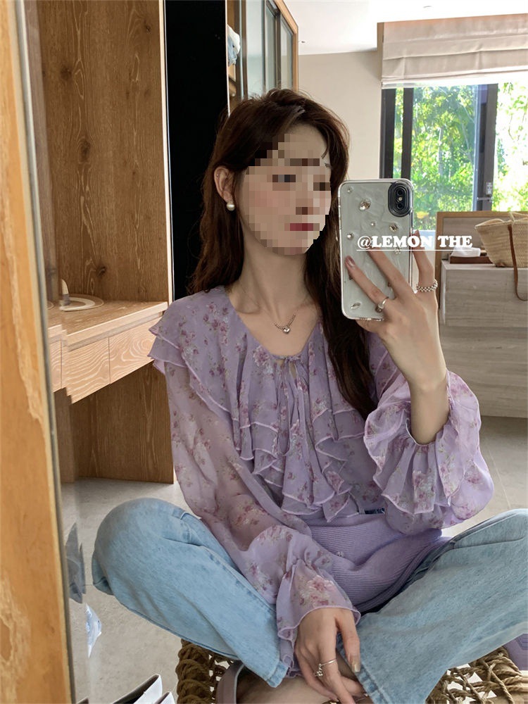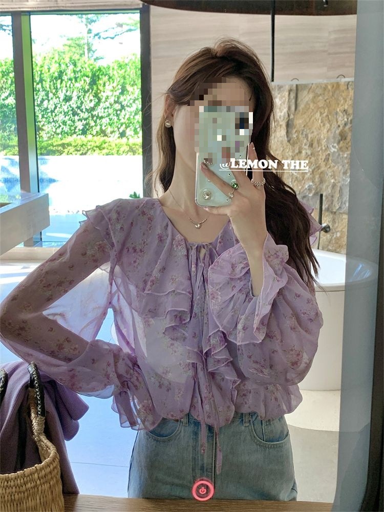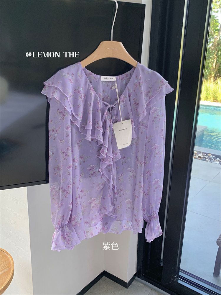 여성용 러플 플로럴 쉬폰 셔츠, 니치 보우 스트랩 셔츠, 프렌치 스타일의 상큼하고 달콤한 탑스토어 가기
