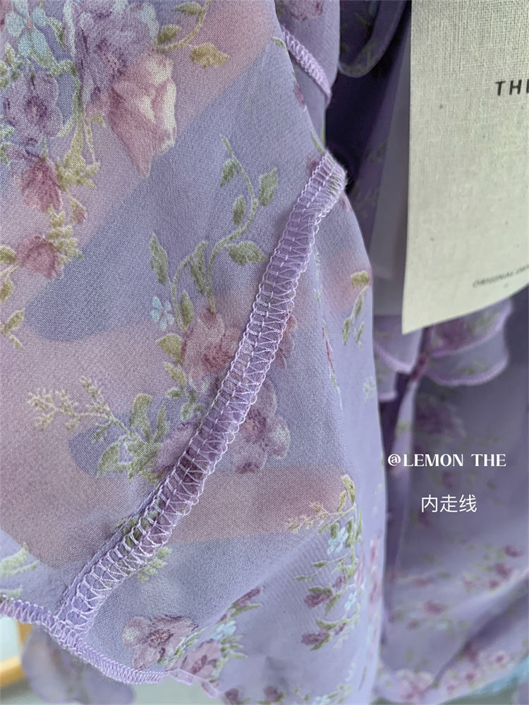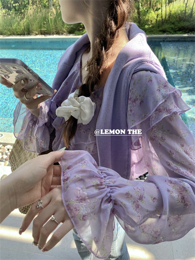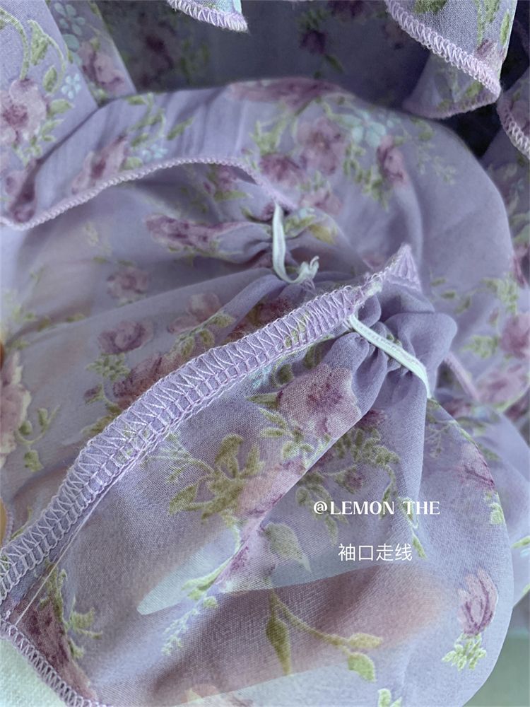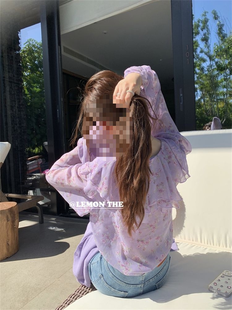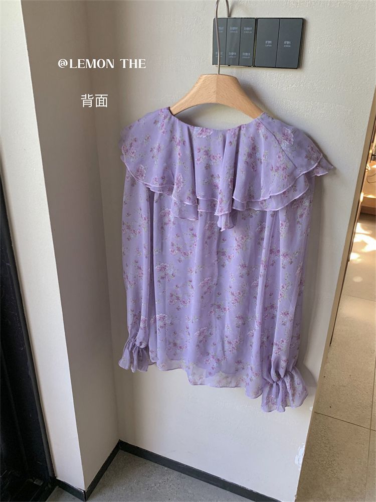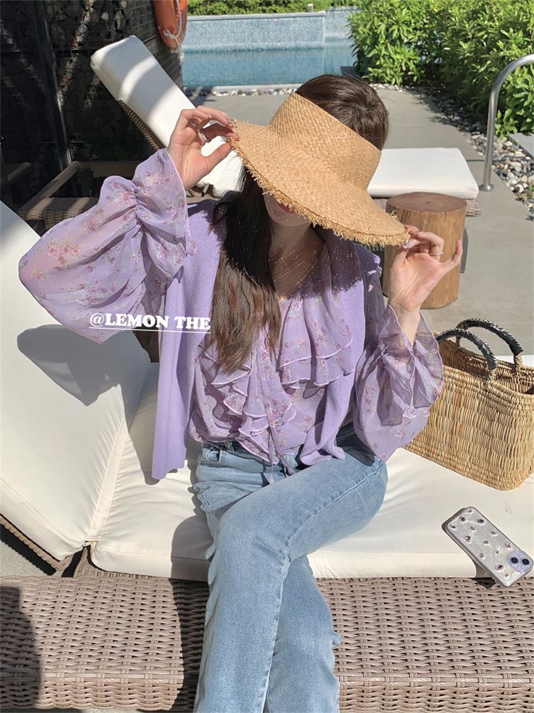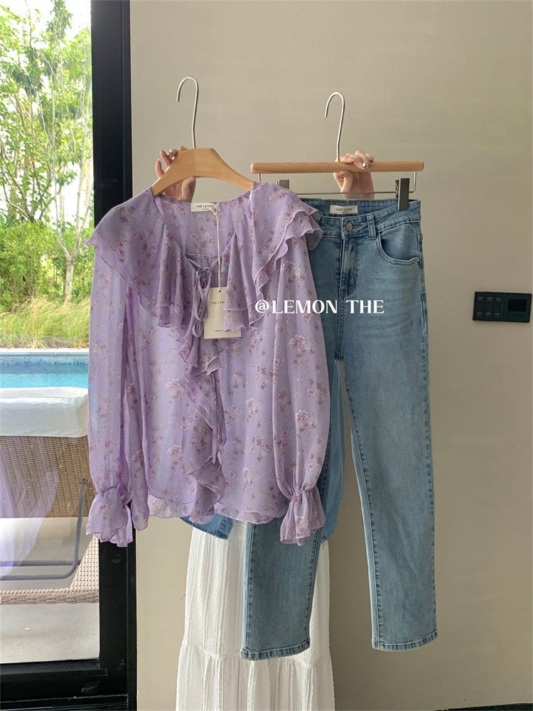 여성용 러플 플로럴 쉬폰 셔츠, 니치 보우 스트랩 셔츠, 프렌치 스타일의 상큼하고 달콤한 탑스토어 가기