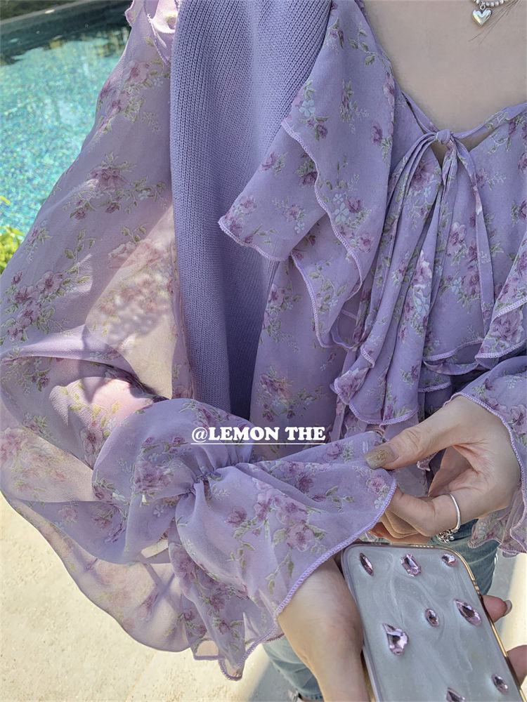 여성용 러플 플로럴 쉬폰 셔츠, 니치 보우 스트랩 셔츠, 프렌치 스타일의 상큼하고 달콤한 탑