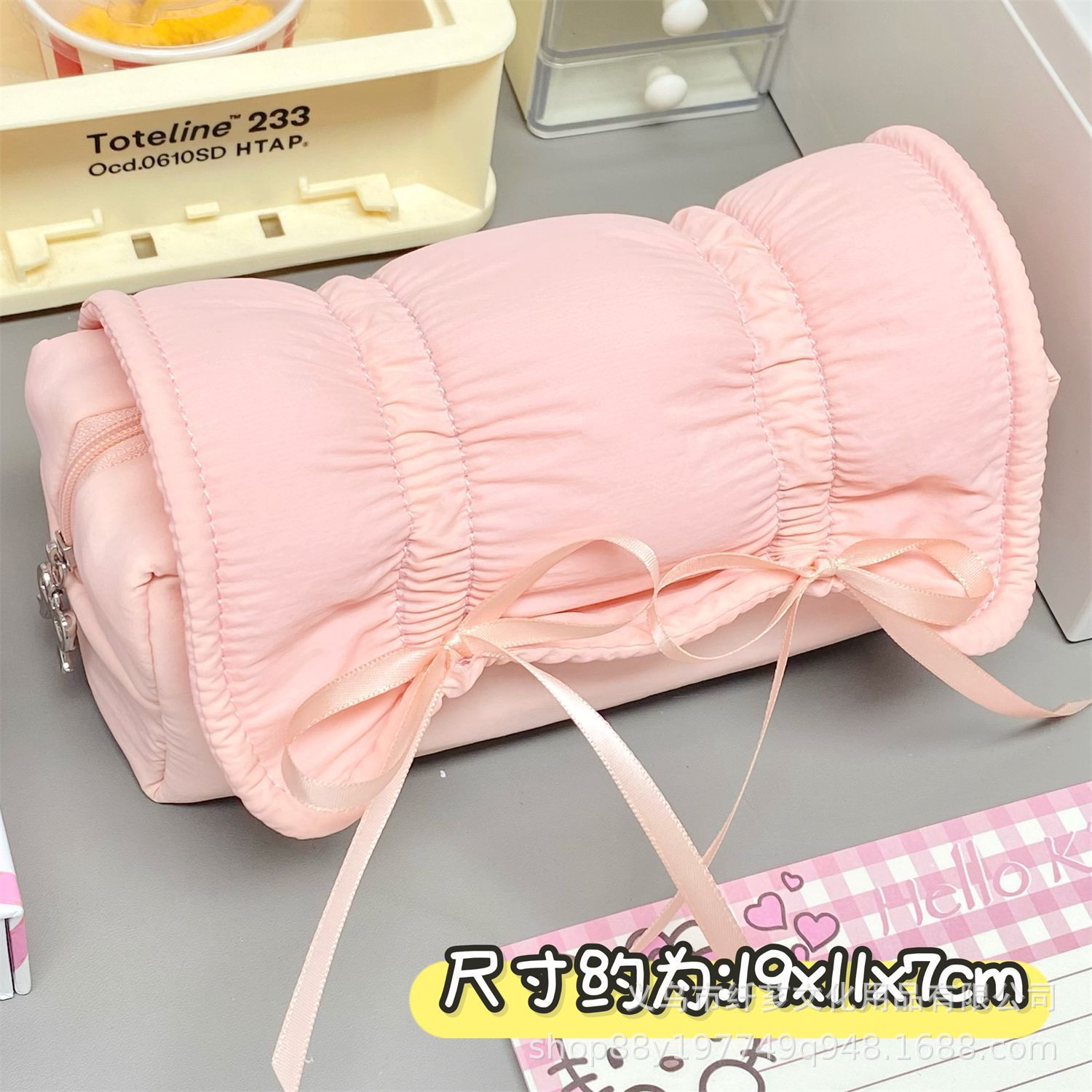 Ins 스타일 발레 스타일 밀크 블루 보우 풀 아웃 펜 가방 학생 소녀를위한 고급스러운 대용량 문구 보관 가방