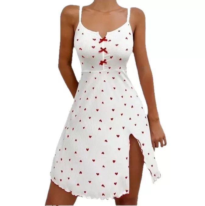 앞면에 슬릿이 있는 심플한 V 섹시한 서스펜더 스커트가 있는 새로운 크로스보더 러브 프린트 홈 나이트가운, 여성용 홈웨어스토어 가기