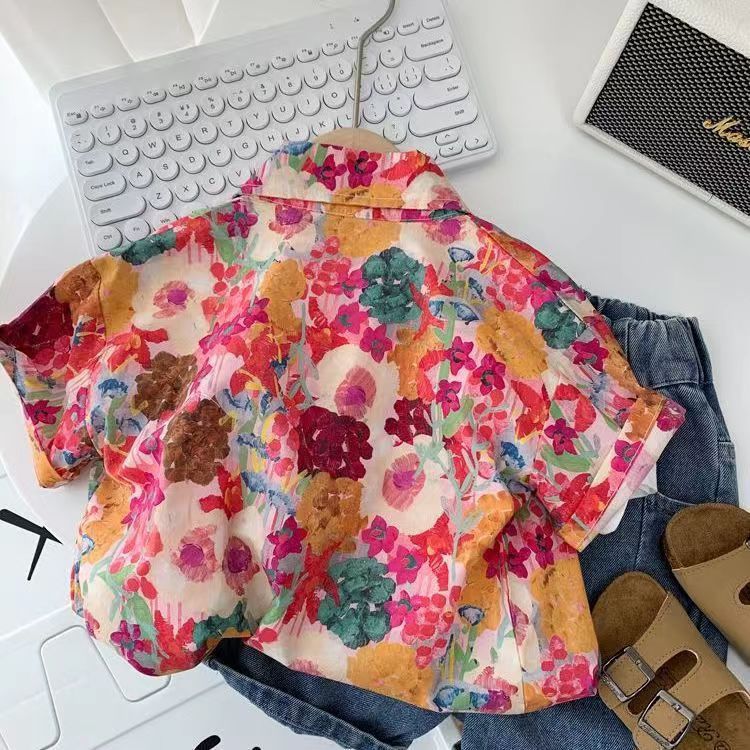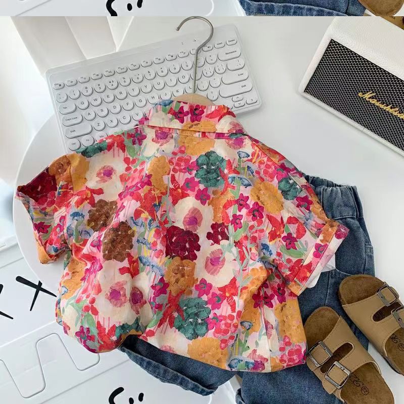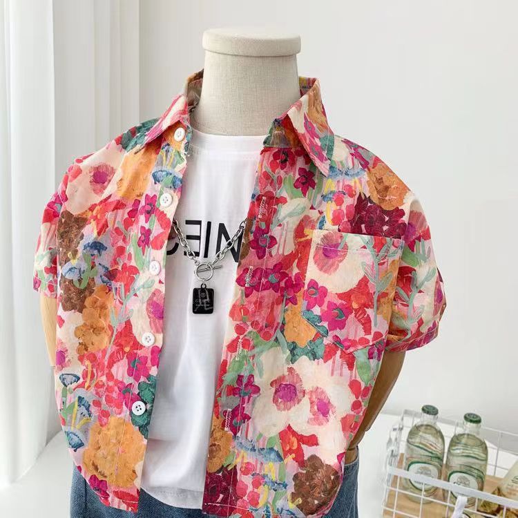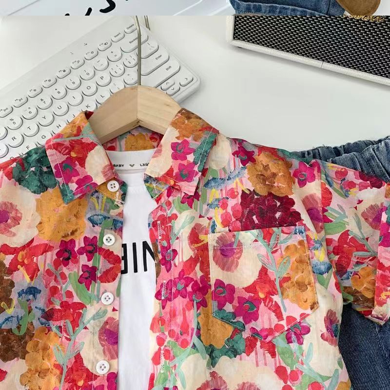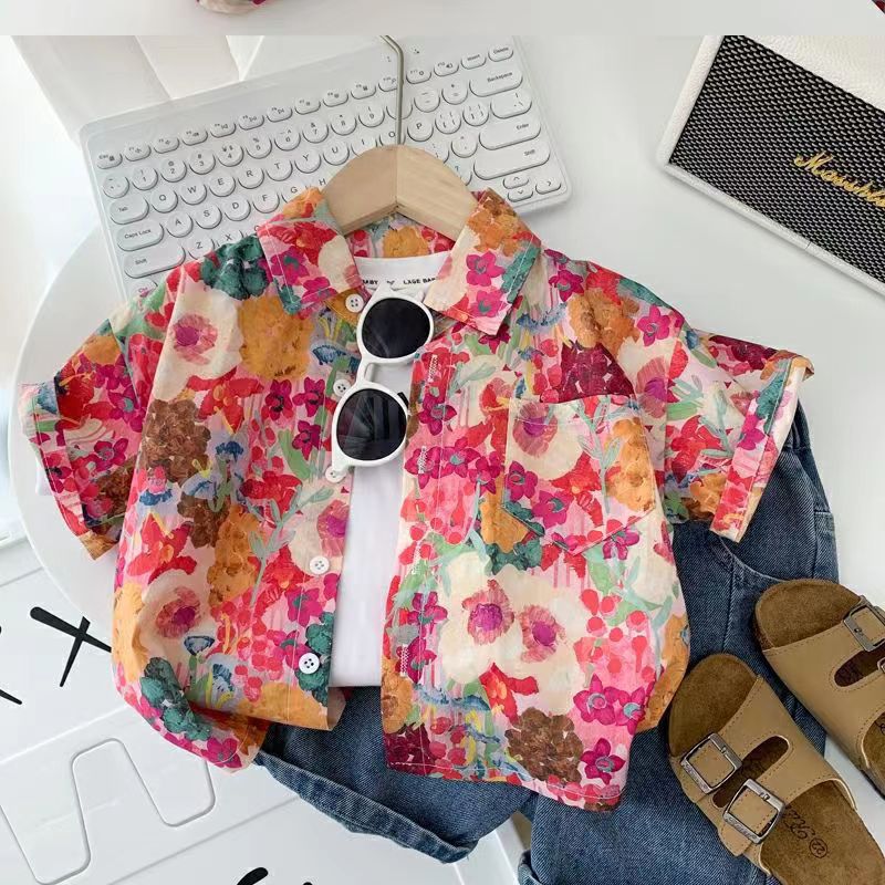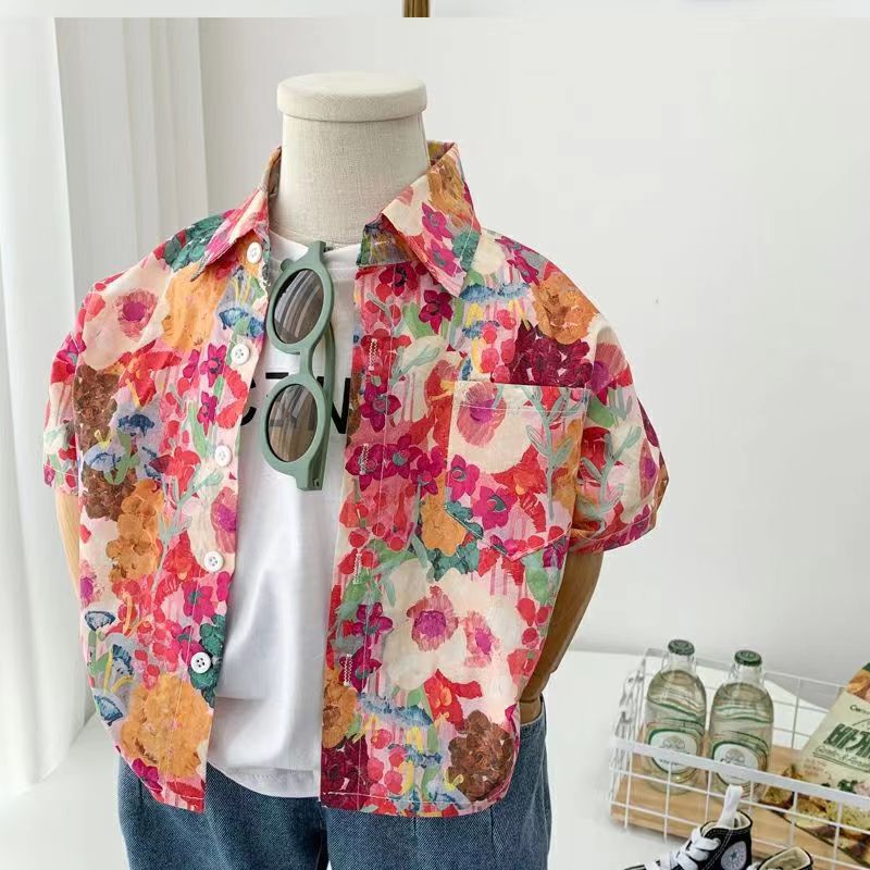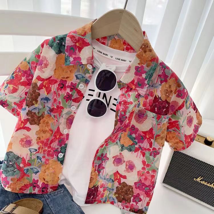 아동용 꽃무늬 셔츠, 남아용 여름 인기 아동 캐주얼 상의, 인터넷 연예인 베이비 비치 스타일 셔츠, 반팔 트렌디스토어 가기