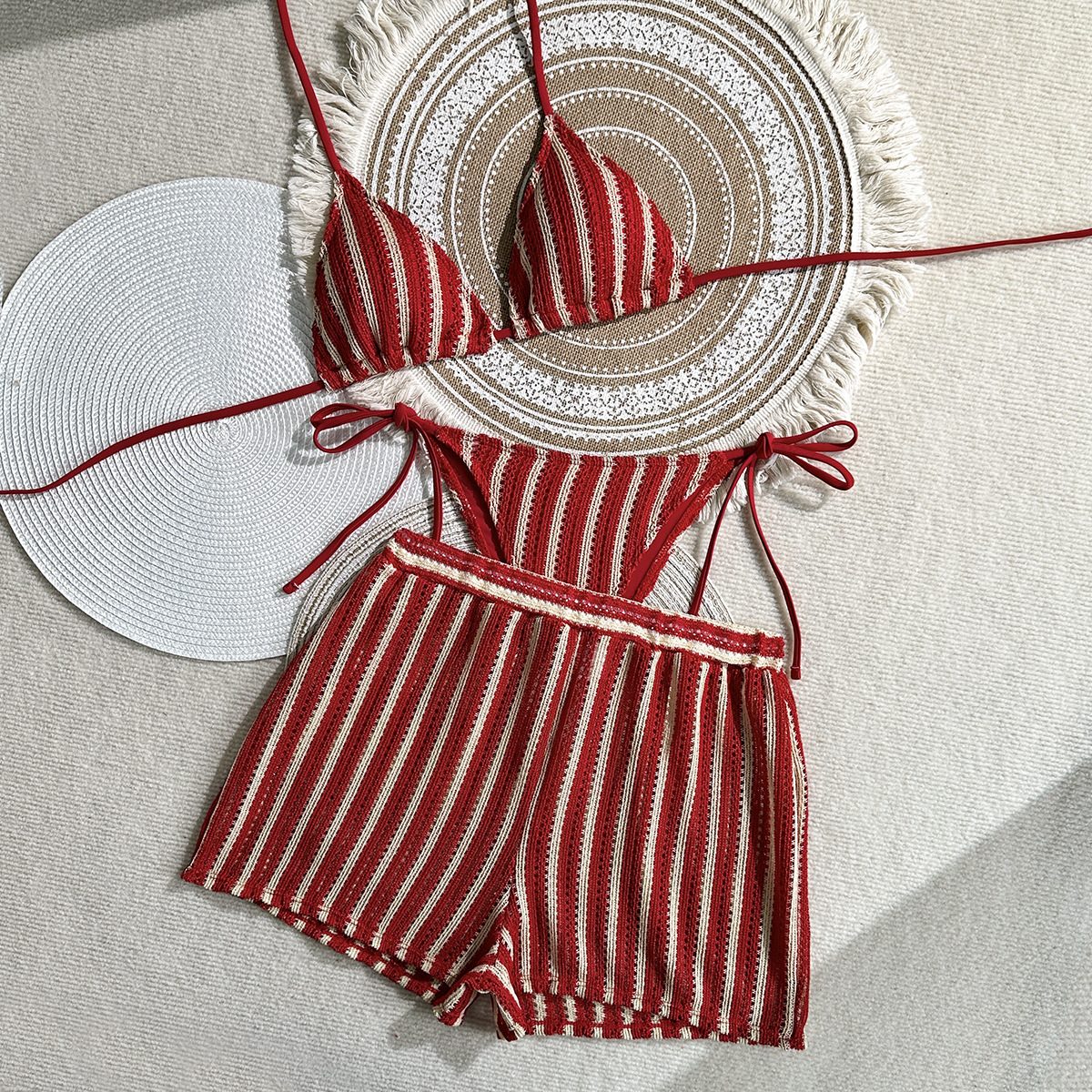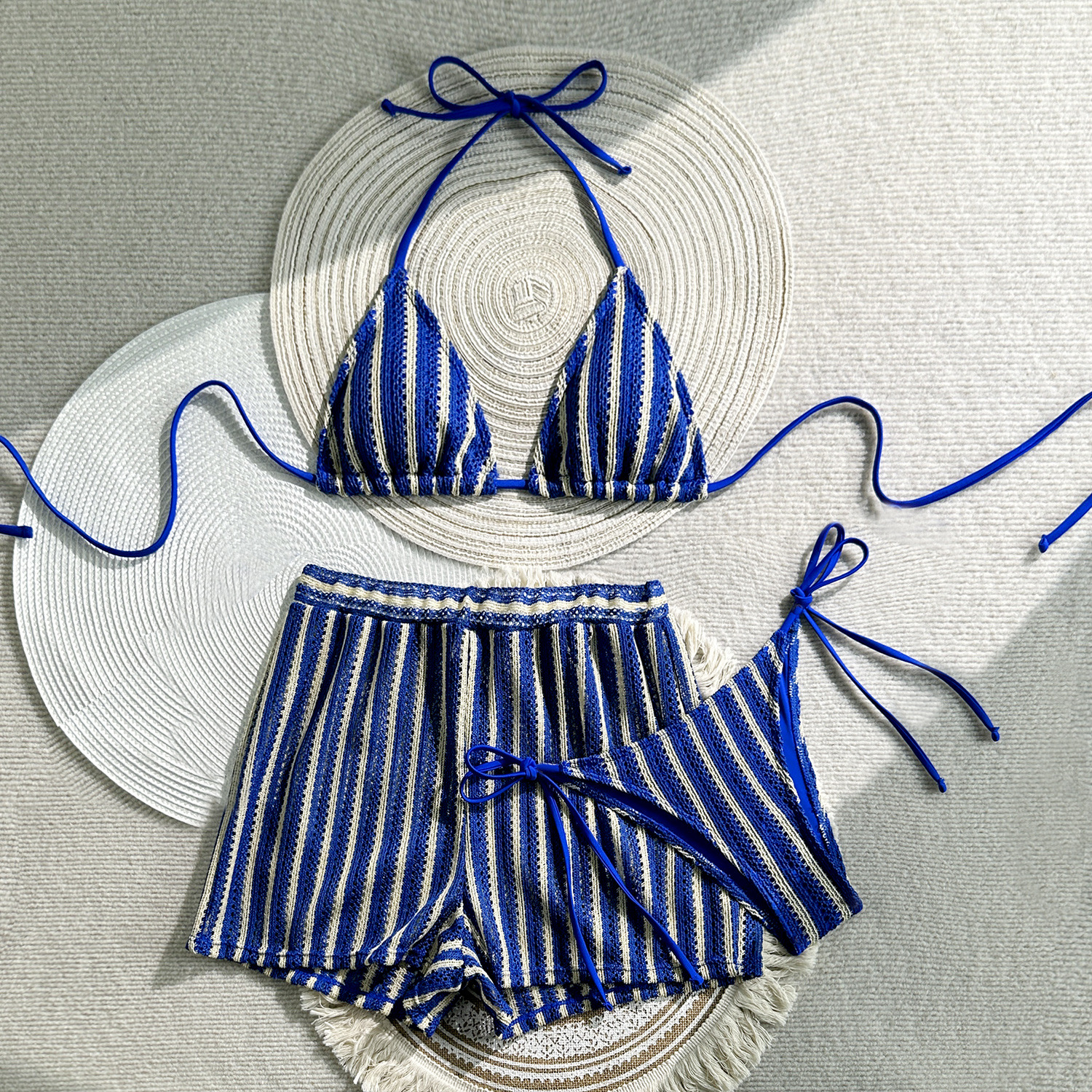 2026 유럽 및 미국 신상 패션 섹시 레이스업 스트라이프 3피스 수영복 비키니 해외 무역