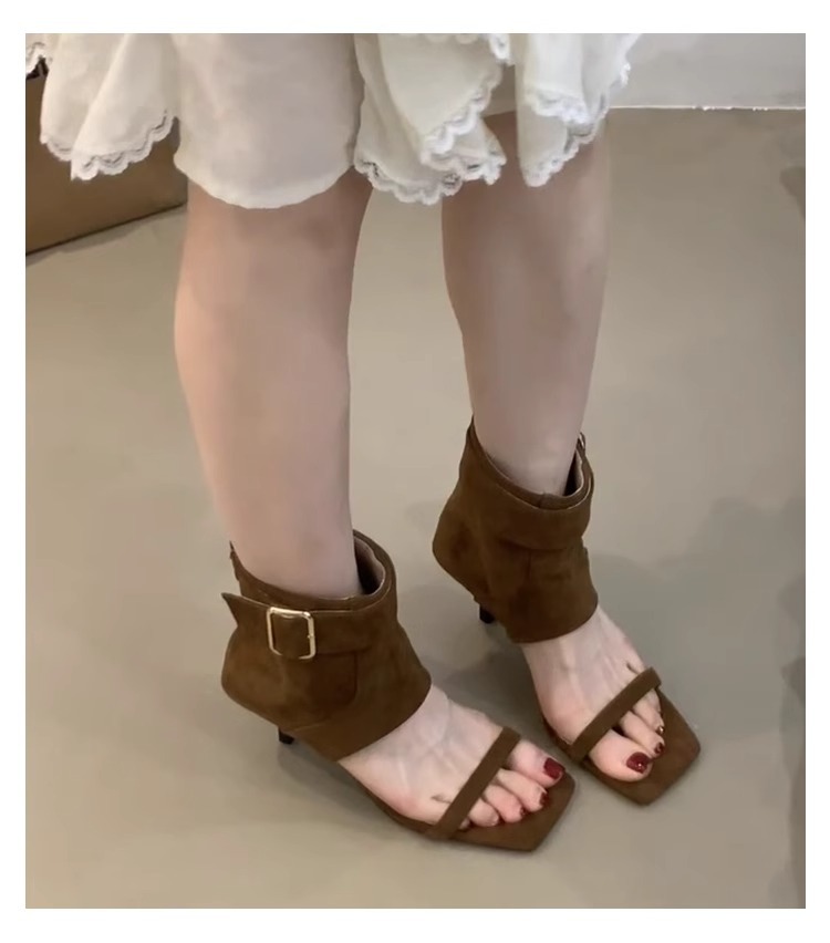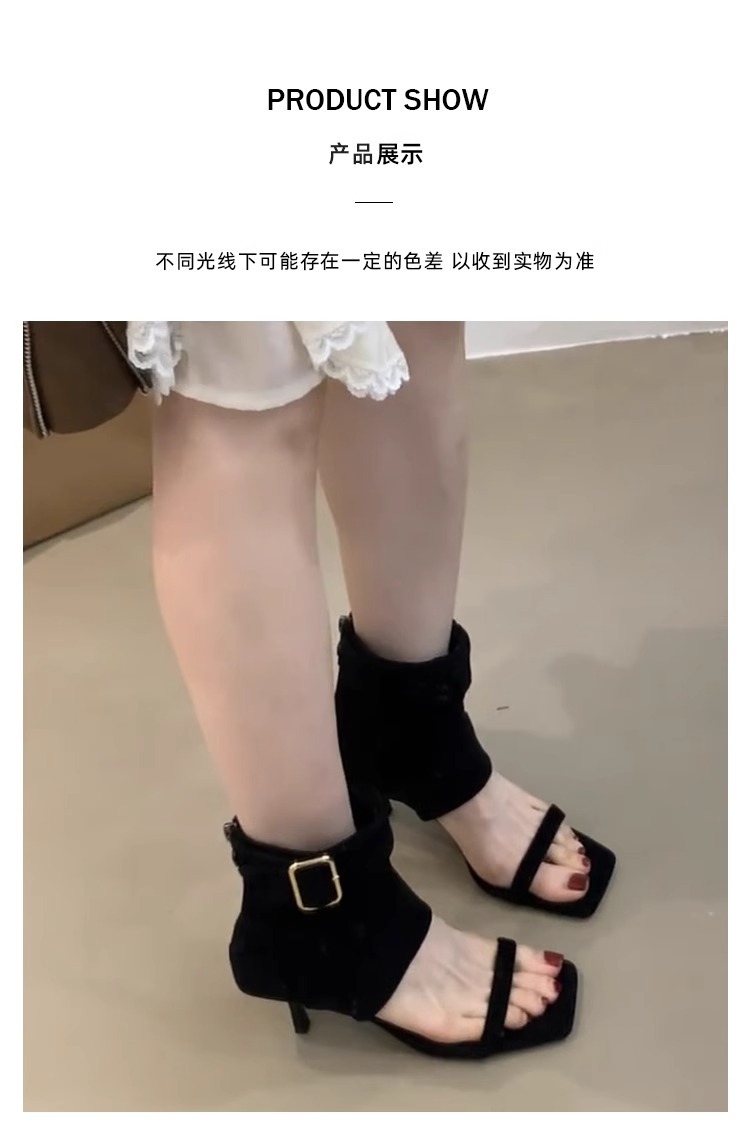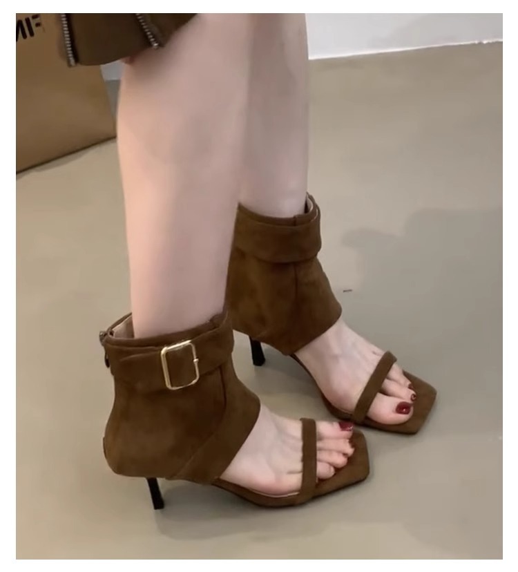 여성용 스틸레토 샌들, 유럽과 미국 스타일의 2025 새로운 스타일 인터넷 연예인 복고풍 스웨이드 오픈 토우 벨트 버클 하이힐 샌들스토어 가기