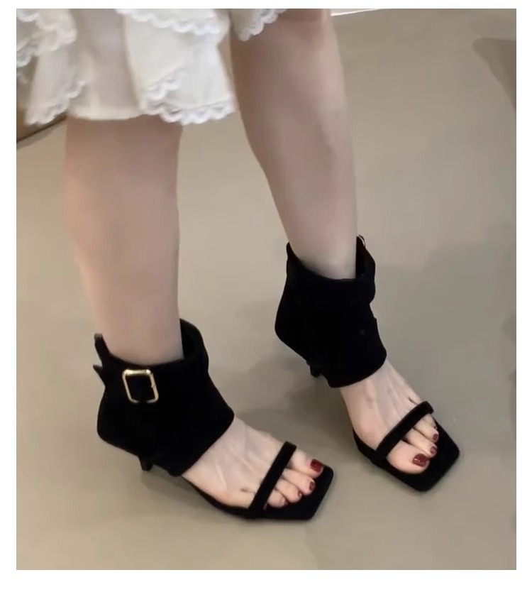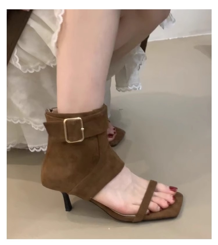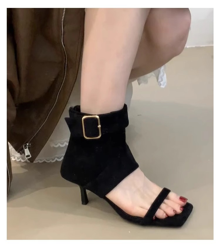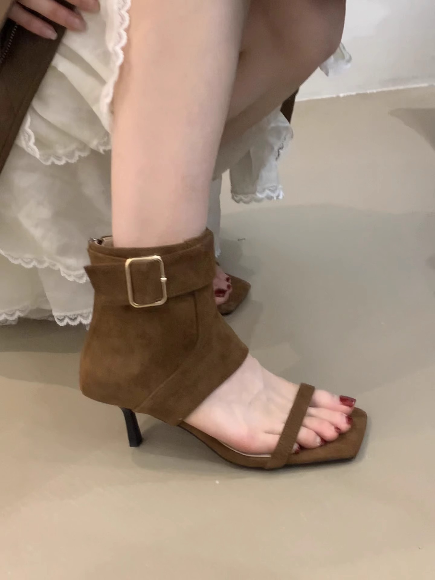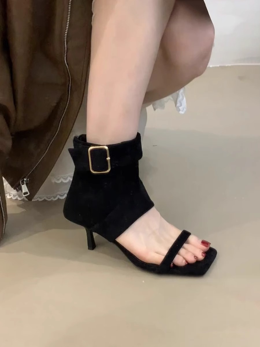 여성용 스틸레토 샌들, 유럽과 미국 스타일의 2025 새로운 스타일 인터넷 연예인 복고풍 스웨이드 오픈 토우 벨트 버클 하이힐 샌들