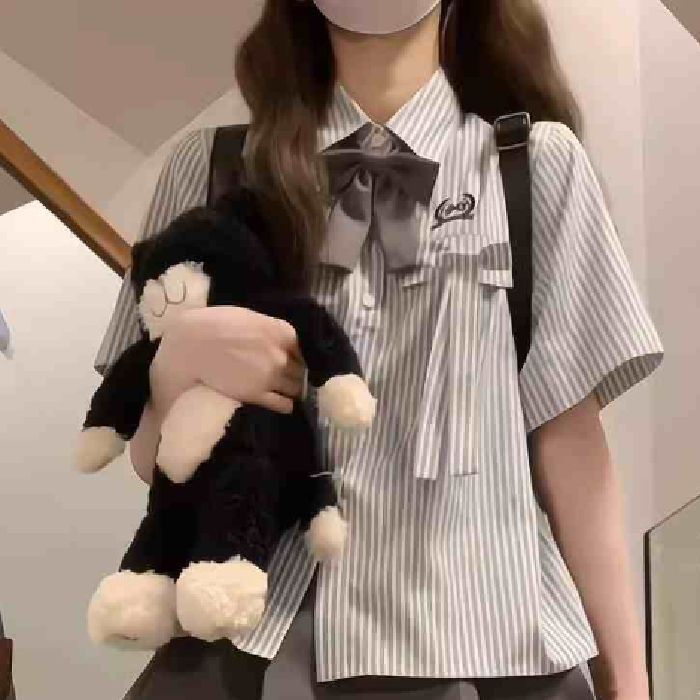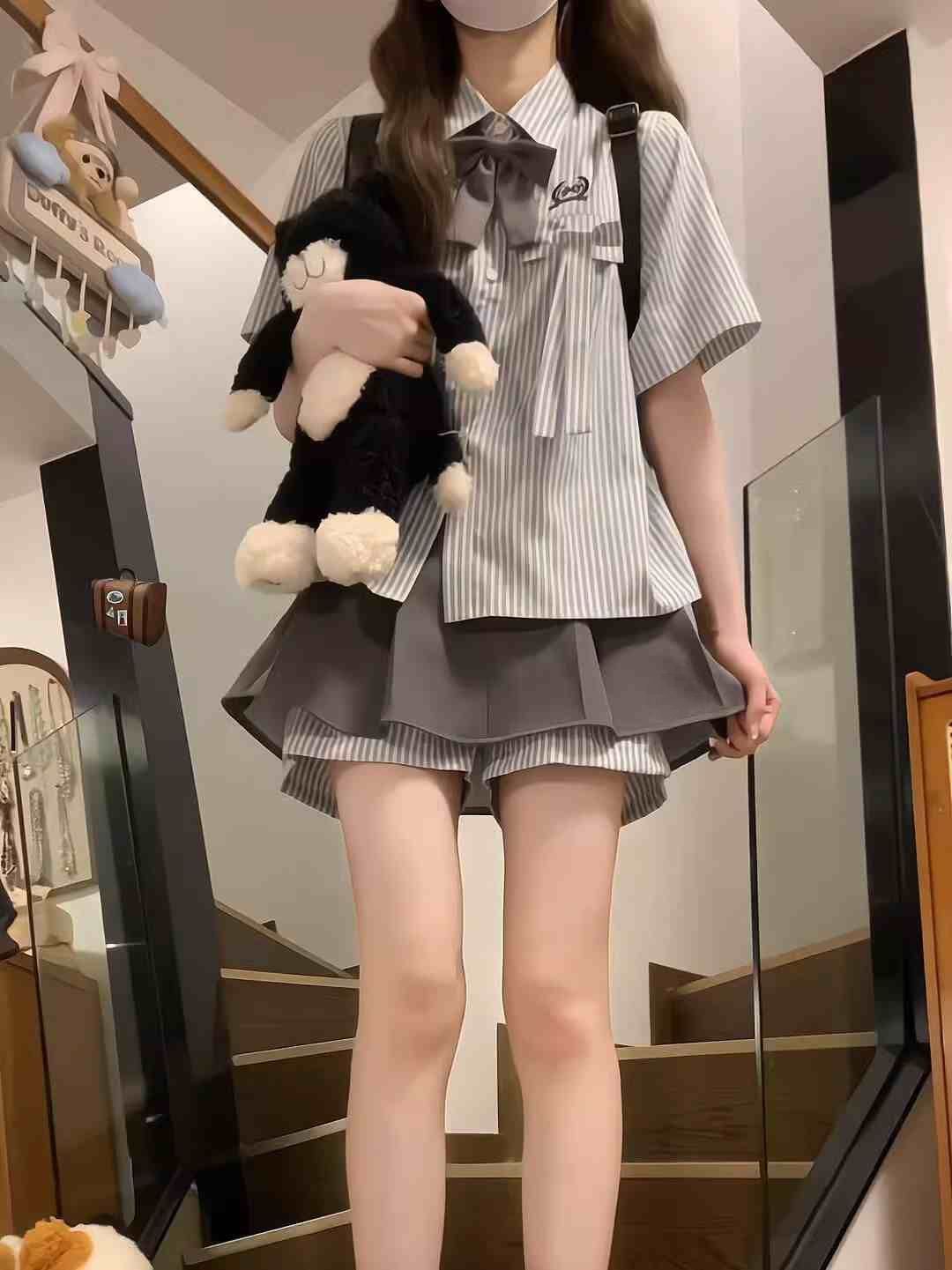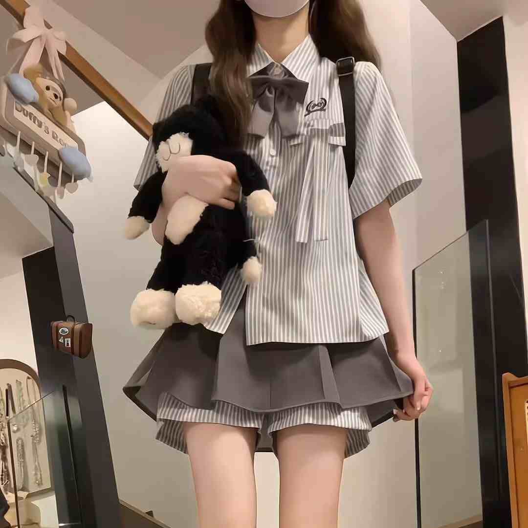 여름 여성을위한 한국 jk 유니폼 대학 스타일 짧은 치마 정장 작은 줄무늬 반팔 셔츠 스커트 투피스 세트스토어 가기