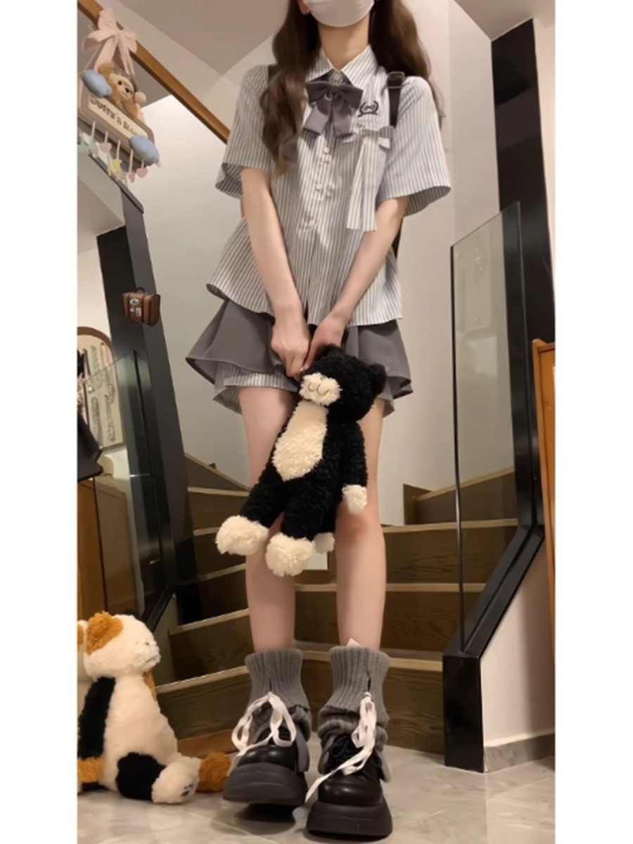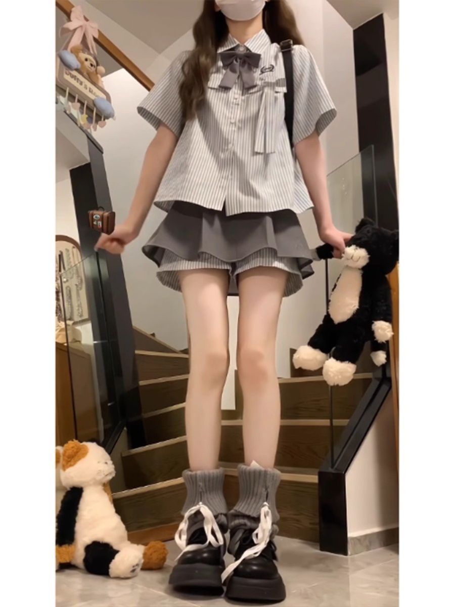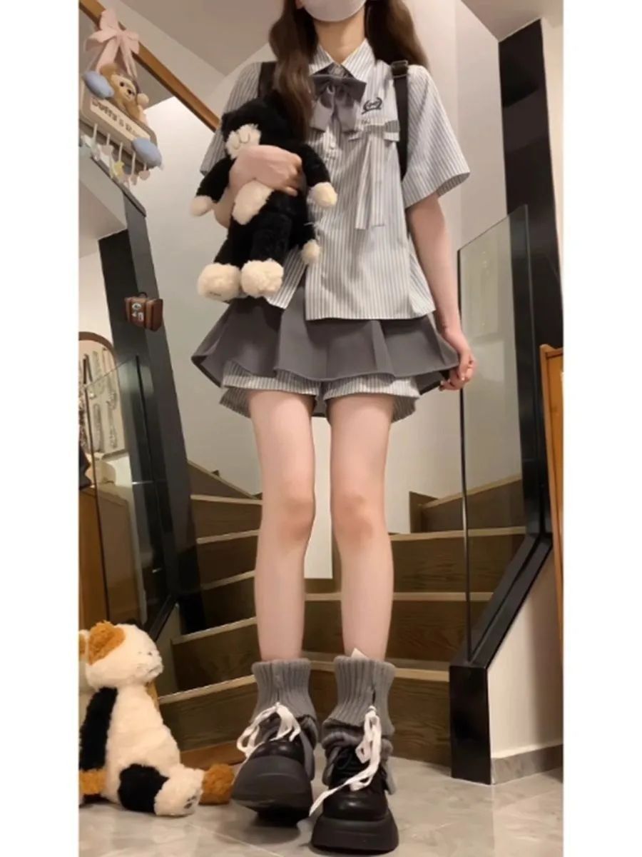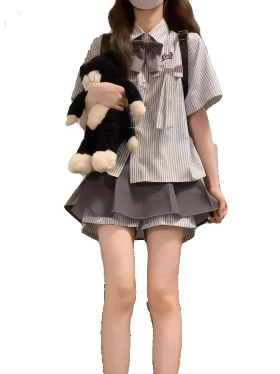 여름 여성을위한 한국 jk 유니폼 대학 스타일 짧은 치마 정장 작은 줄무늬 반팔 셔츠 스커트 투피스 세트