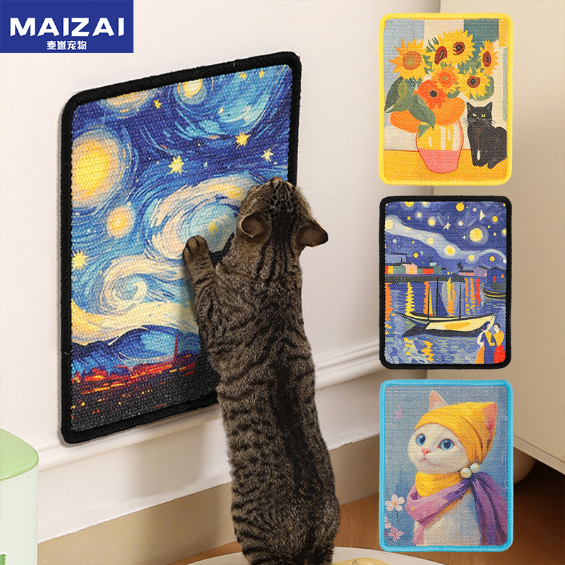 特点2:做成油画样式,图案丰富,使用的颜料也多为无毒环保型,对猫咪健康无危害,即是猫抓板也是墙面装饰,为家居增添色彩。