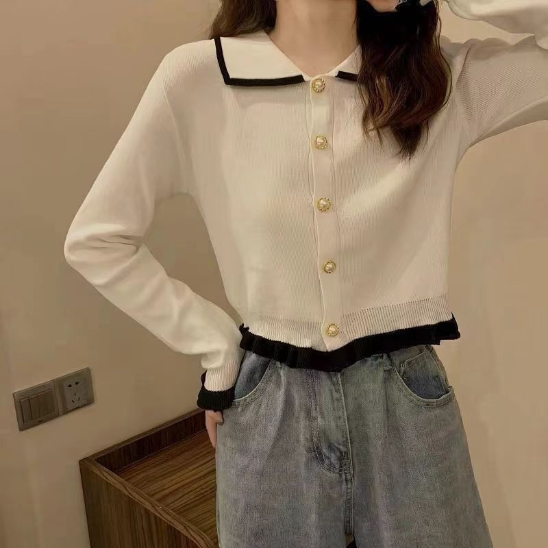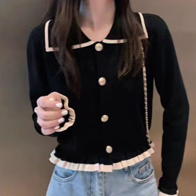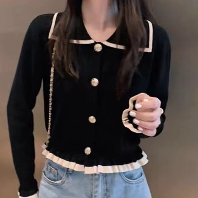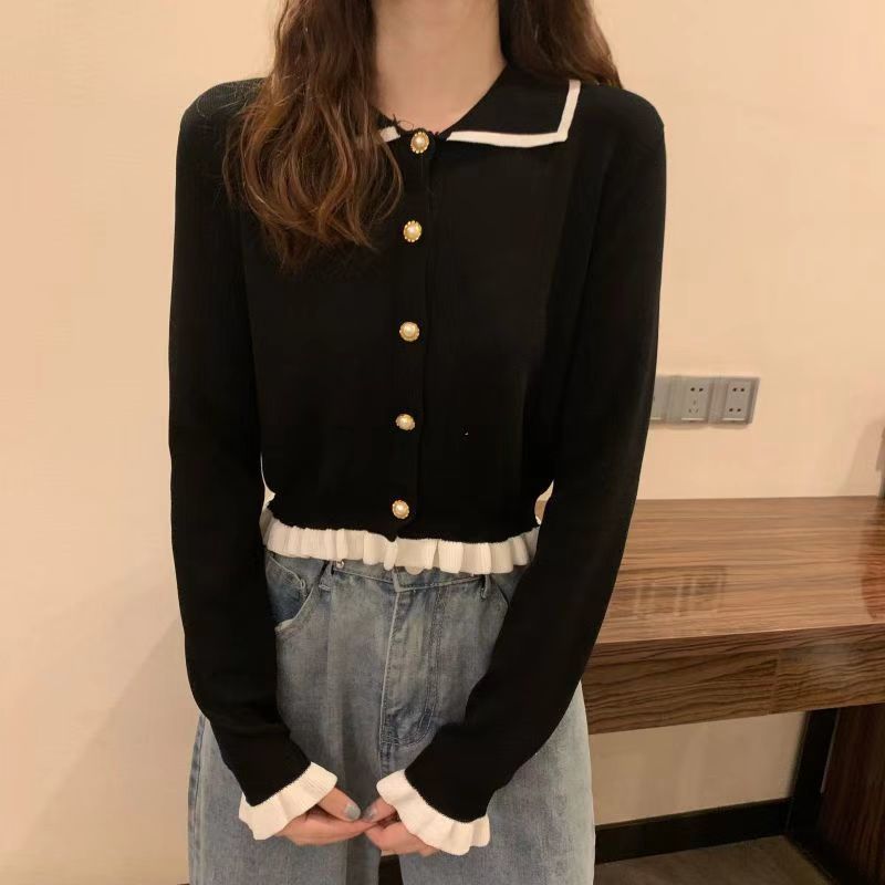 여성을 위한 프렌치 컬러 블록 라펠 니트 베이스 레이어, 봄, 가을 스타일의 짧은 스웨터 가디건 긴팔 탑스토어 가기