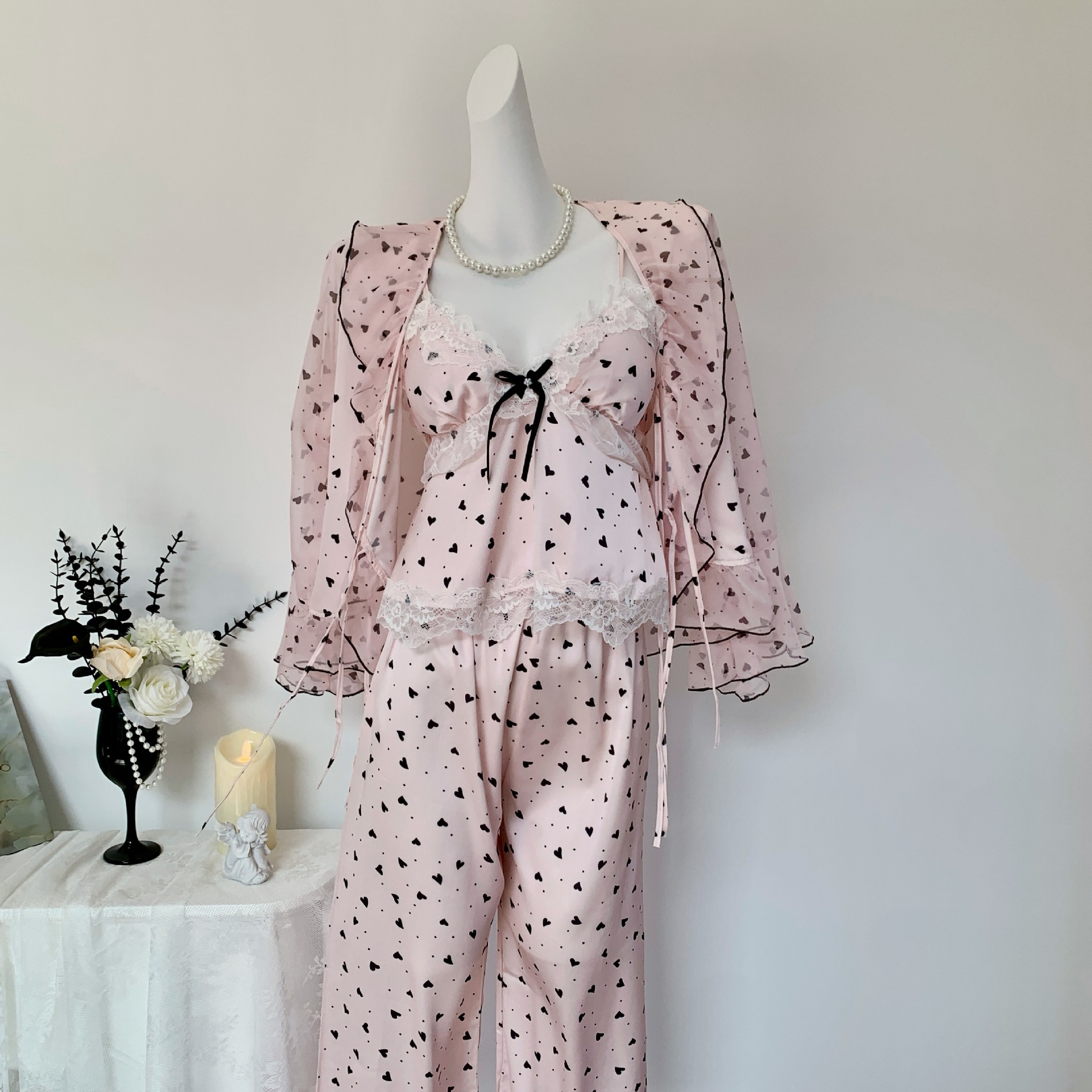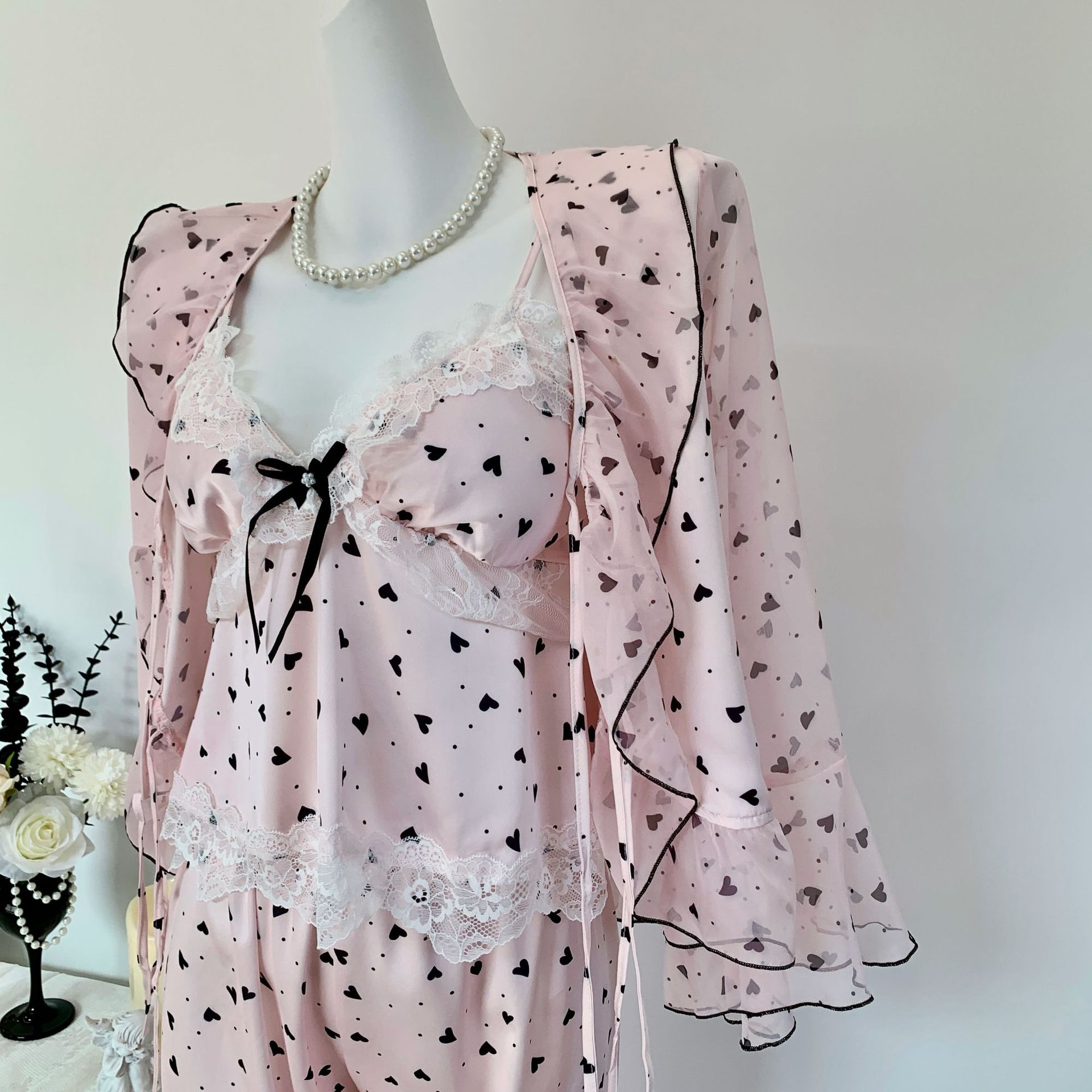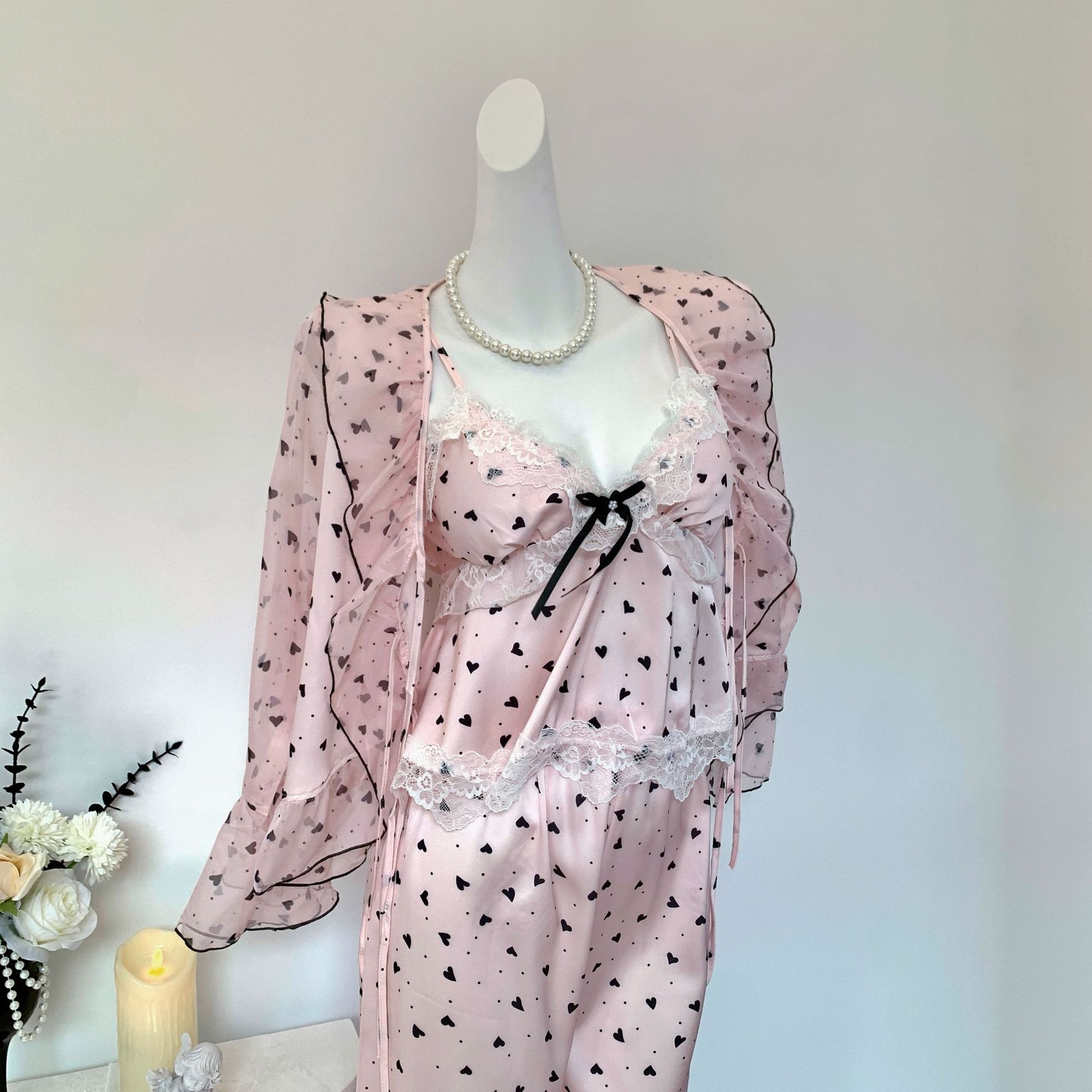 [Heartbeat Trap] 봄 여름 신상 얼음과 눈 실크 잠옷 순수한 욕망 달콤한 서스펜더 3피스 얇은 여성용 홈웨어