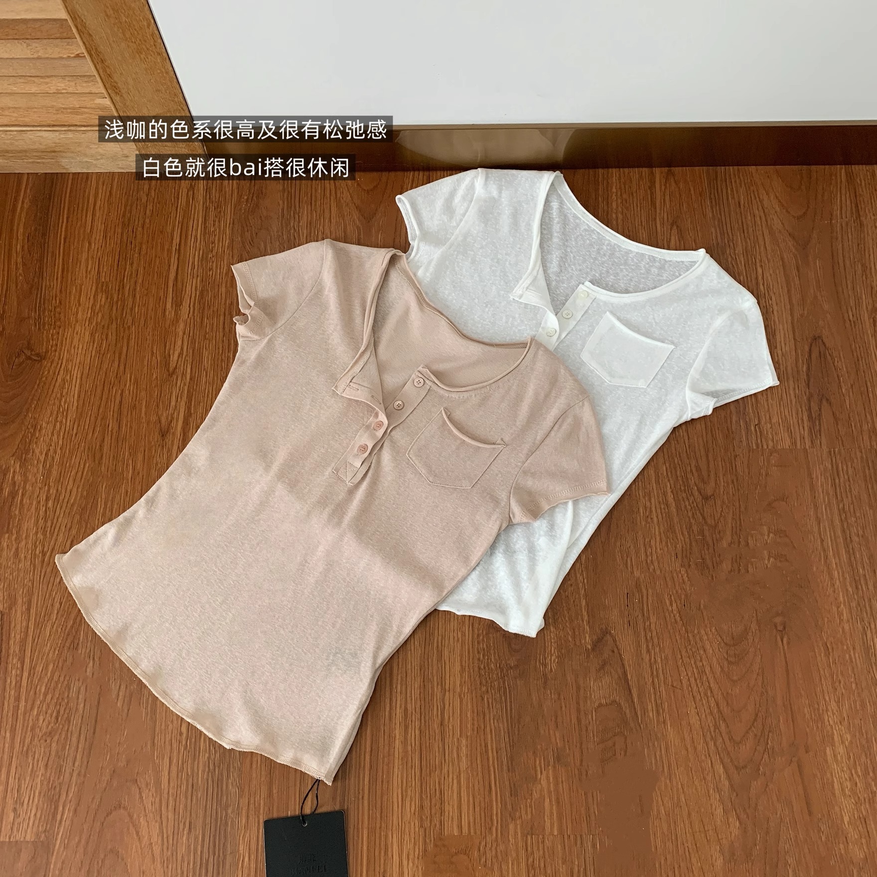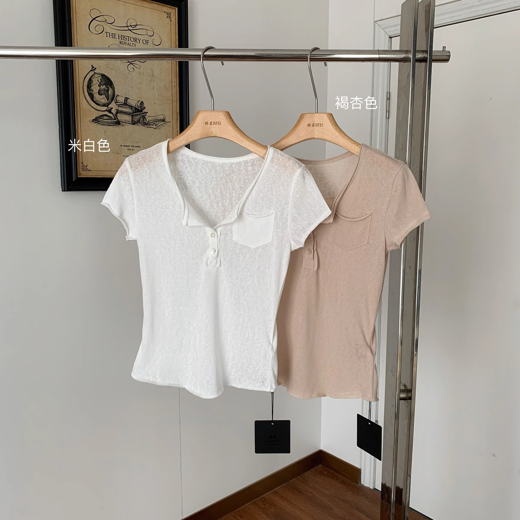 여성을위한 순수한 욕망 스타일 반팔 티셔츠 여름 2025 새로운 싱글 포켓 디자인 슬림 핫 소녀 흰색 티셔츠 탑스토어 가기