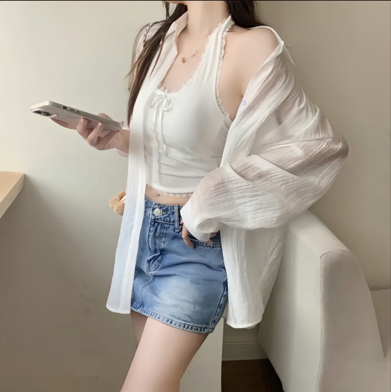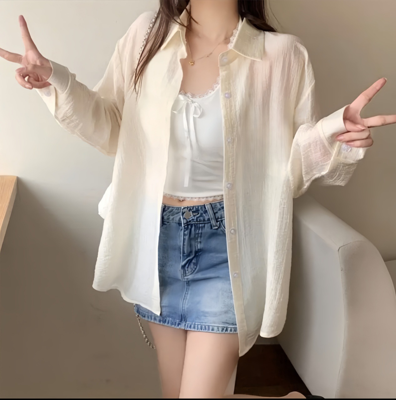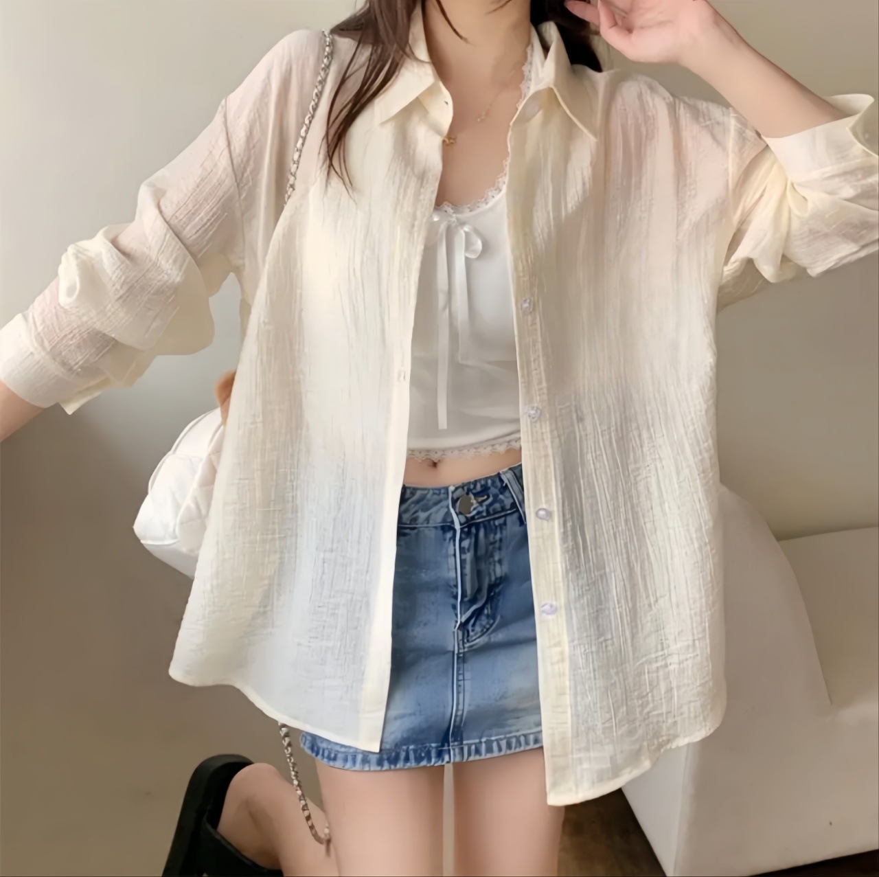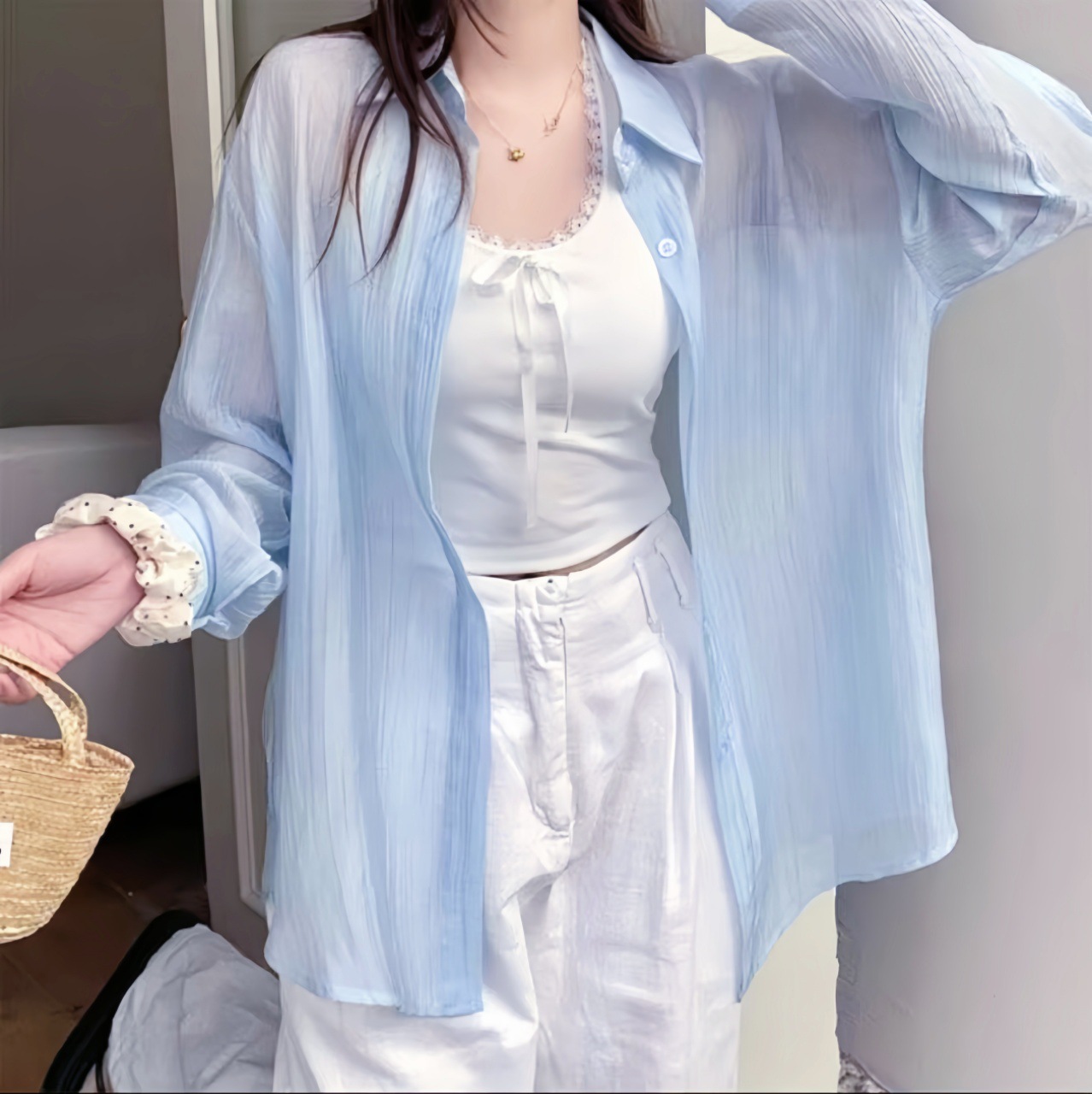 여성용 리오셀 텐셀 주름 자외선 차단 셔츠 여름 얇은 카디건 스몰 셔츠 레이지 스타일 다용도 탑