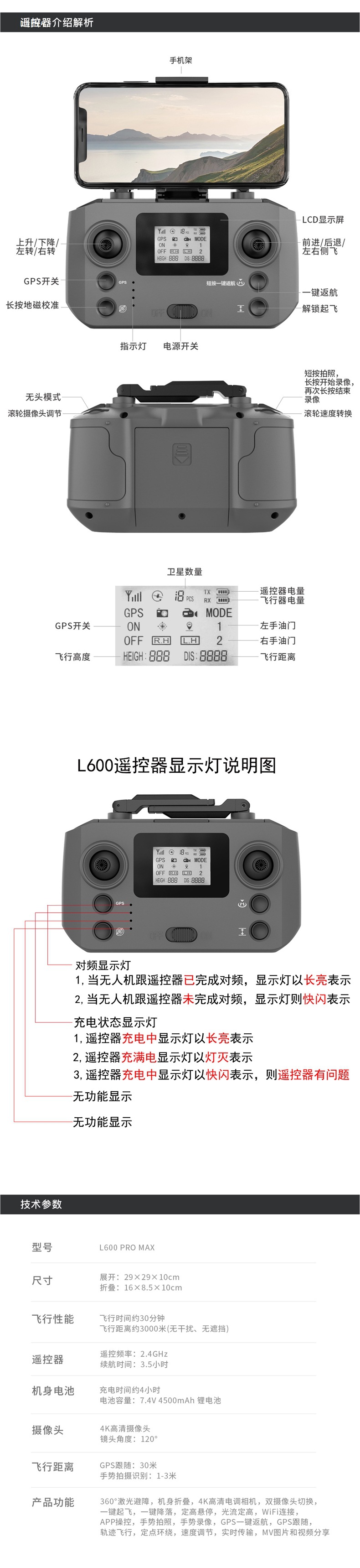 장애물 회피 기능이 있는 L600PROMAX 3축 기계식 짐벌 GPS 브러시리스 4K HD 항공 사진 접이식 원격 제어 드론