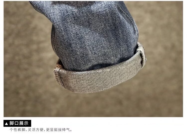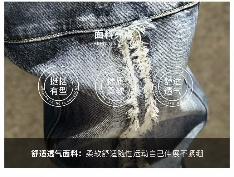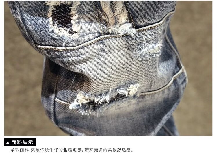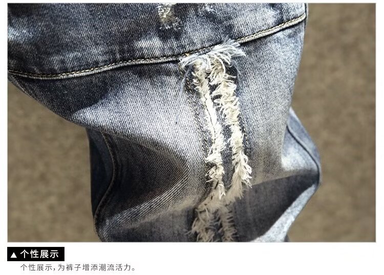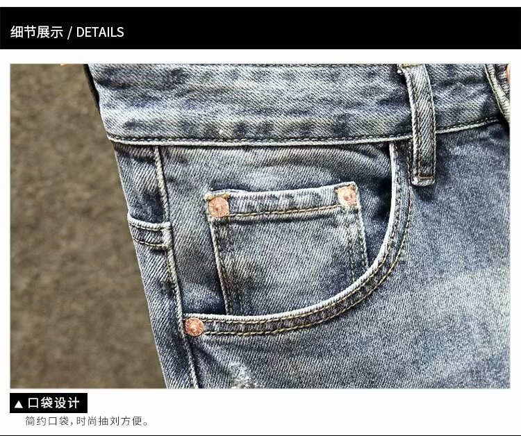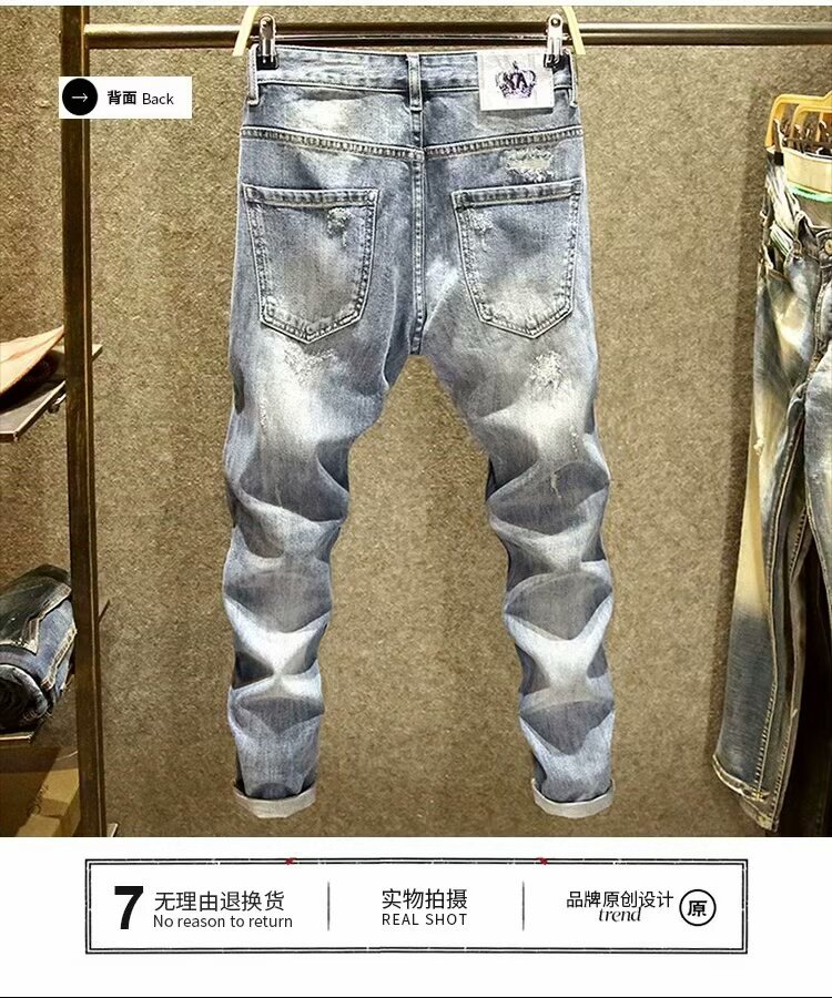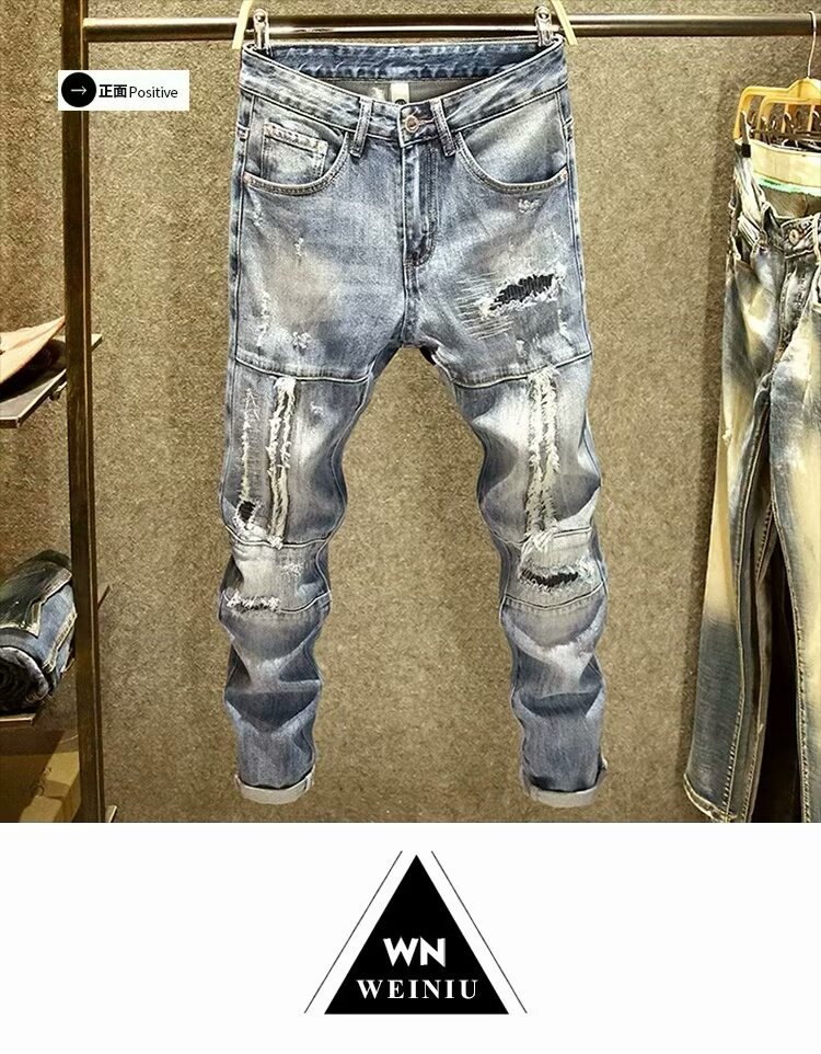 2025 봄 여름 스플라이스 찢어진 청바지 남성 슬림 스몰 스트레이트 블루 팬츠 패치워크 찢어진 로우 엣지 스크래치스토어 가기