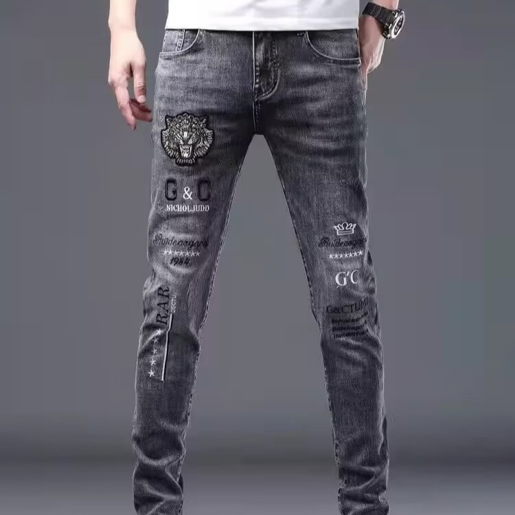 2025 봄 여름 스플라이스 찢어진 청바지 남성 슬림 스몰 스트레이트 블루 팬츠 패치워크 찢어진 로우 엣지 스크래치