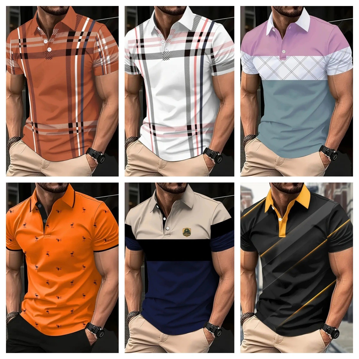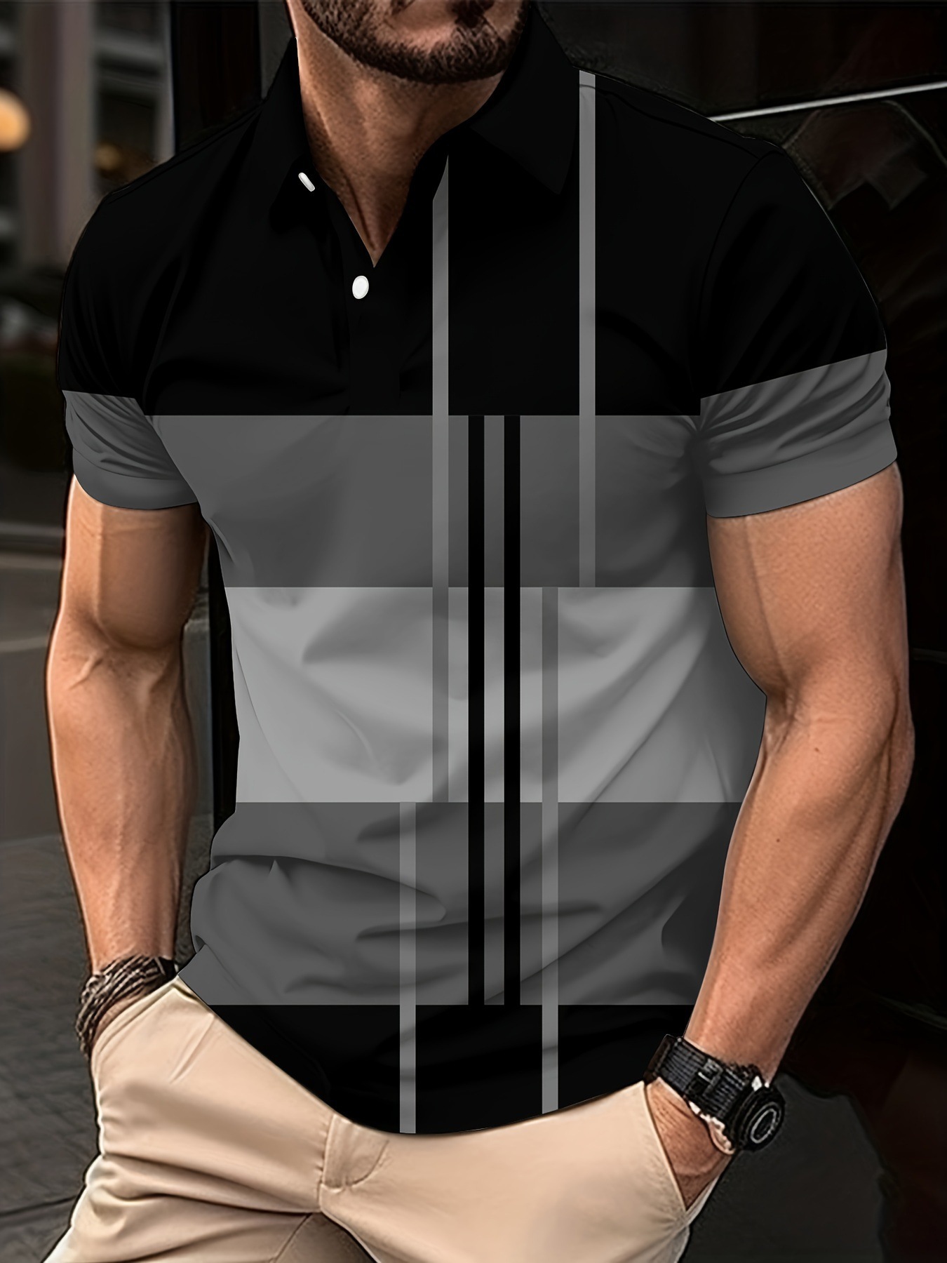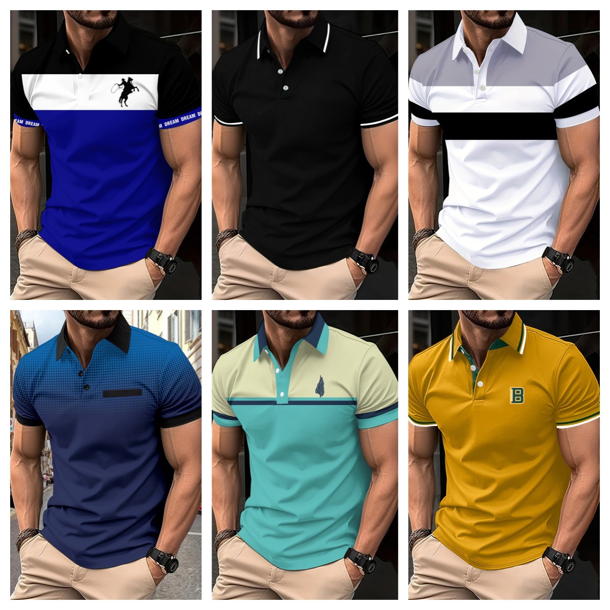 2025 유럽 및 미국 국경 간 독립 스테이션 여름 남성 컬러 블록 3D 프린트 반소매 버튼 라펠 캐주얼 폴로 셔츠 없음