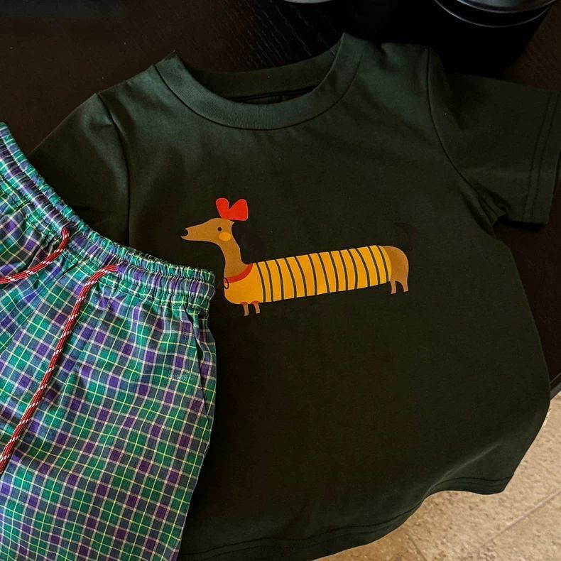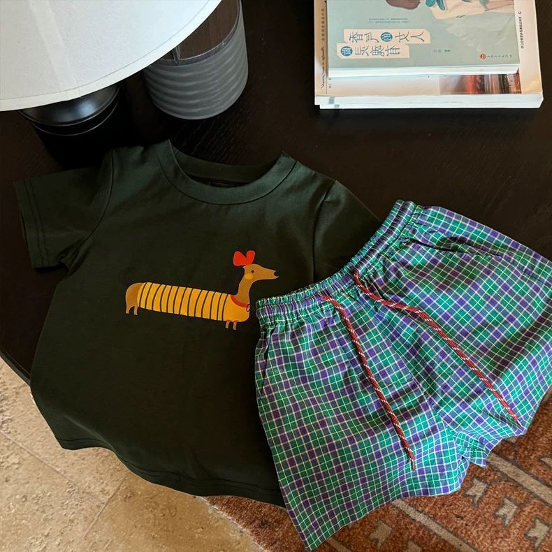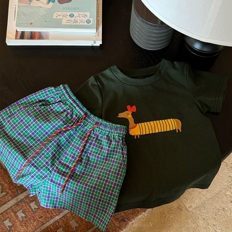 한국 아동복 소년 여름 정장 세련되고 다재다능한 얇은 격자 무늬 반바지 반팔 티셔츠 투피스 세트 t0153A049