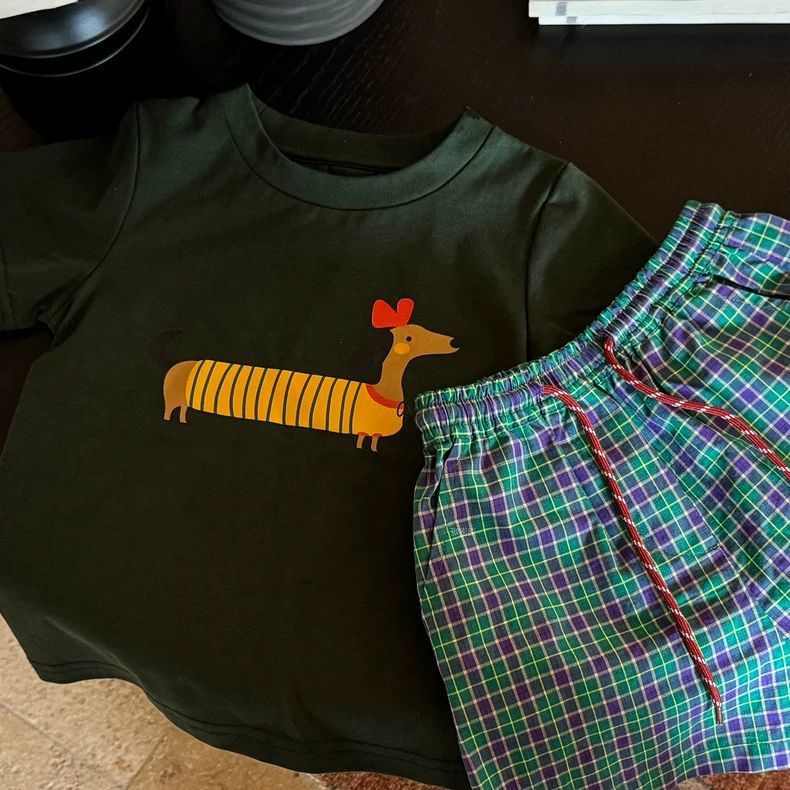 한국 아동복 소년 여름 정장 세련되고 다재다능한 얇은 격자 무늬 반바지 반팔 티셔츠 투피스 세트 t0153A049스토어 가기