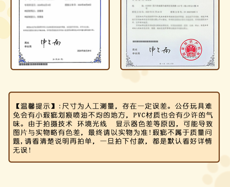 【温馨提示】:尺寸为人工测量,存在一定误差。公仔玩具难免会有小瑕疵划痕喷油不均的地方,PVC材质也会有少许的气味。由于拍摄技术/环境光线/显示器色差等原因,可能导致图片与实物略有色差,最终请以实物为准!