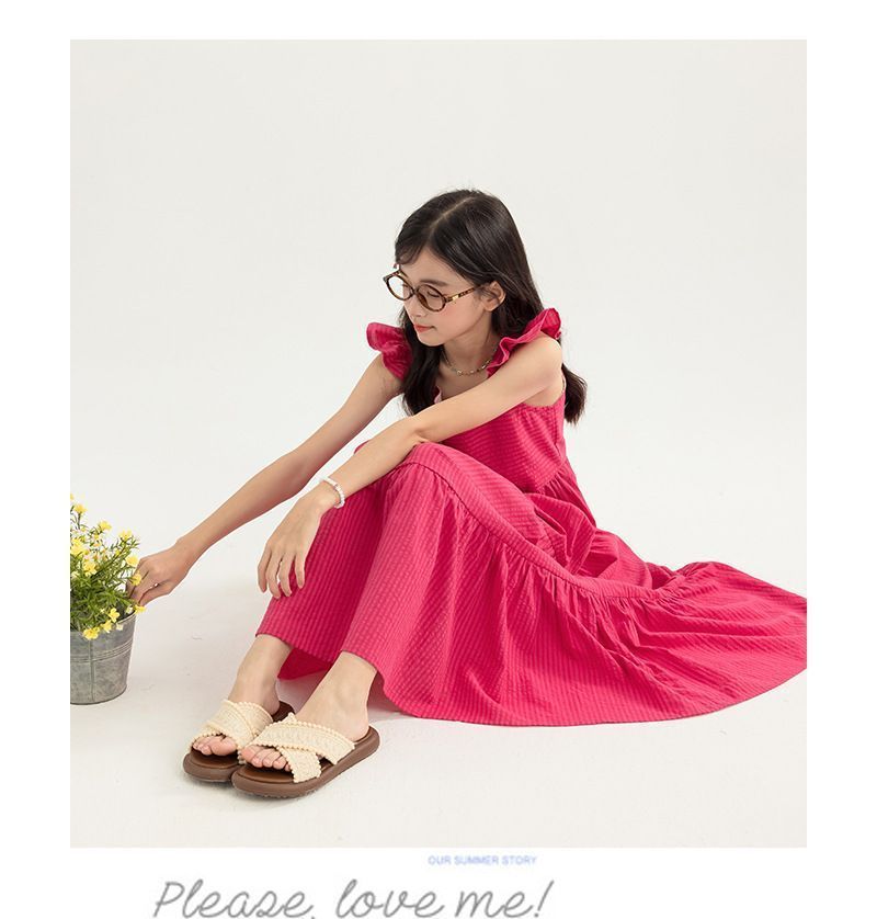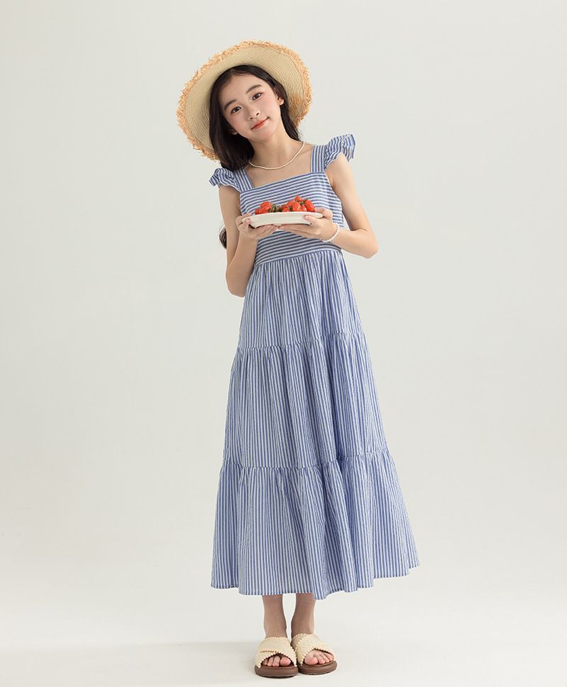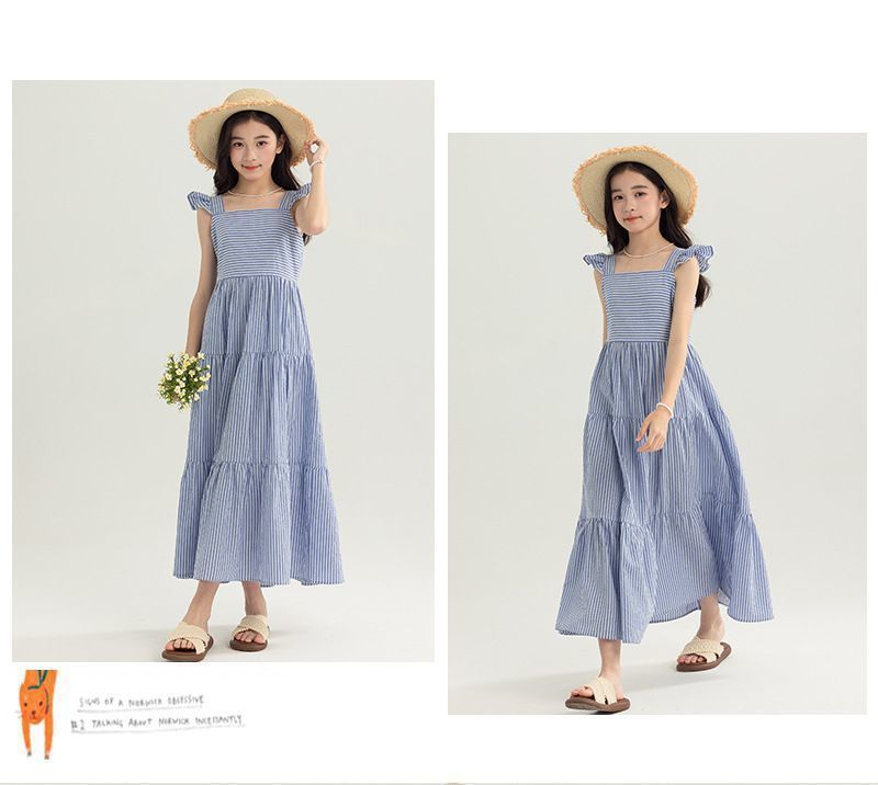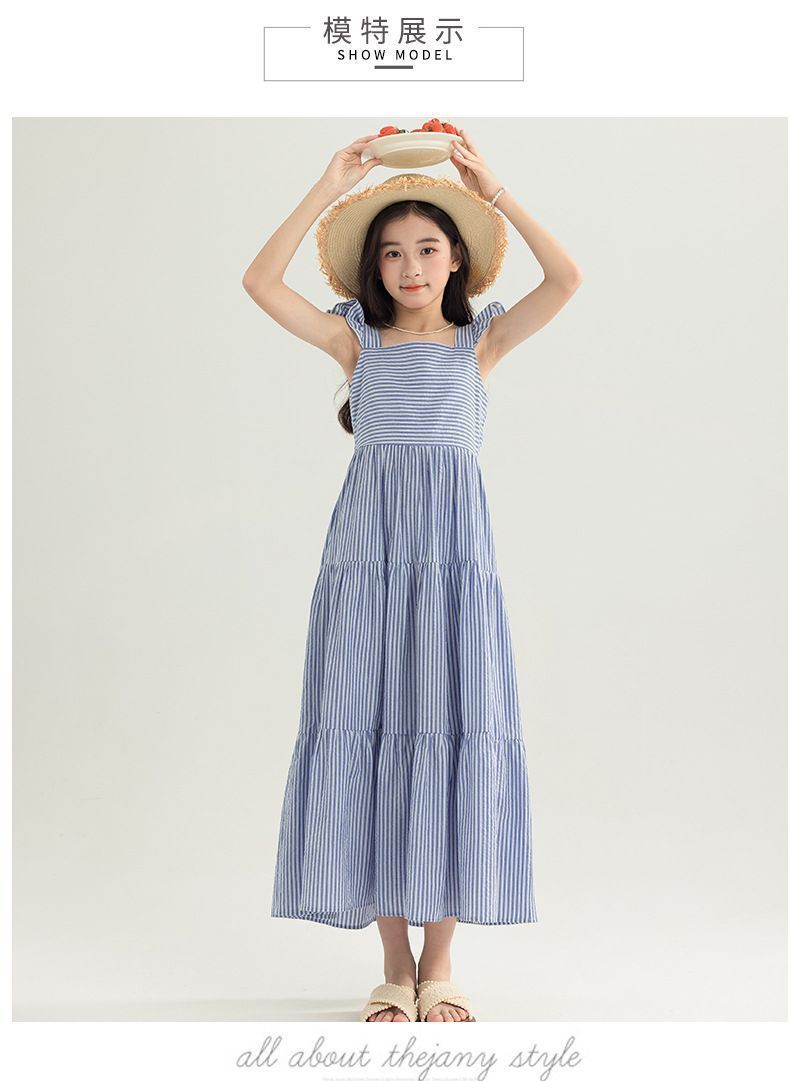 아동복 2025 여름 한국 스타일 여아 패션 스트라이프 드레스, 롱 스커트, 중대형 아동 조끼 드레스, 비치 스커트스토어 가기