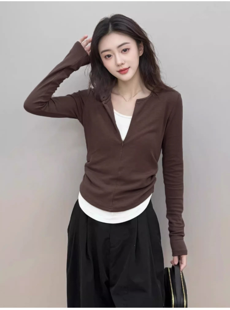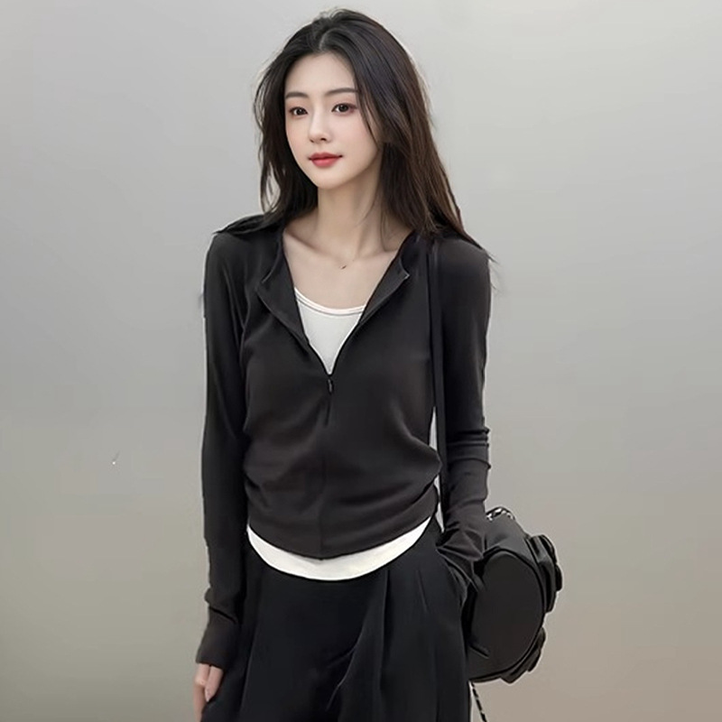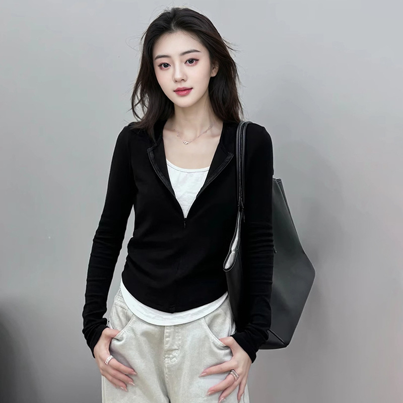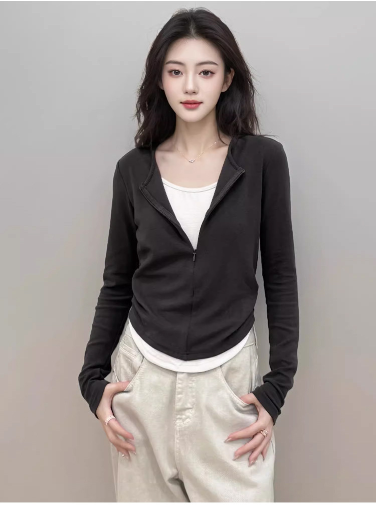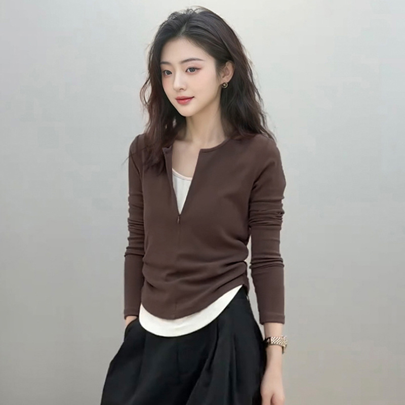 봄 가을 신상 한국 스타일 슬림핏 긴팔 디자인 티셔츠 여성용 지퍼 디자인 투피스 스타일 상의스토어 가기
