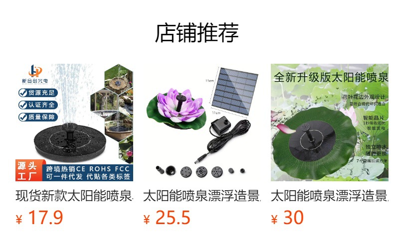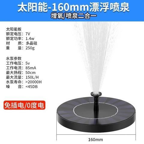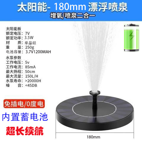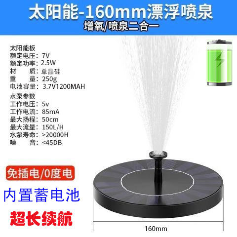 太阳能喷泉是利用太阳能驱动水泵抽水的景观性喷泉装置。本产品采用高效太阳能电池板以及新型无刷水泵,具有启动快、效率高、稳定性强的优点。此外,产品漂浮在水面上,无需外接电源,安装方便、操作简单。广泛应用于适用于花园装饰、鸟澡盆、小池塘水体循环增氧、假山喷泉等场所。安装简单,使用方便,只要有直射阳光,水泵就能启动工作。