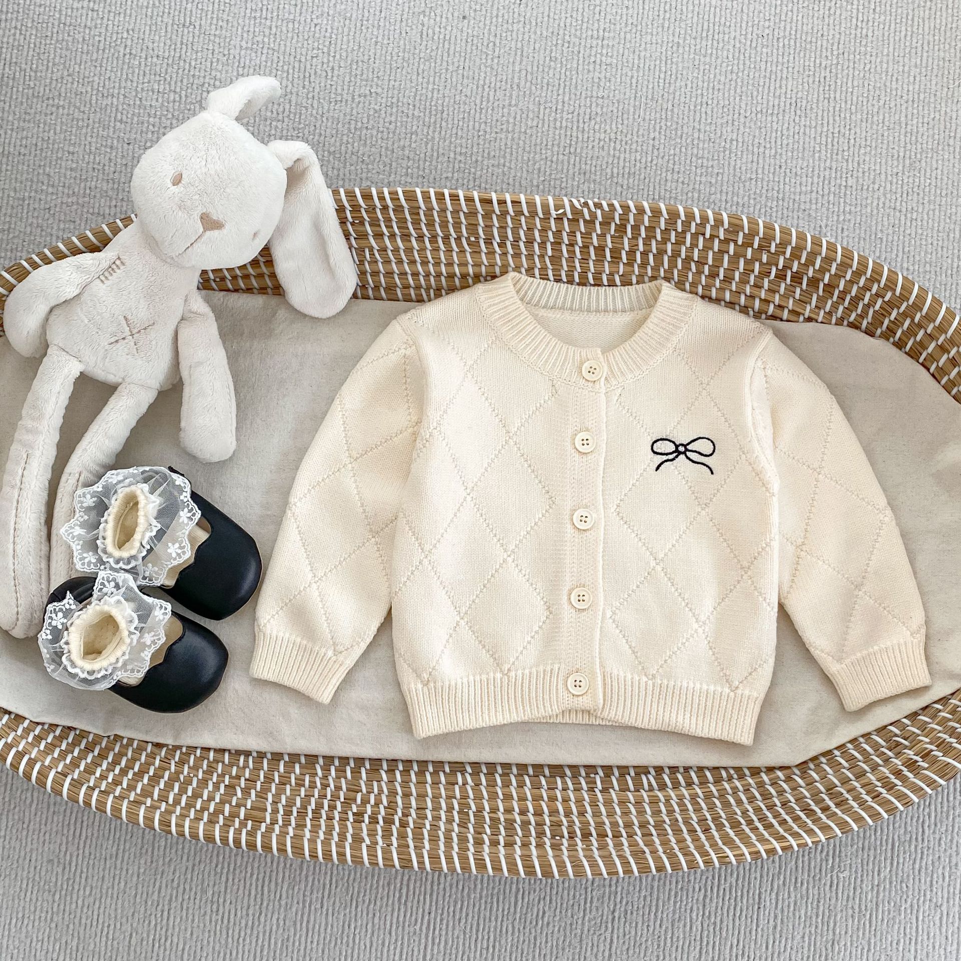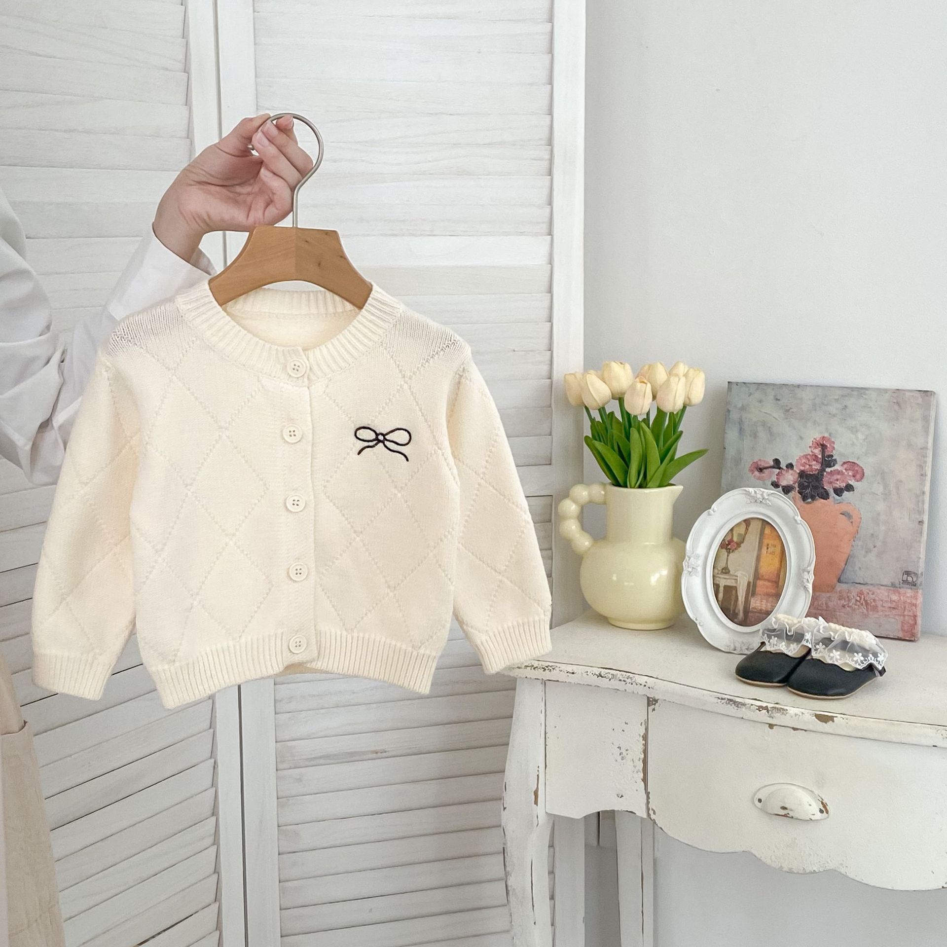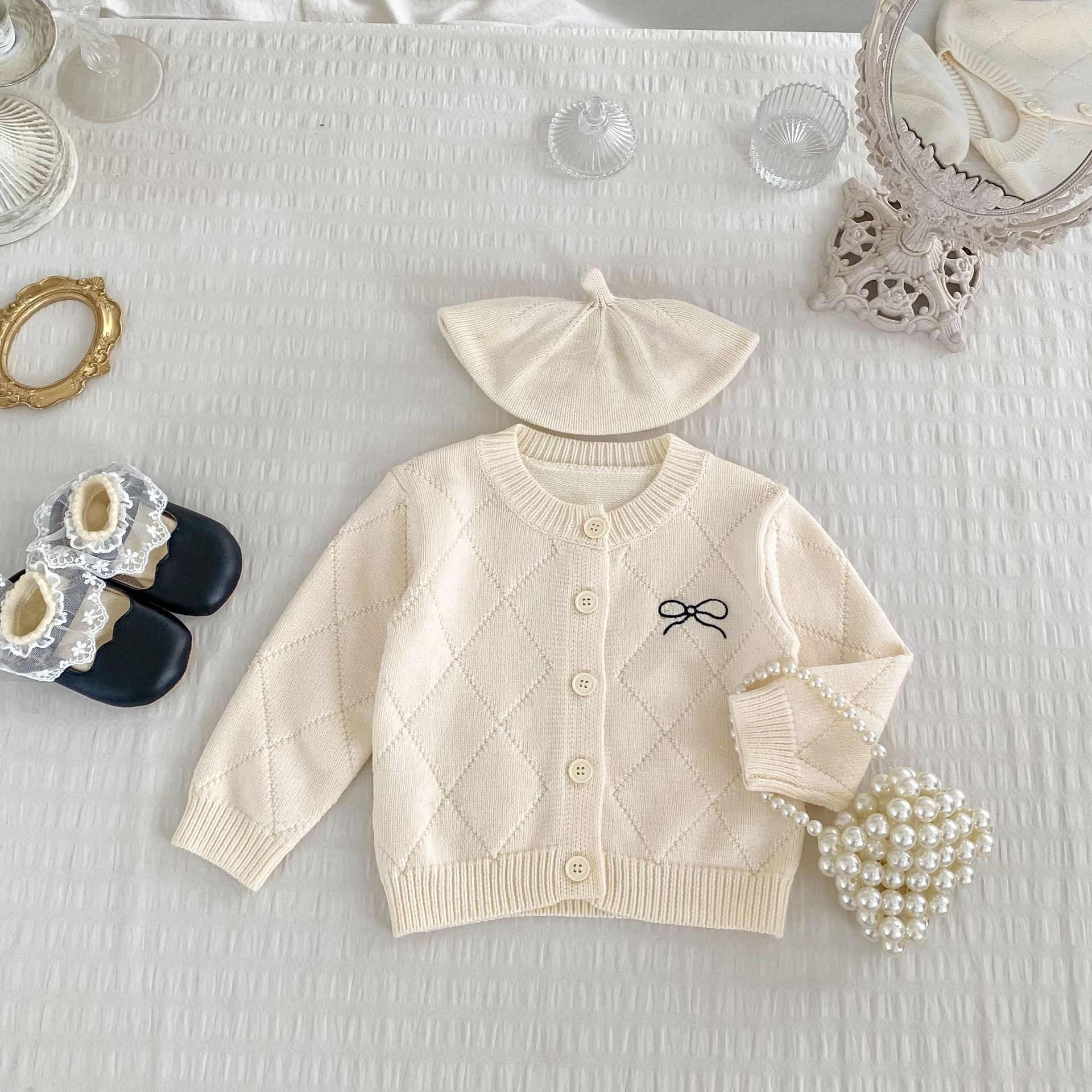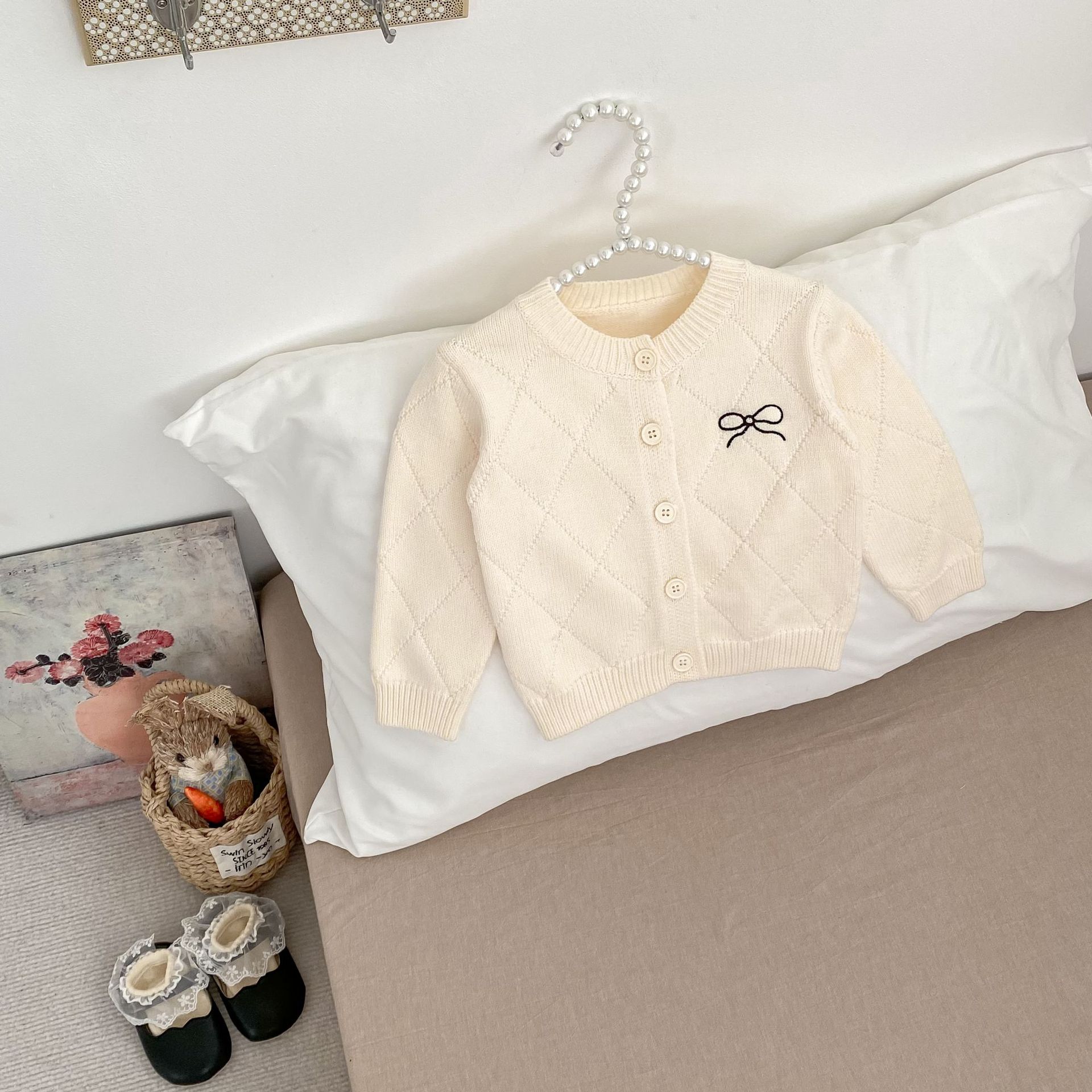 2026 봄 신상 아기 니트 코트, 여아용 세련된 리본 스웨터 가디건과 플레어 팬츠 투피스 세트스토어 가기