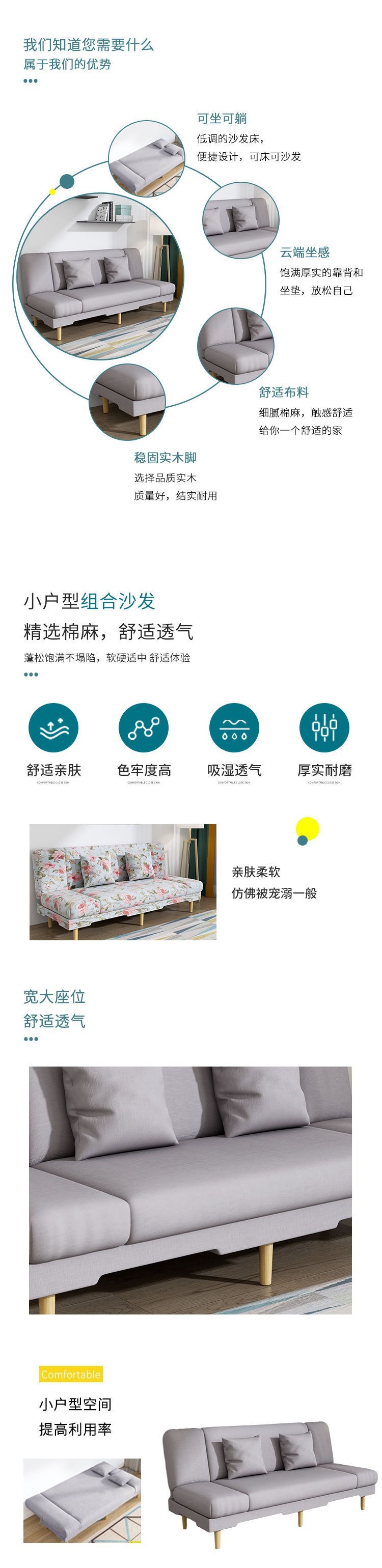 소형 아파트용 2인용 다기능 접이식 거실 패브릭 소파베드, 간편한 라운지 소파베드