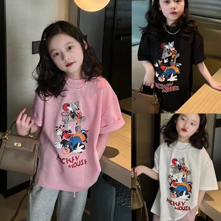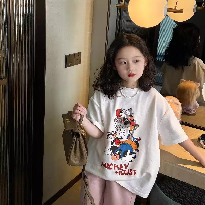 한국 여자 반팔 티셔츠 순면 여름 옷, 패셔너블하고 세련된 중대형 어린이 신생아 만화 프린트 티셔츠 캐주얼스토어 가기