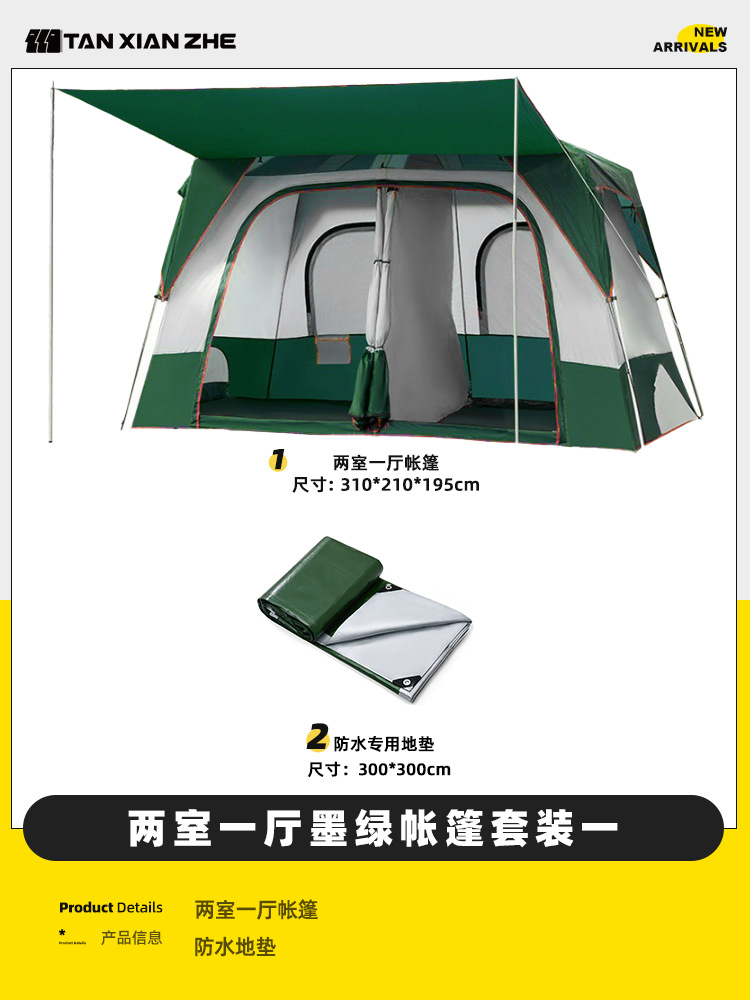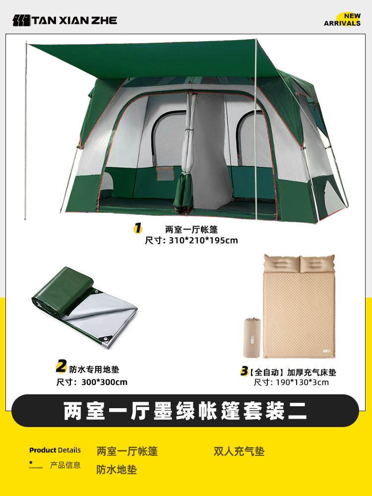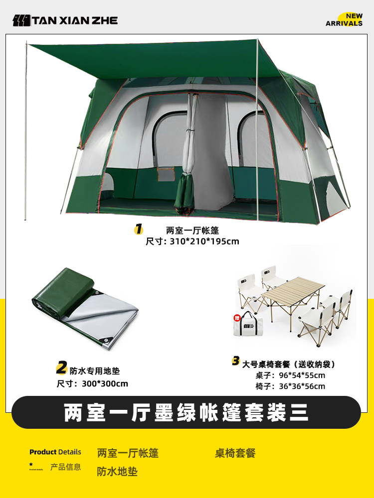 • 침실 2개와 거실 1개 짙은 녹색 텐트 세트 1개