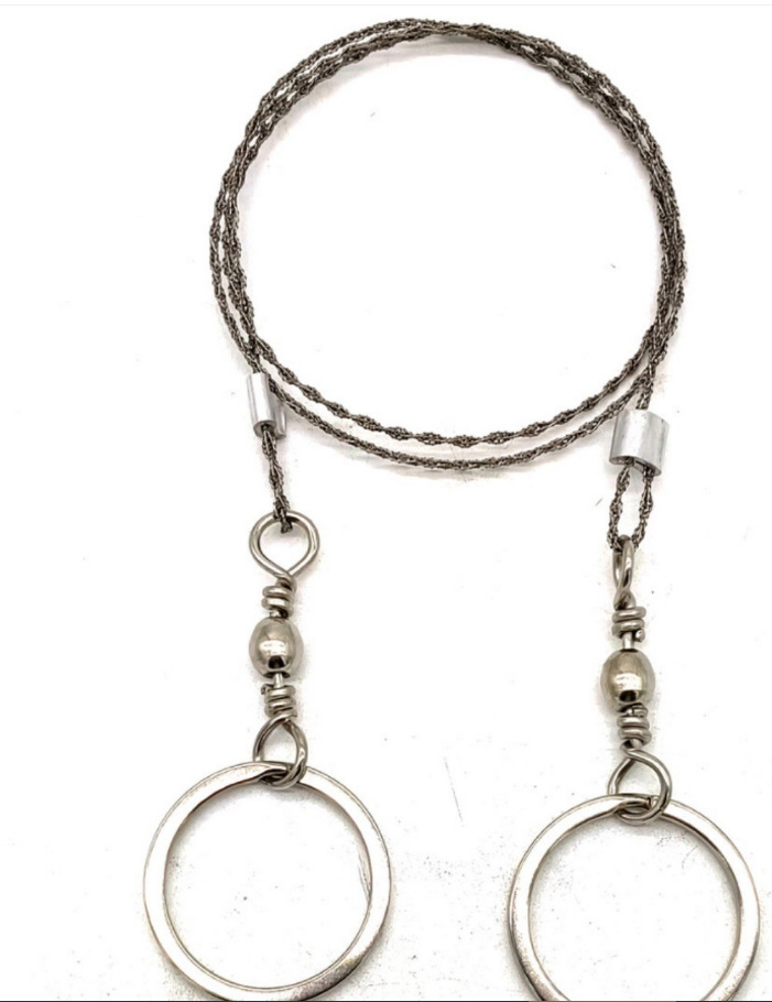 线锯,又称口袋锯,是野营装备中的一件重要物品,选用优质高强度拉伸的不锈钢丝制成。它是由细小的钢丝缠绕较粗的钢丝形成丝绕丝式锯齿,再由四股丝绕丝制成锯锋,具有锯齿锋利而又平滑不伤手的特点。可以从任意方向锯断树枝、木头、塑料、橡胶、骨头、软金属等,操作方便,容易携带,不伤手和衣物,使用寿命长。选用不锈钢材料制作,无须特别保养,用完后擦干净并保持干燥即可。