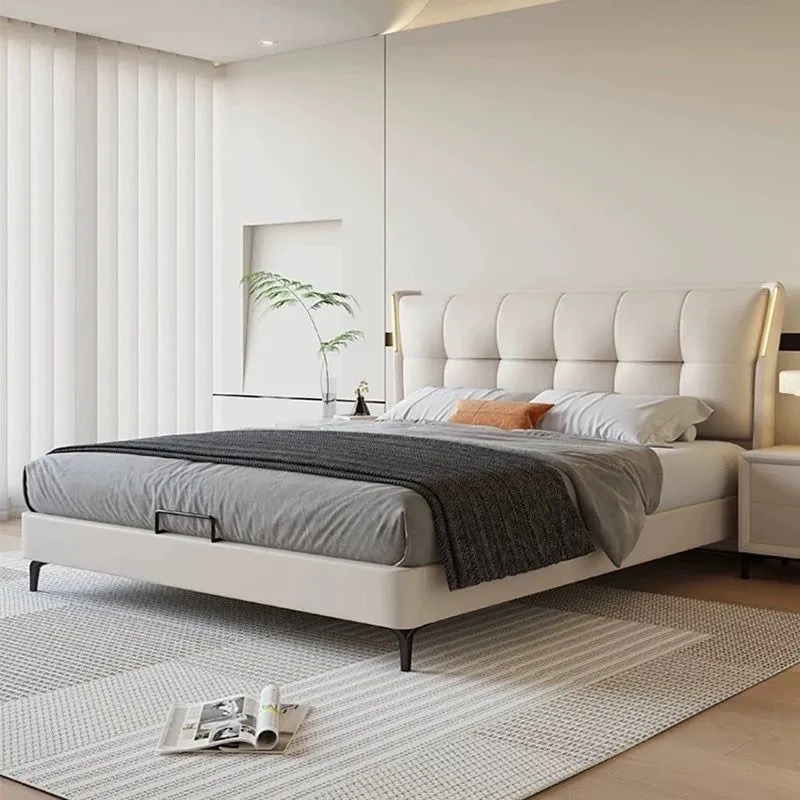 북유럽 가벼운 고급 가죽 침대, 현대적이고 심플한 마스터 침실 더블 침대, 고급스럽고 분위기 있는 가정용 부드러운 패키지 단단한 나무 대형 침대 웨딩 침대