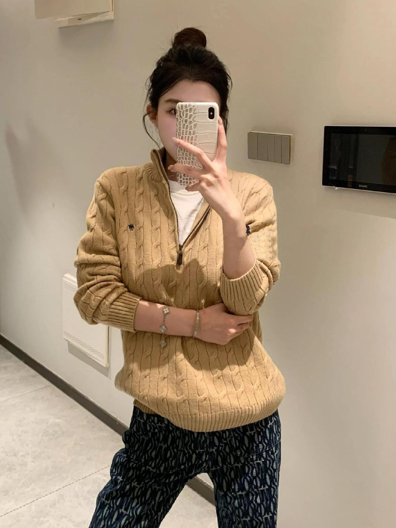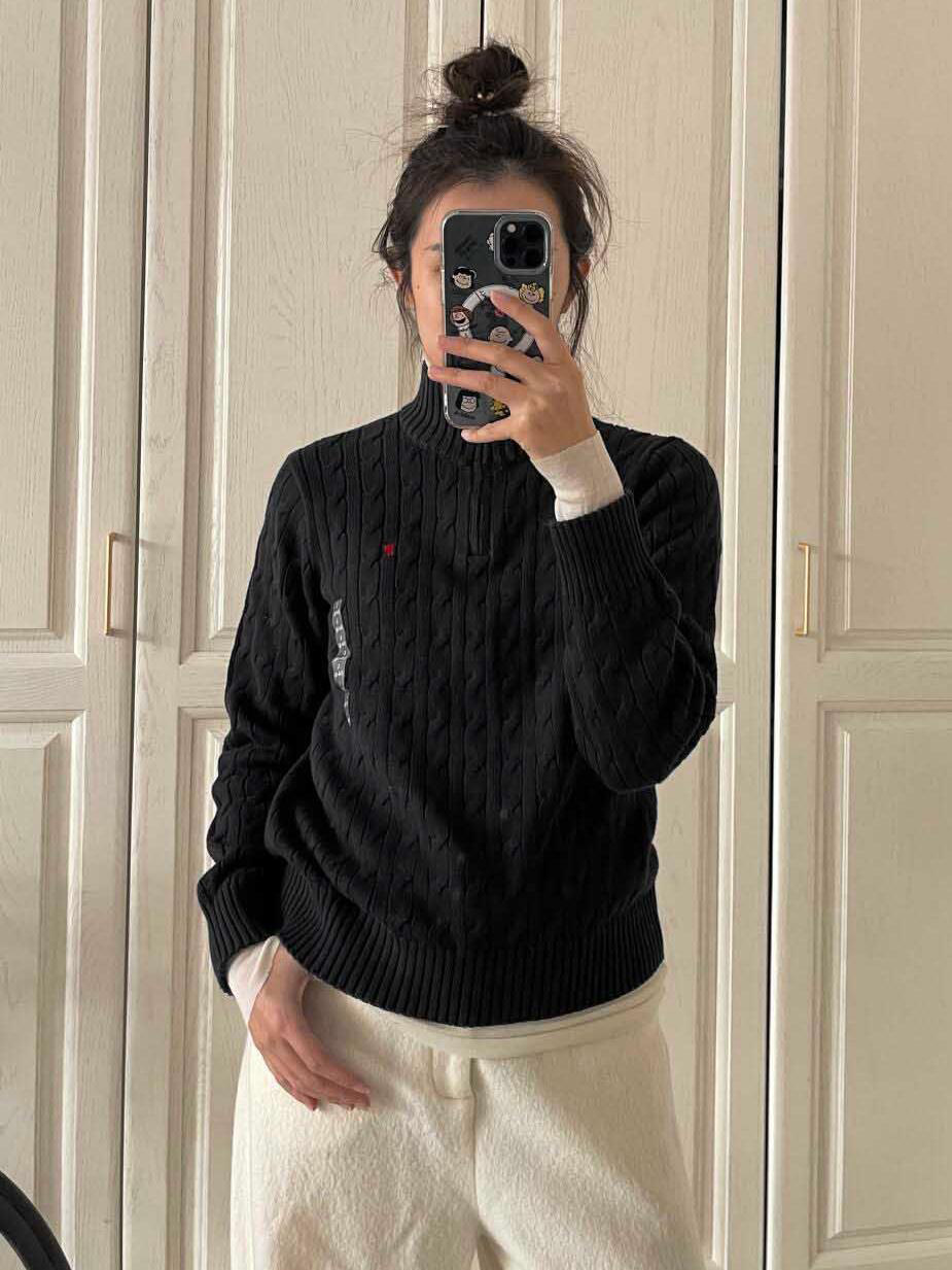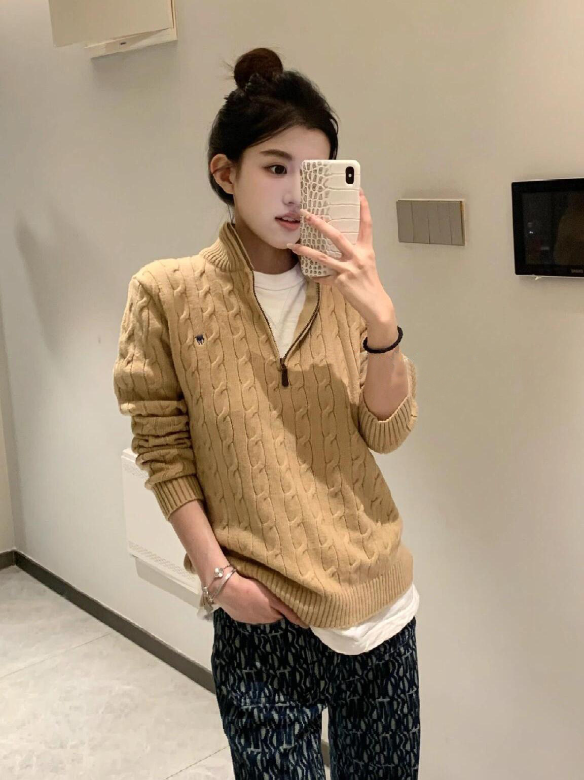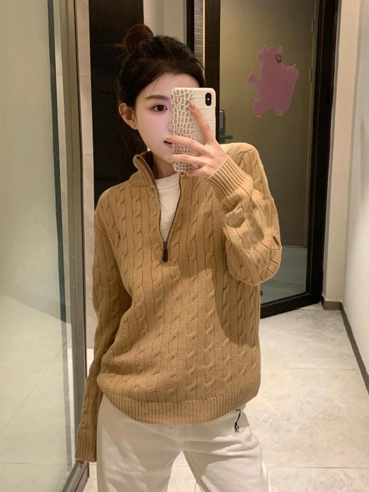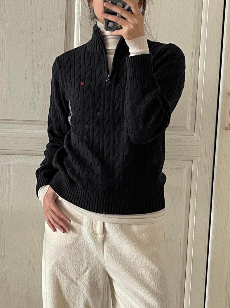 아메리칸 레트로 올드 머니 스타일 포니 가을 소녀 스타일 스탠드 칼라 하프 지퍼 스웨터 트위스트 탑 커플 스웨터스토어 가기