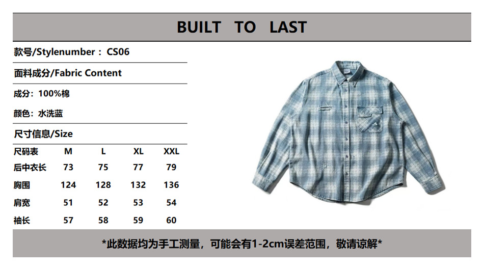 BUILTTOLAST 레트로 워싱 찢어진 데님 셔츠 남성용 루즈 트렌디 긴팔 체크 무늬 셔츠 CS06