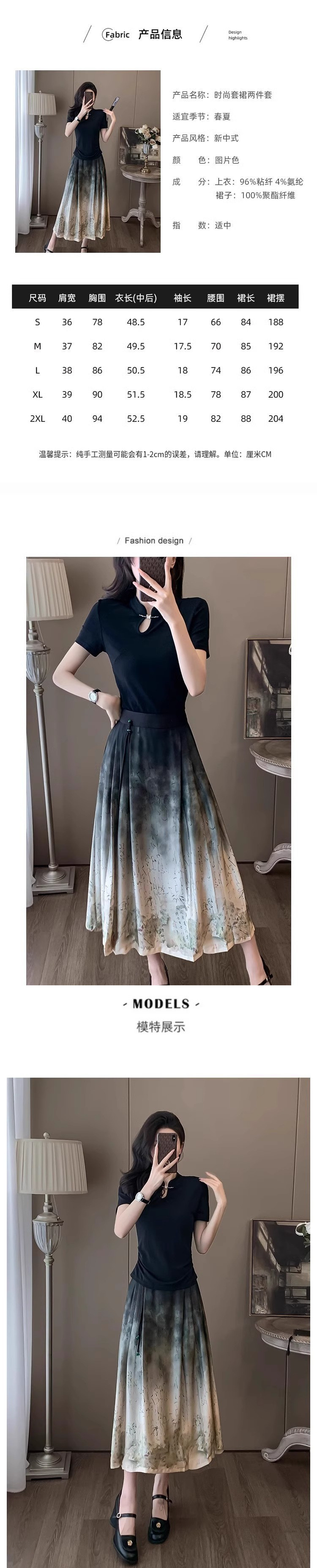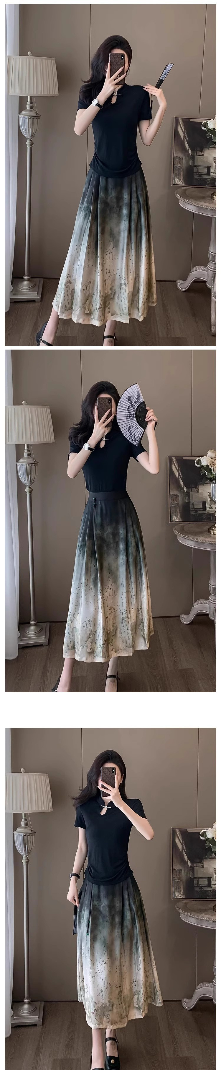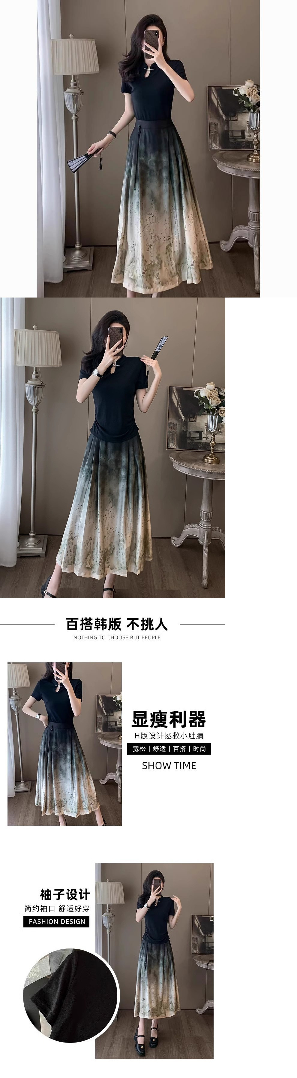 2024년 여름 신작 티셔츠 캐주얼 신상 중국 잉크 말 얼굴 정장 스커트 여성 스커트 패션 투피스 세트스토어 가기