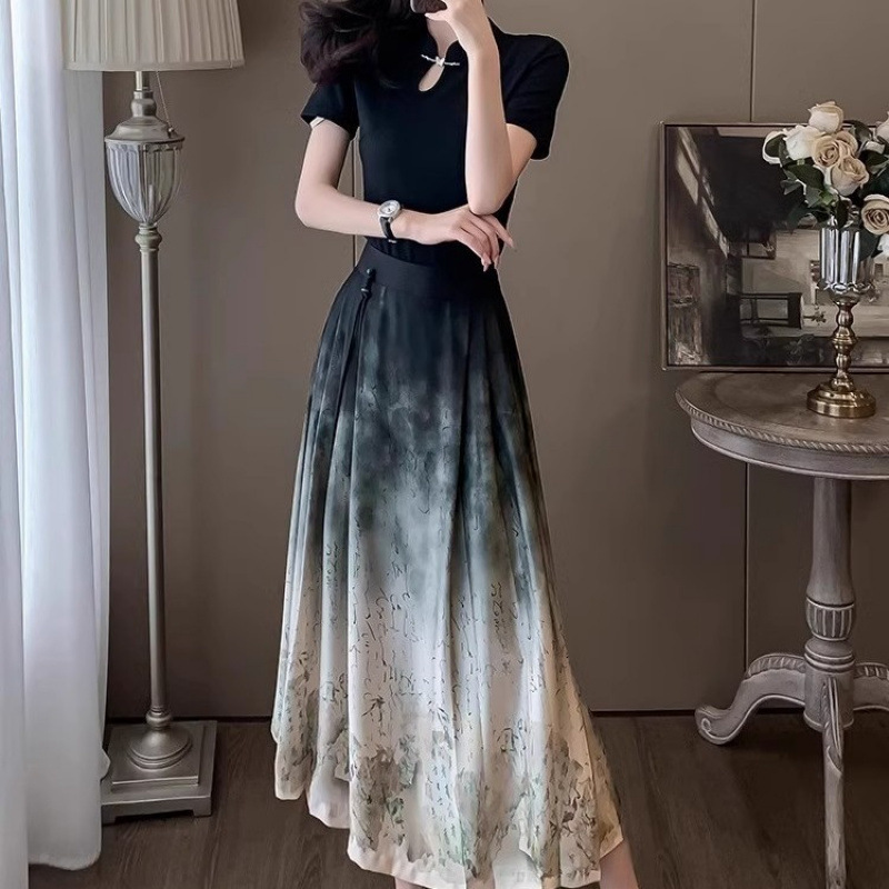 2024년 여름 신작 티셔츠 캐주얼 신상 중국 잉크 말 얼굴 정장 스커트 여성 스커트 패션 투피스 세트