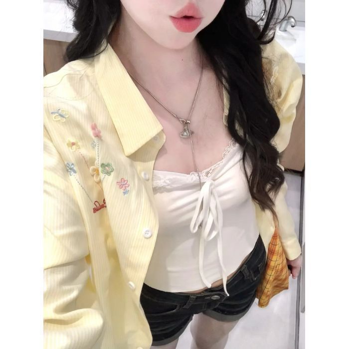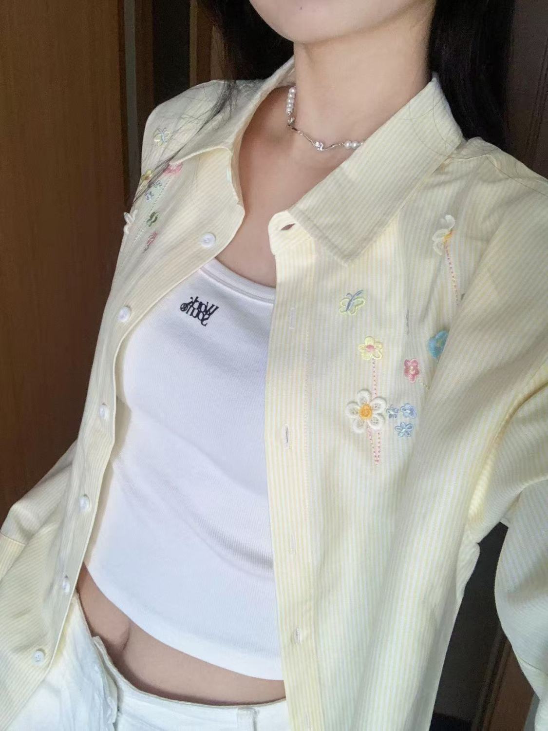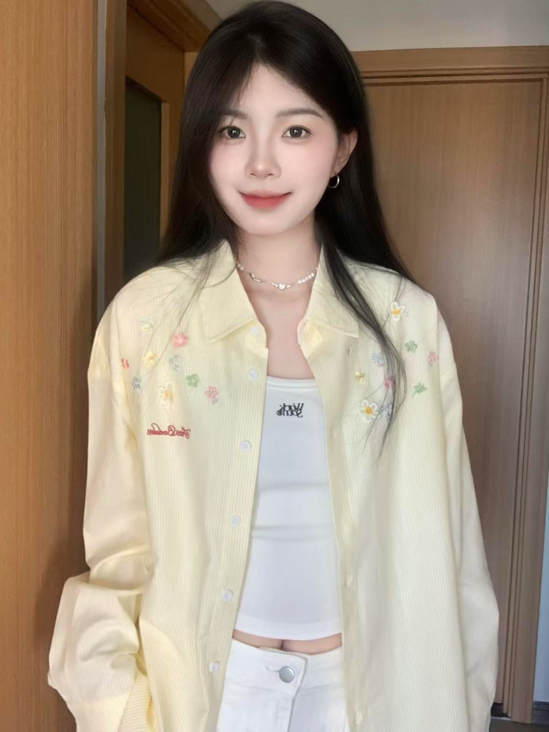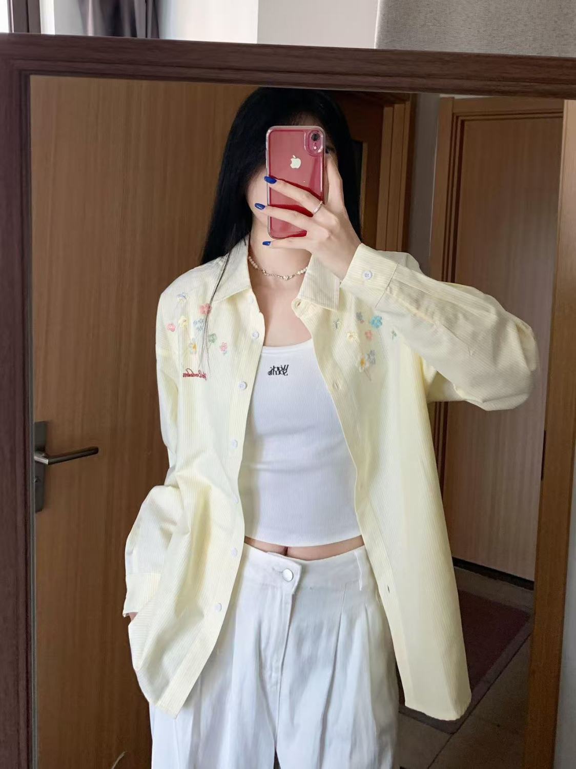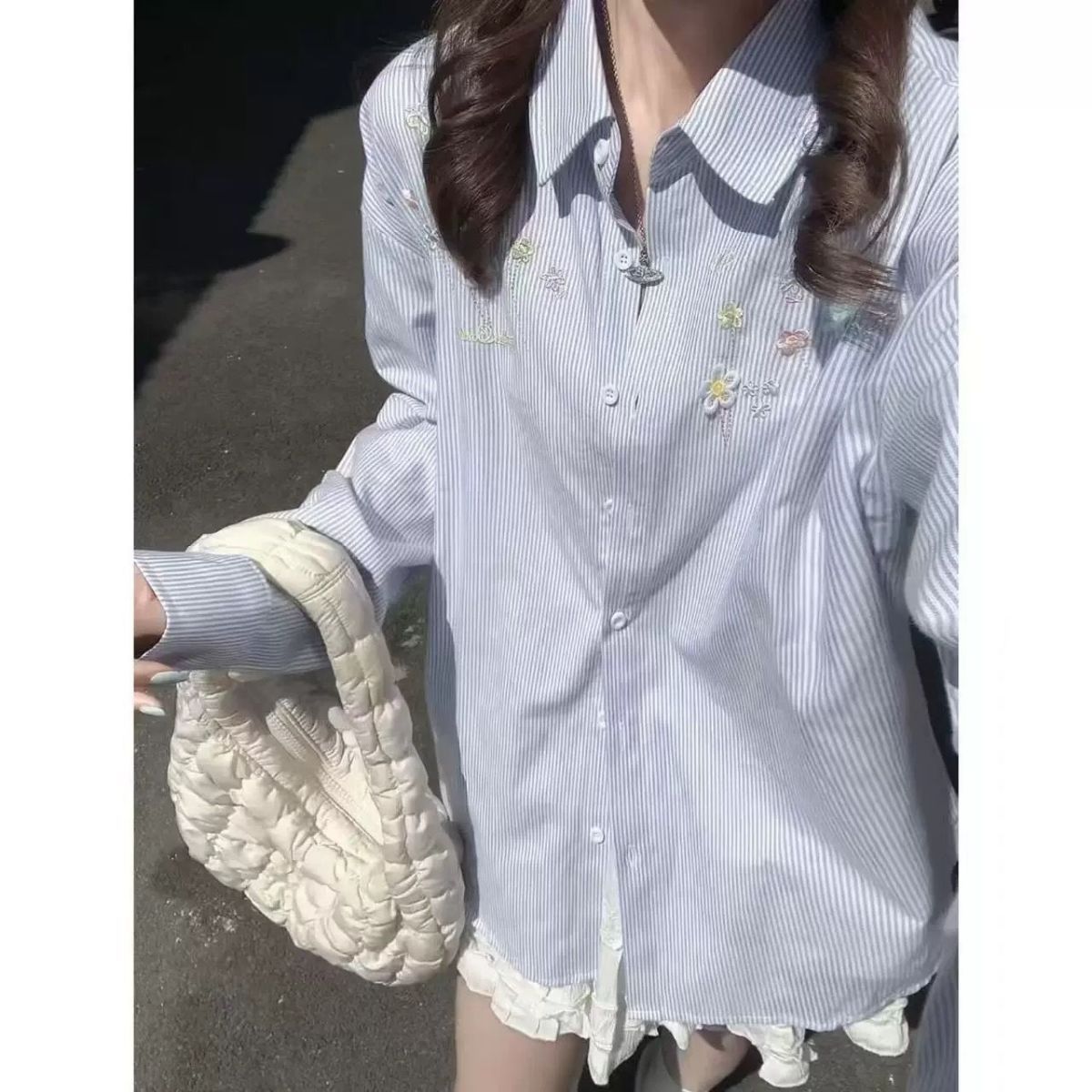 여성용 귀여운 자수 스트라이프 셔츠 한국판, 루즈하고 활용도가 높은 셔츠로 살을 커버해주는 레이어드 셔츠, 자외선 차단 카디건, 트렌디한 인스스토어 가기