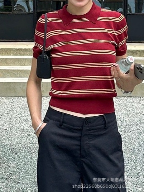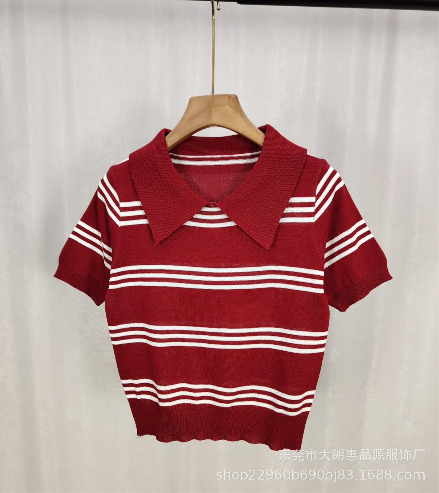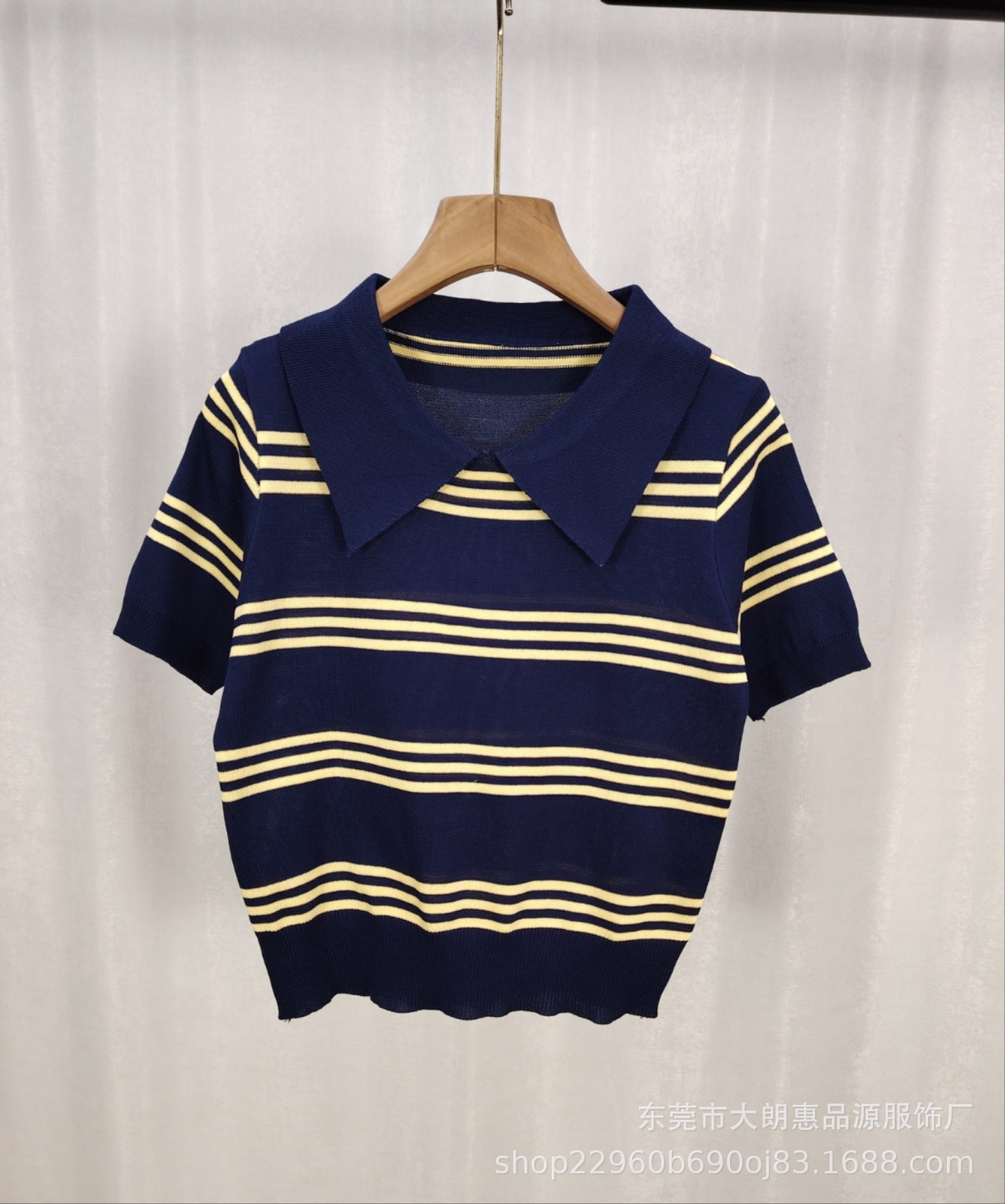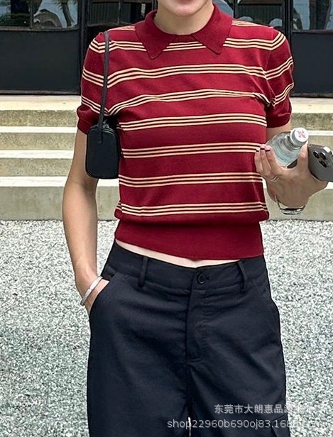 여성을 위한 새로운 여름 복고풍 폴로 칼라 스트라이프 반팔 스웨터, 패셔너블하고 심플한 작은 크롭 탑