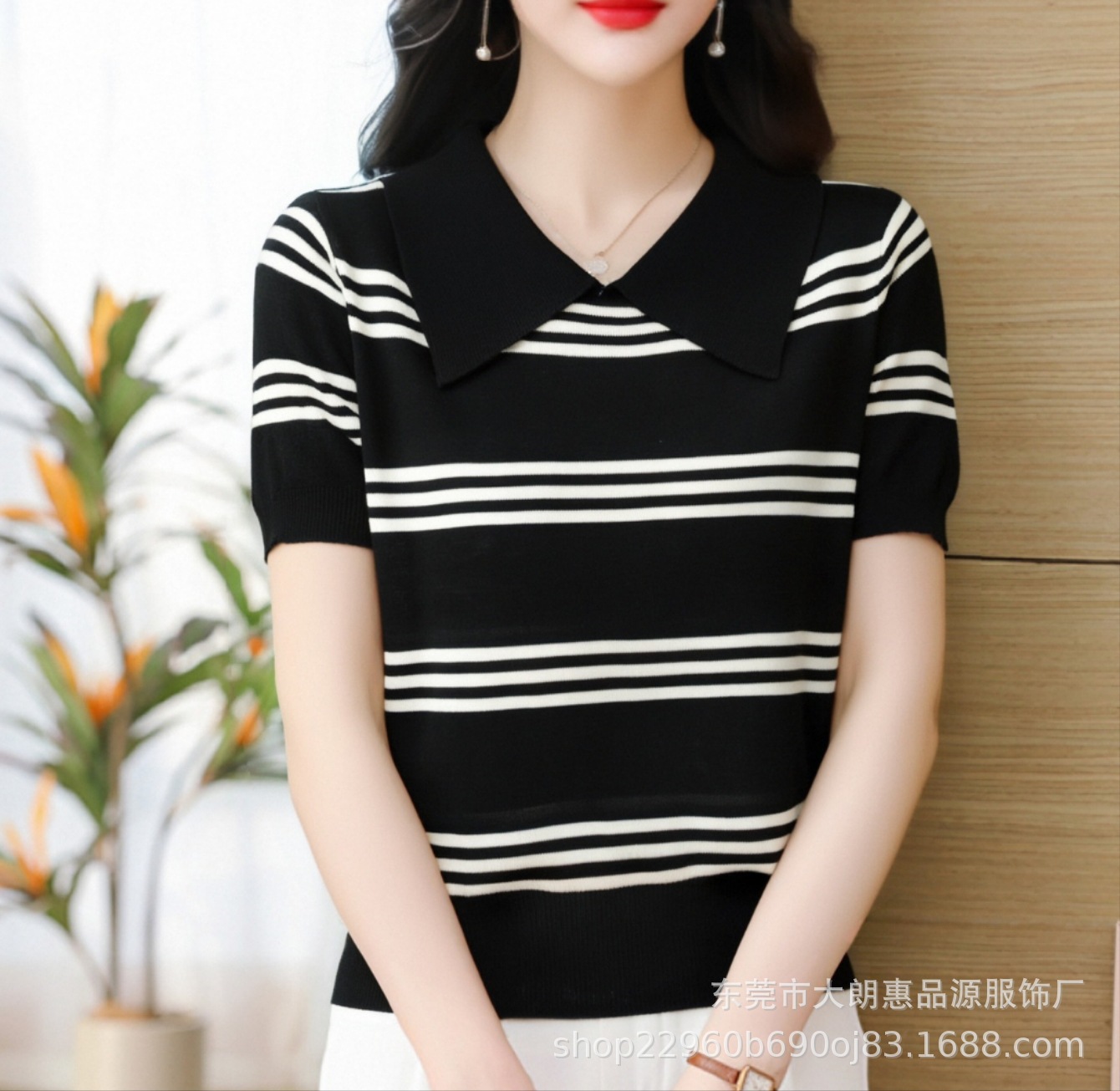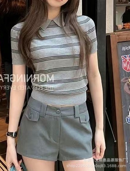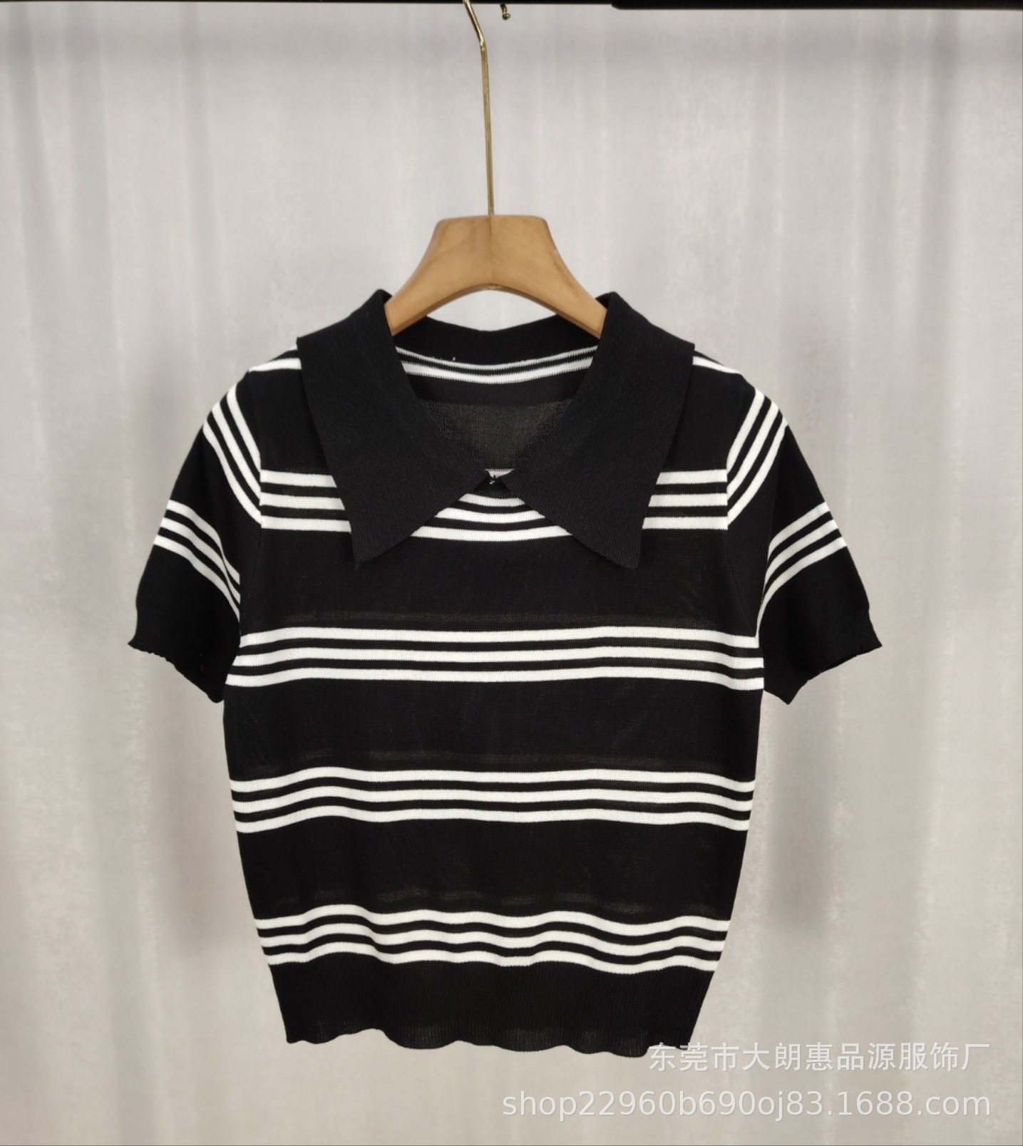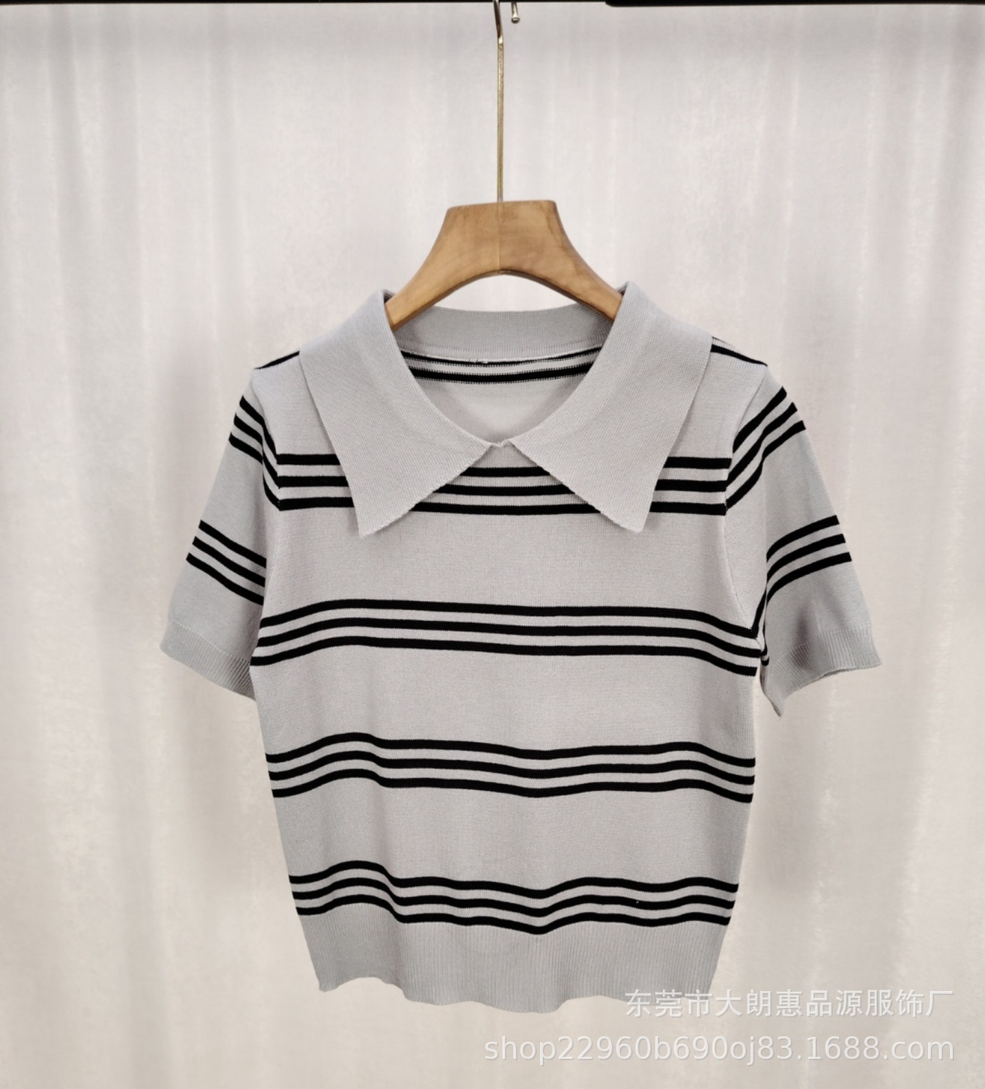 여성을 위한 새로운 여름 복고풍 폴로 칼라 스트라이프 반팔 스웨터, 패셔너블하고 심플한 작은 크롭 탑