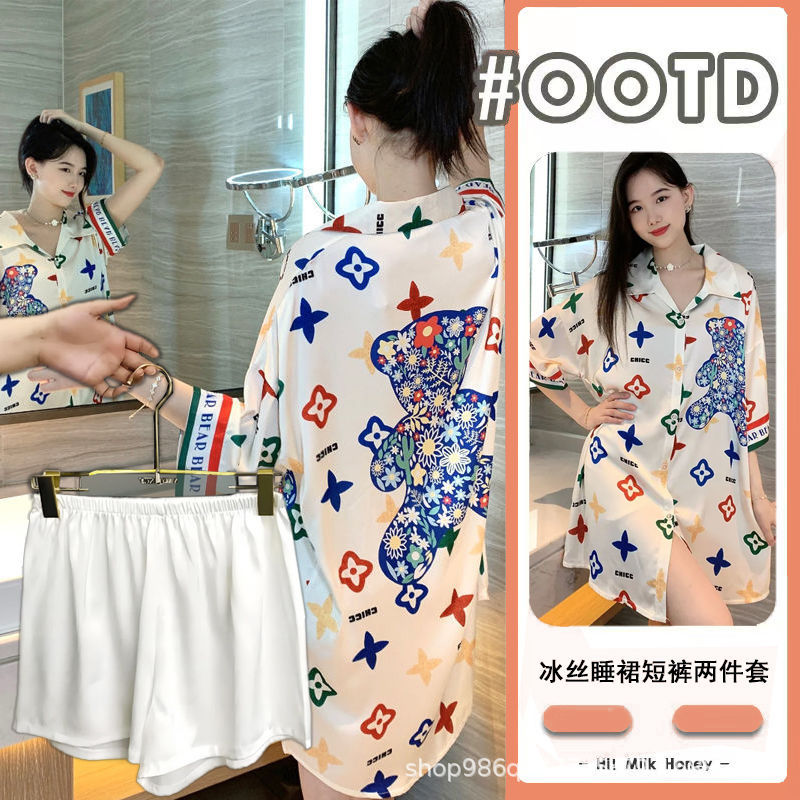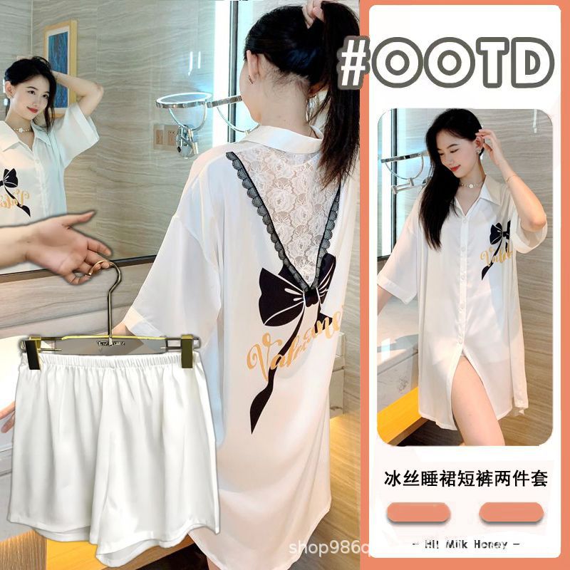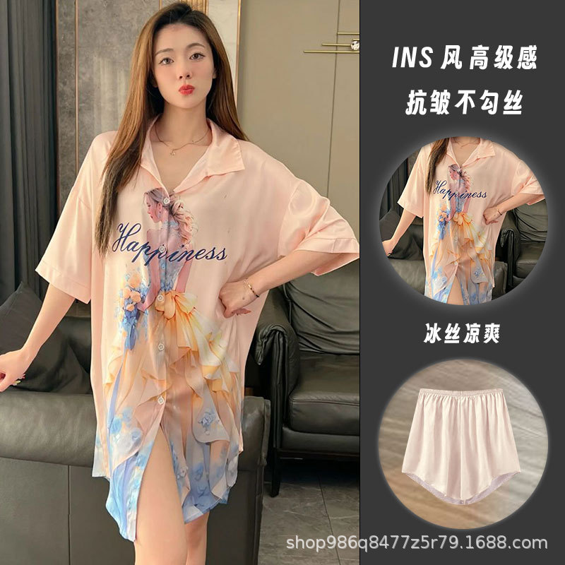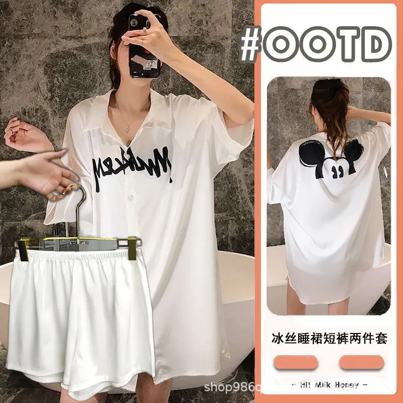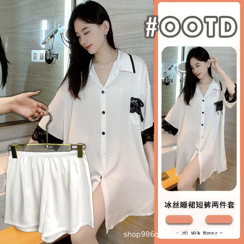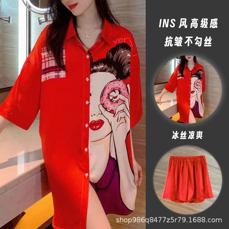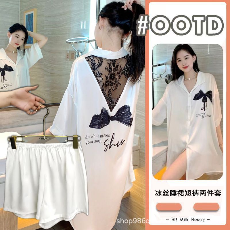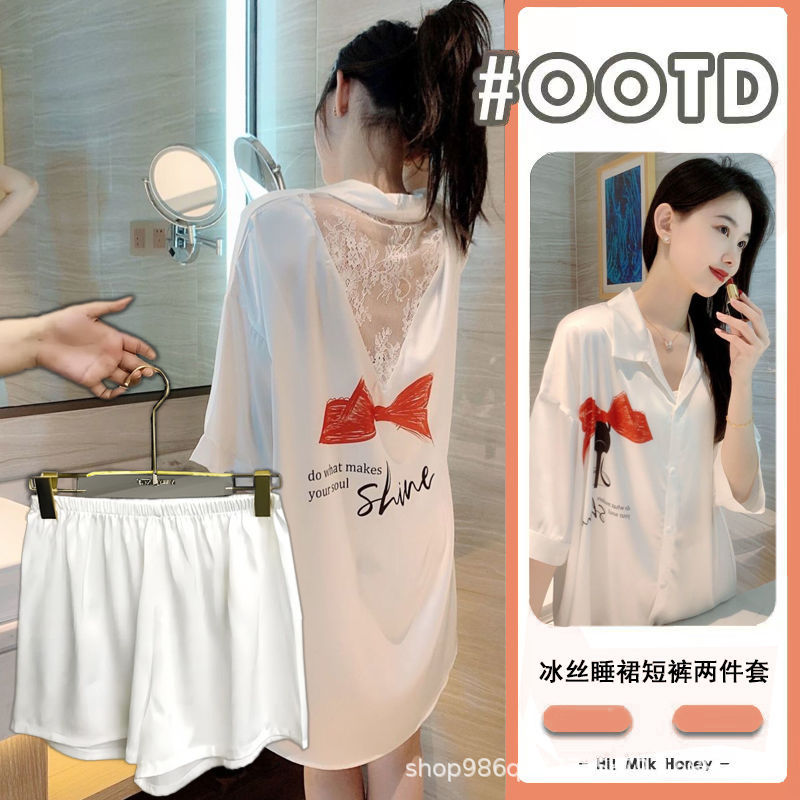 여름 신작 여성 잠옷 얇은 순수한 욕망 섹시한 얼음 실크 쉬폰 셔츠 잠옷 귀여운 홈웨어 투피스 세트
