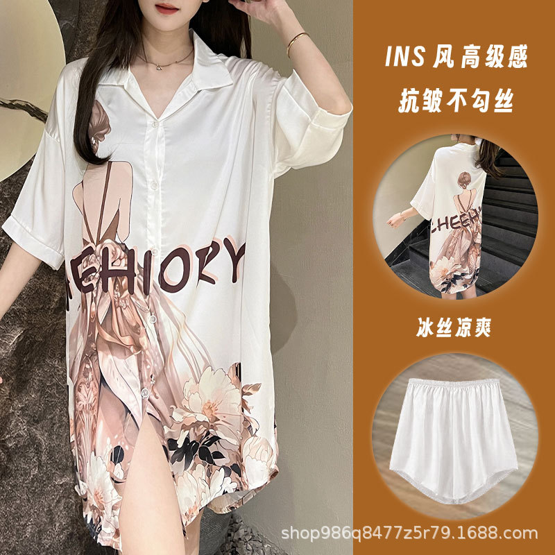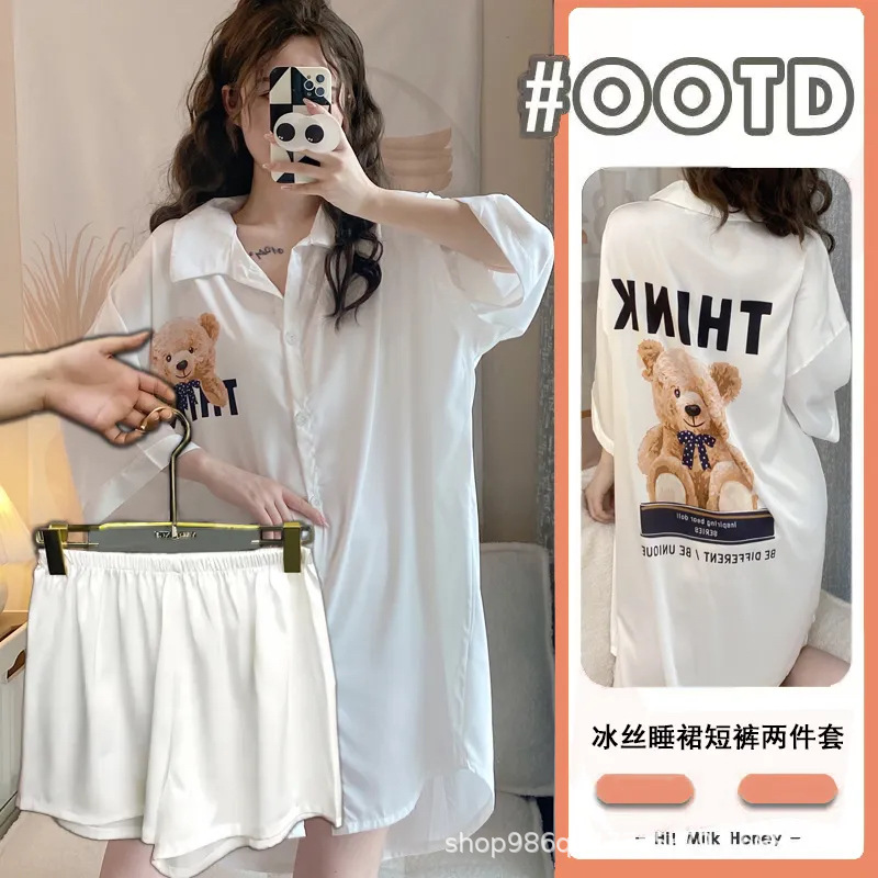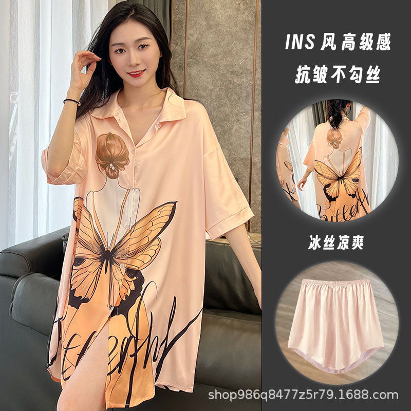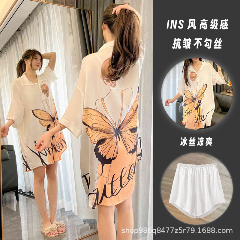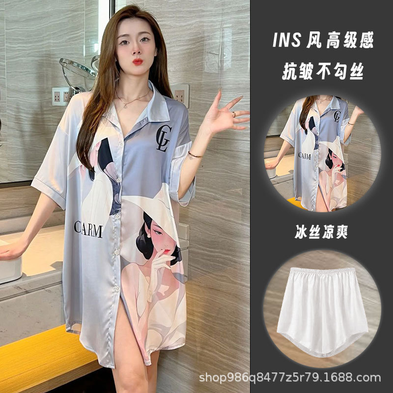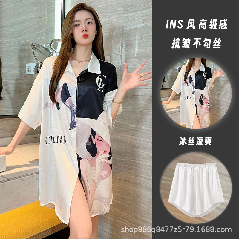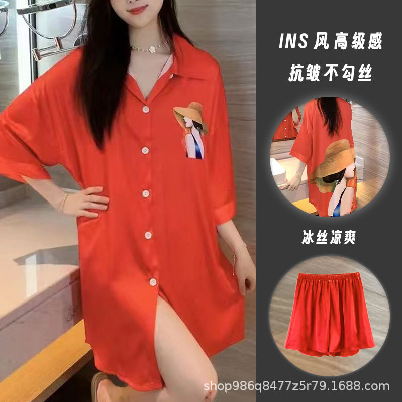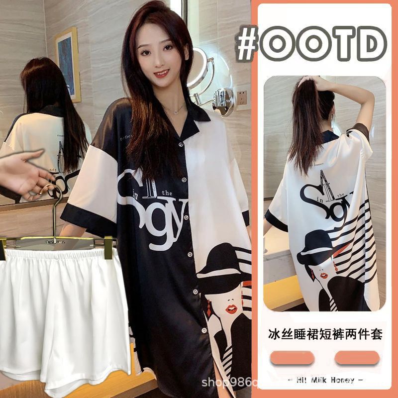 여름 신작 여성 잠옷 얇은 순수한 욕망 섹시한 얼음 실크 쉬폰 셔츠 잠옷 귀여운 홈웨어 투피스 세트