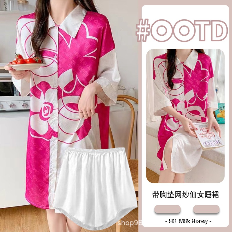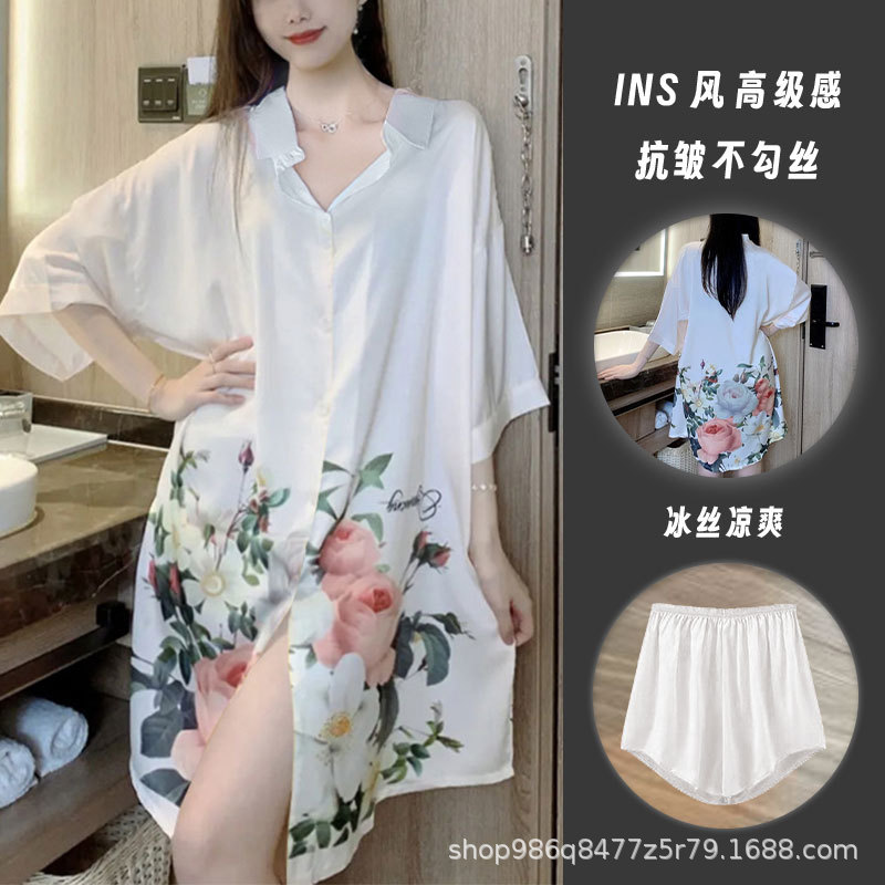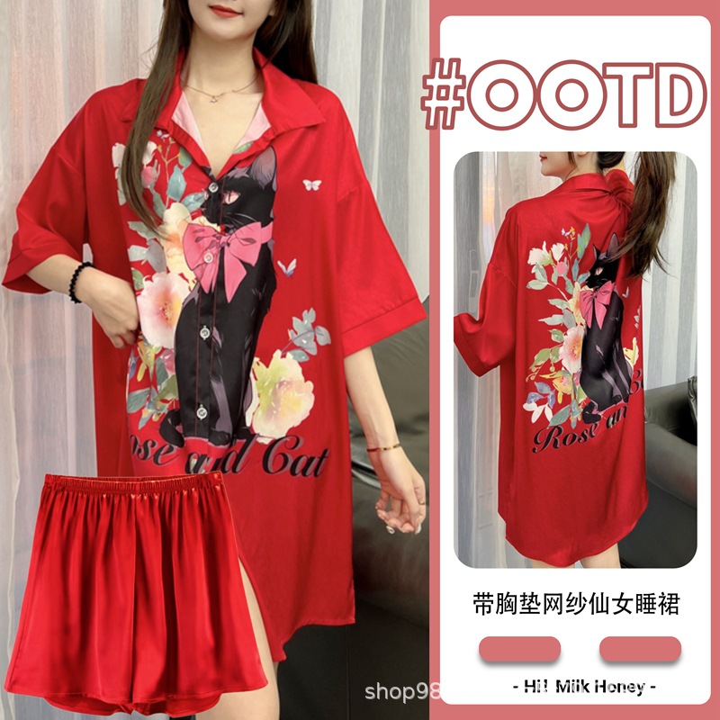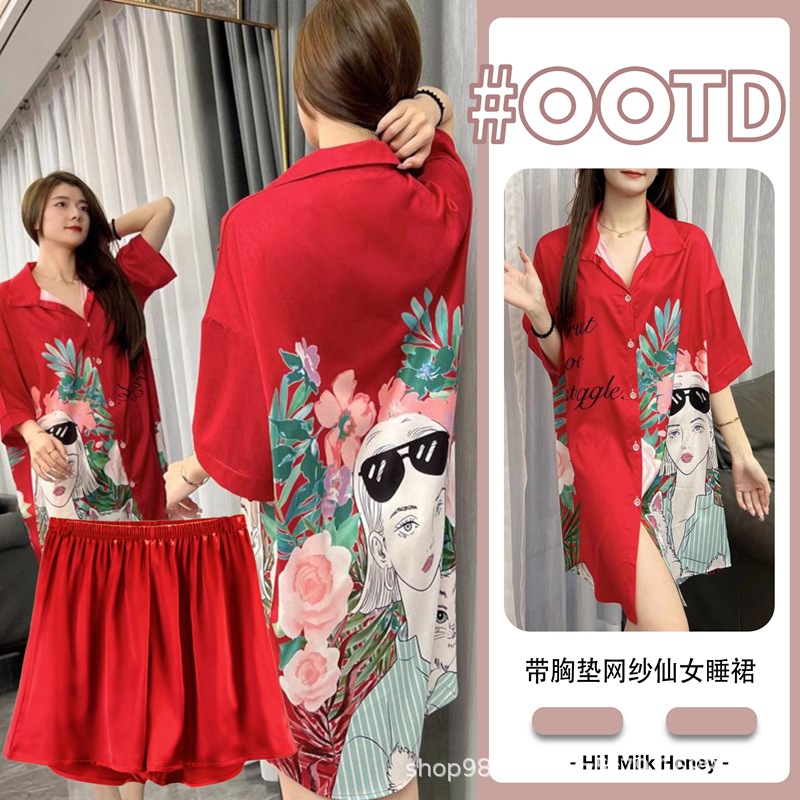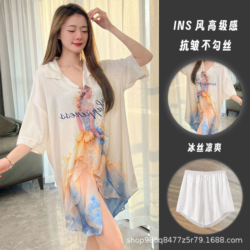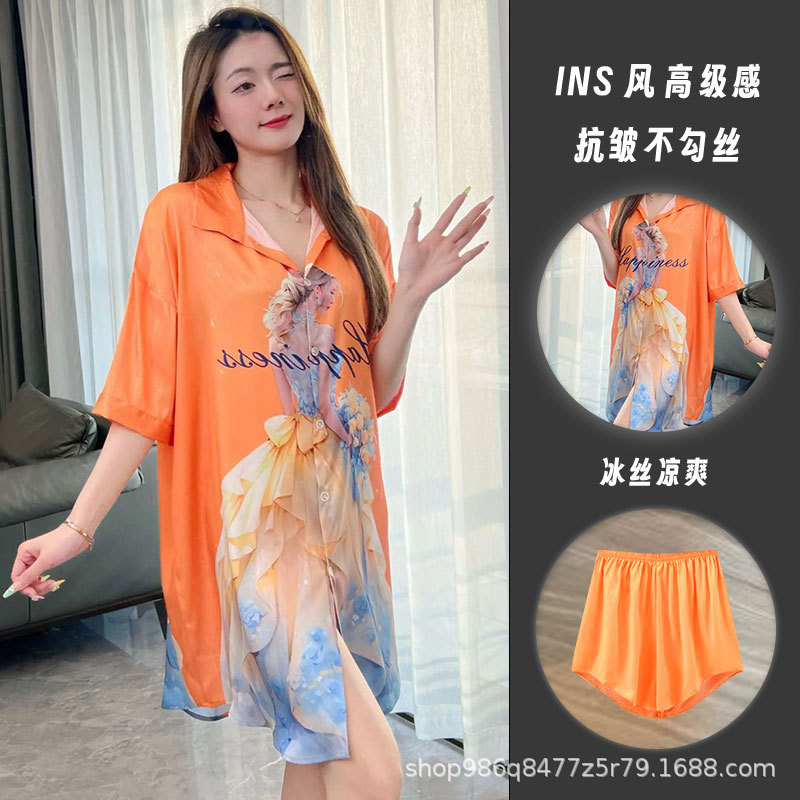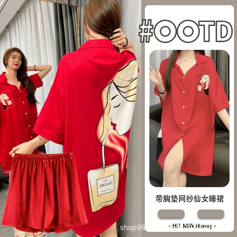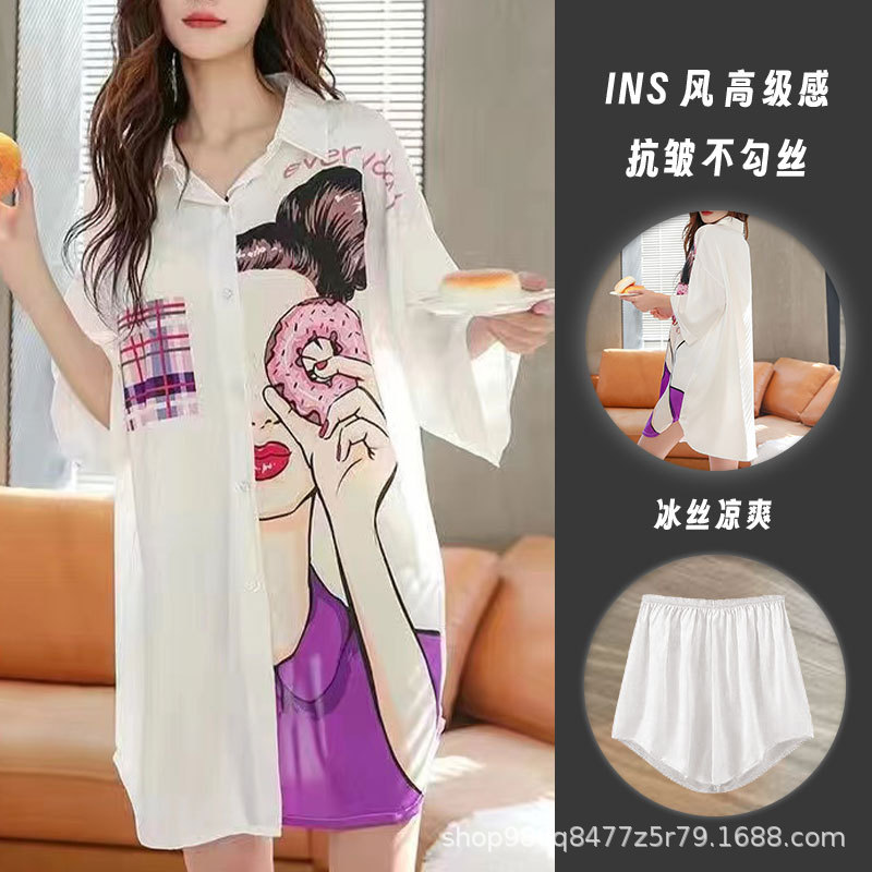 여름 신작 여성 잠옷 얇은 순수한 욕망 섹시한 얼음 실크 쉬폰 셔츠 잠옷 귀여운 홈웨어 투피스 세트