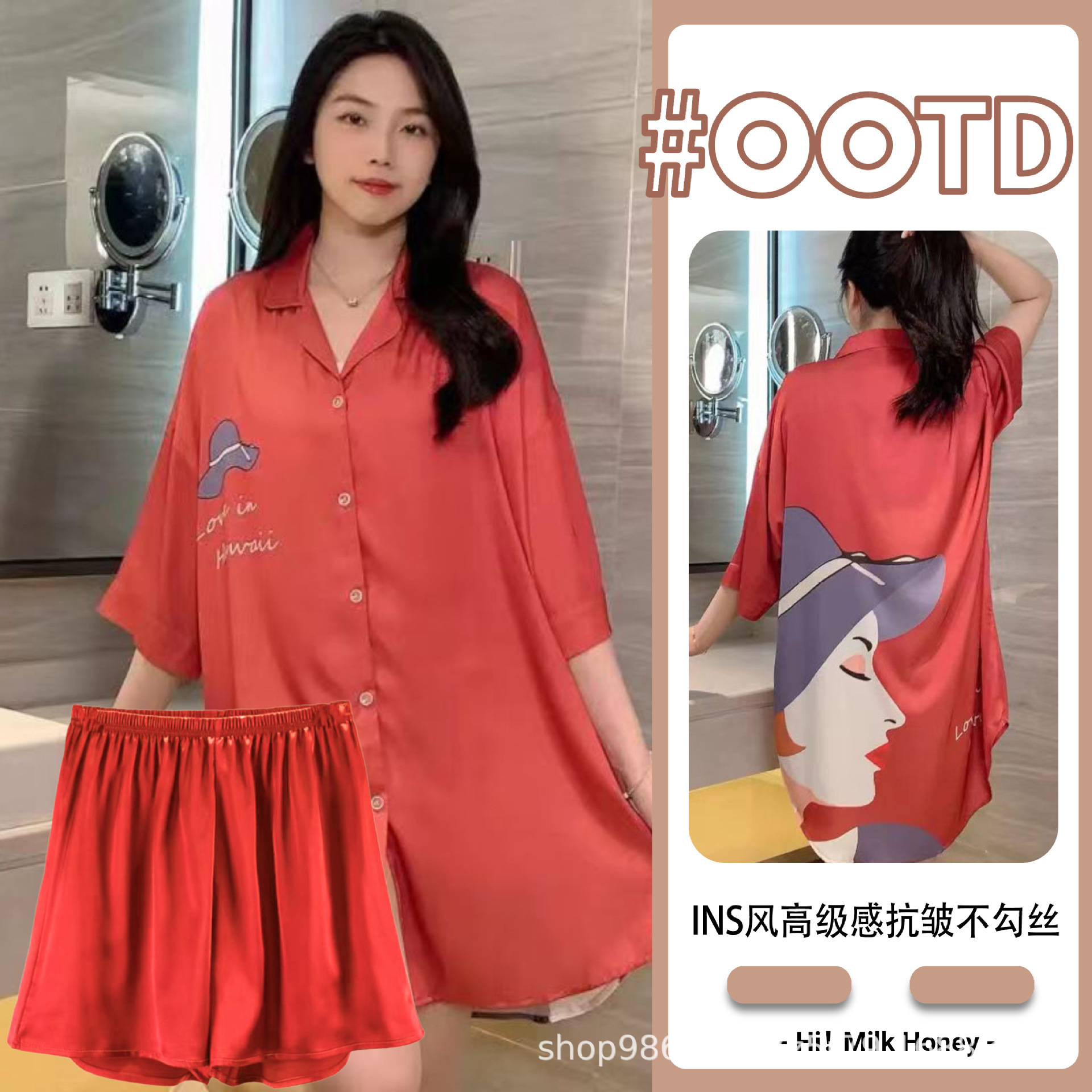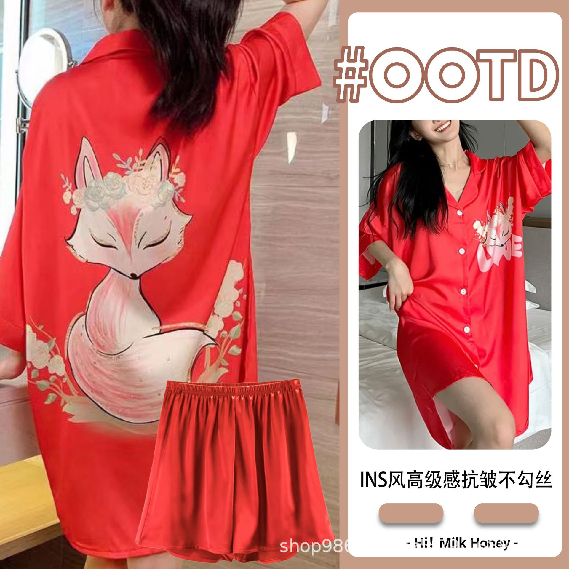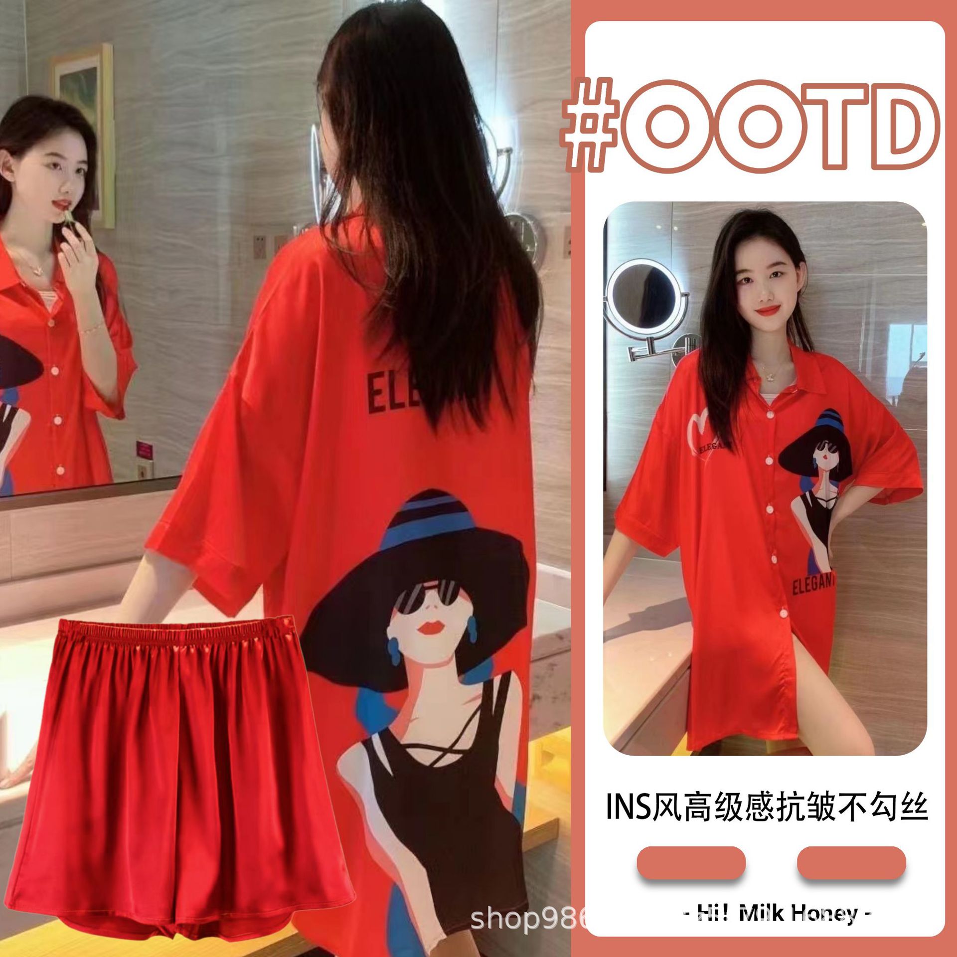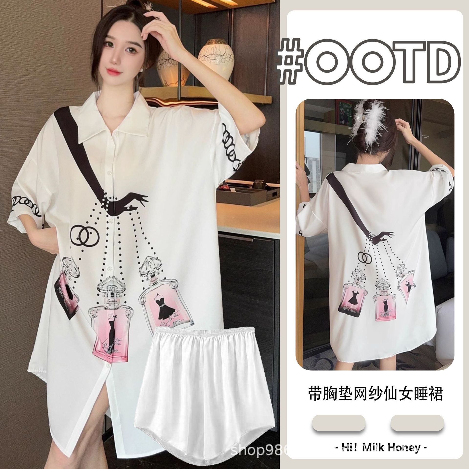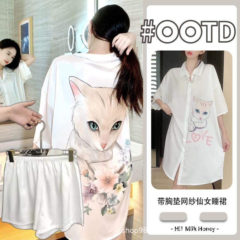 여름 신작 여성 잠옷 얇은 순수한 욕망 섹시한 얼음 실크 쉬폰 셔츠 잠옷 귀여운 홈웨어 투피스 세트