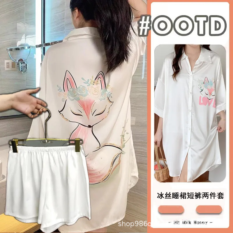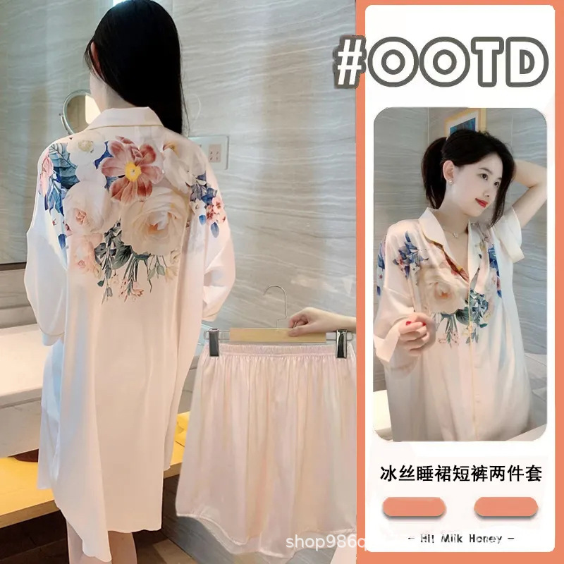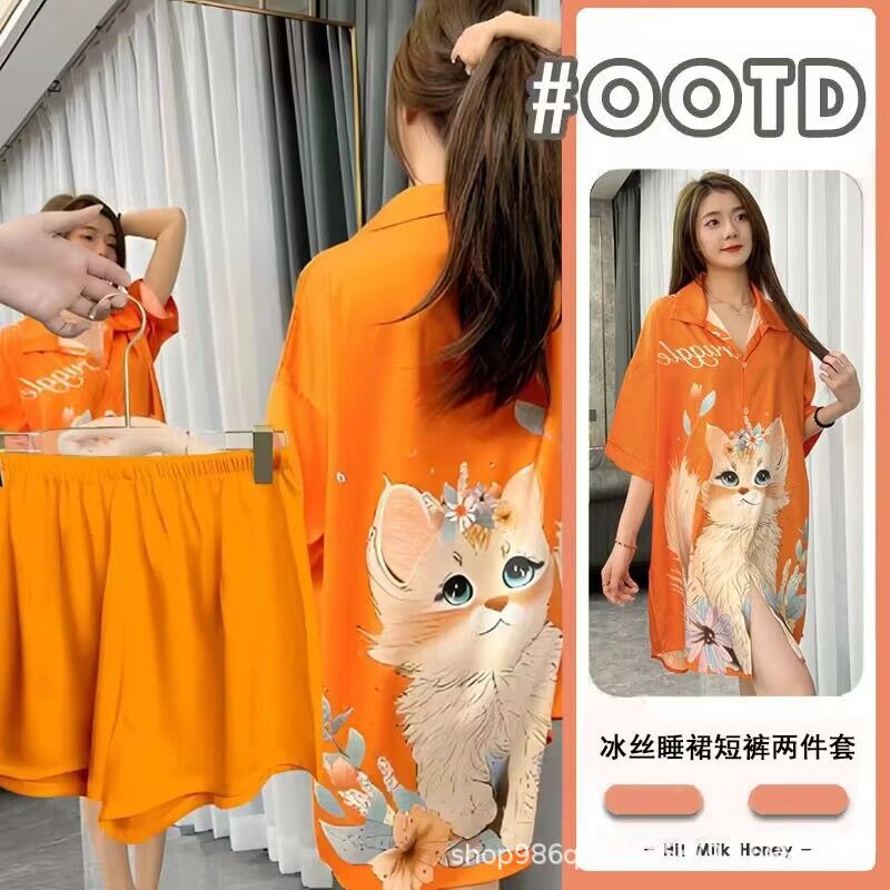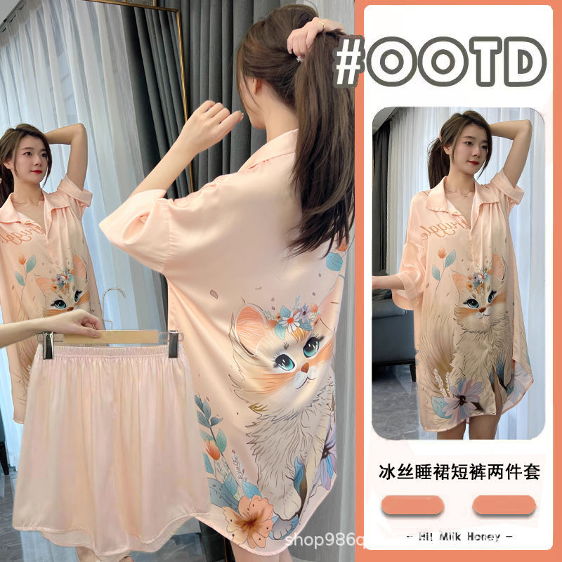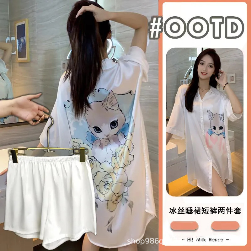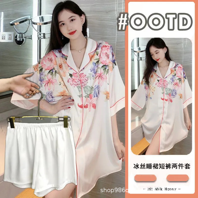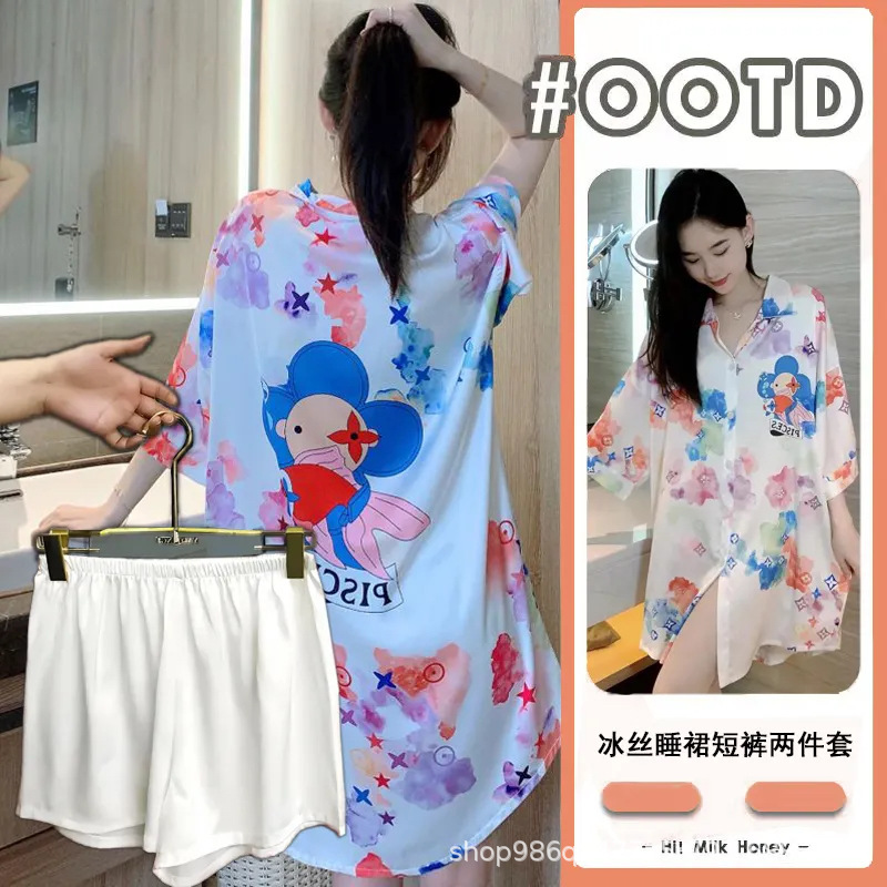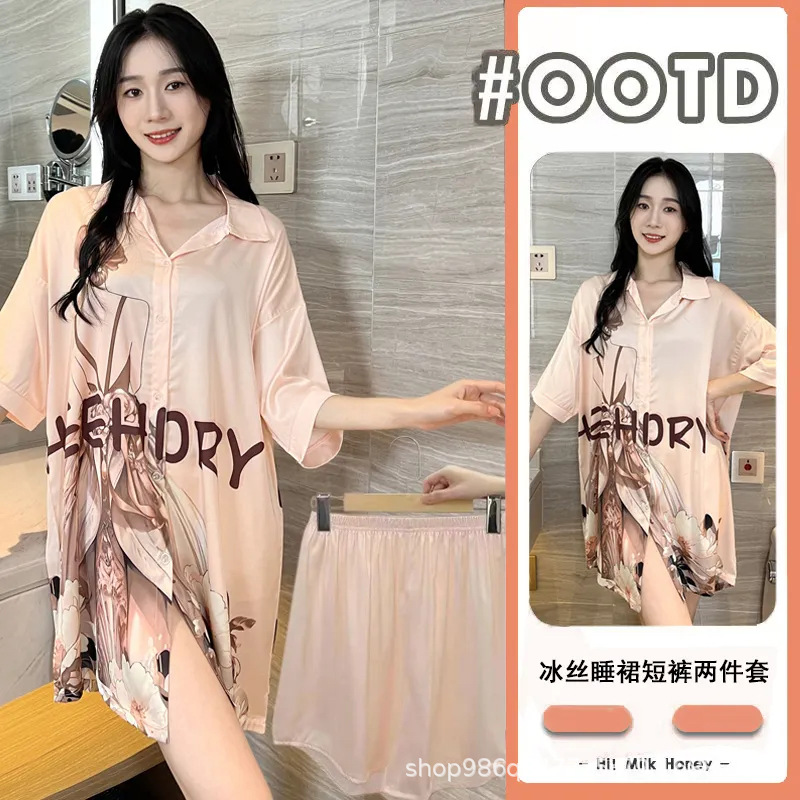 여름 신작 여성 잠옷 얇은 순수한 욕망 섹시한 얼음 실크 쉬폰 셔츠 잠옷 귀여운 홈웨어 투피스 세트스토어 가기