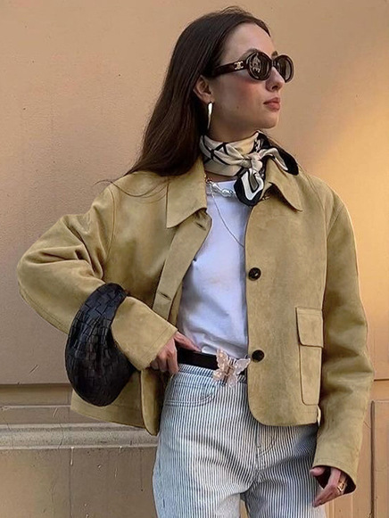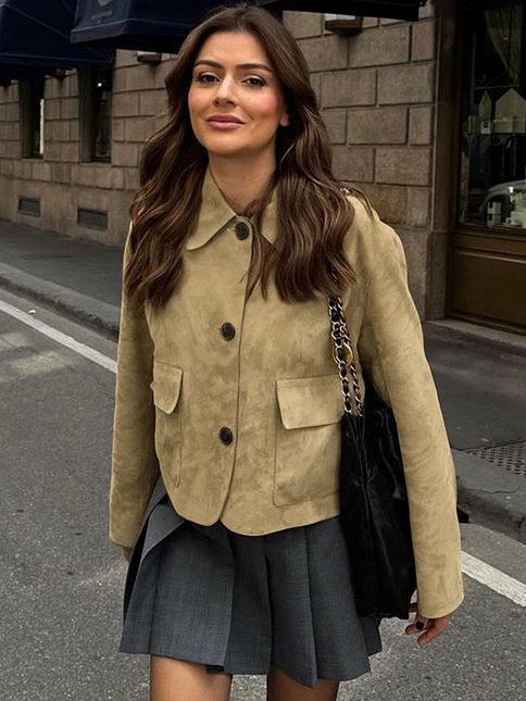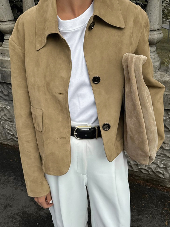 2025 새로운 가을 한국 스타일 디자인 모조 사슴 가죽 벨벳 재킷 여성 느슨한 슬림 짧은 긴팔 재킷 유행스토어 가기