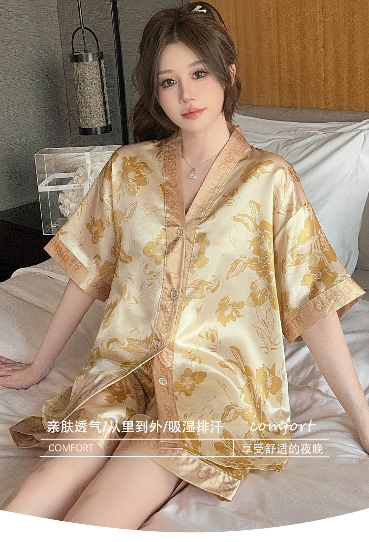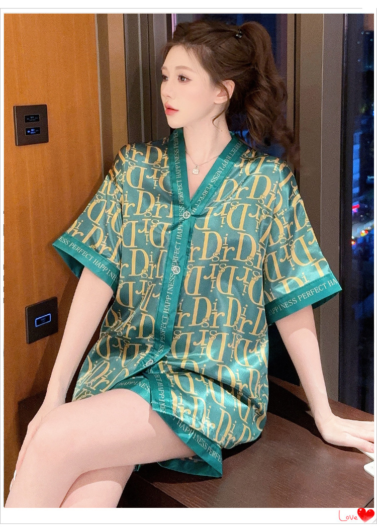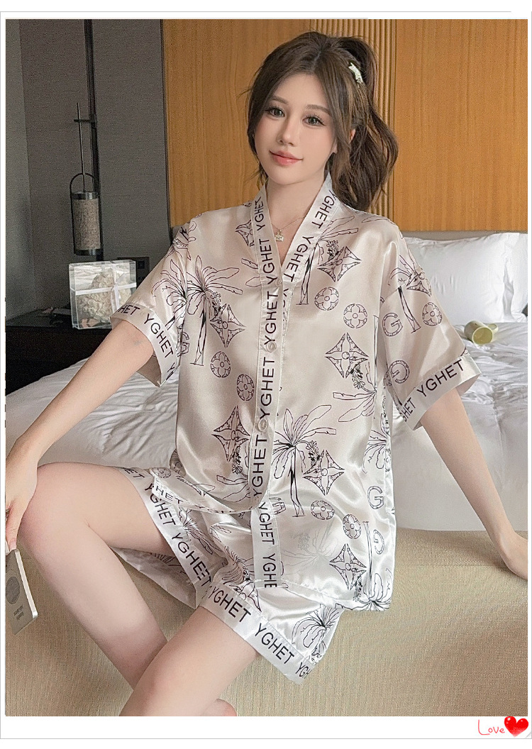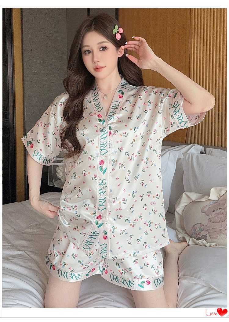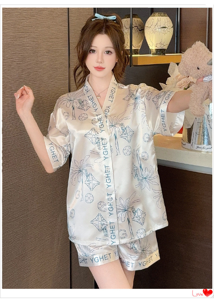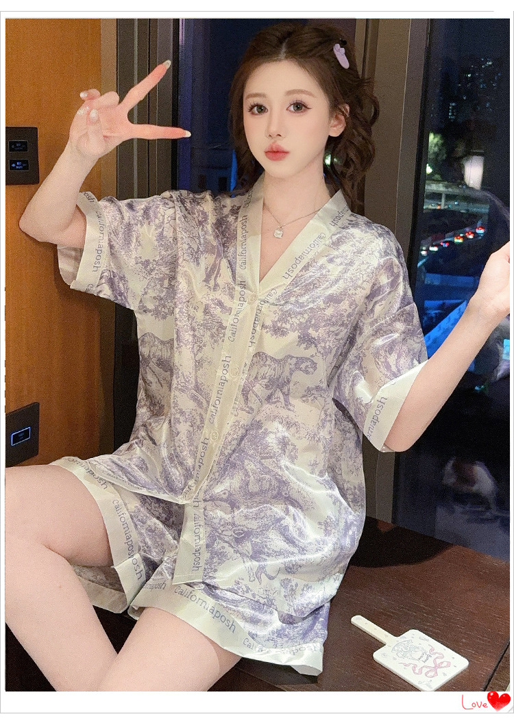 제조업체 실크 반팔 투피스 여성 잠옷 얇은 프린트 아이스 실크 홈웨어 인기 판매 새로운 크로스보더 주문스토어 가기
