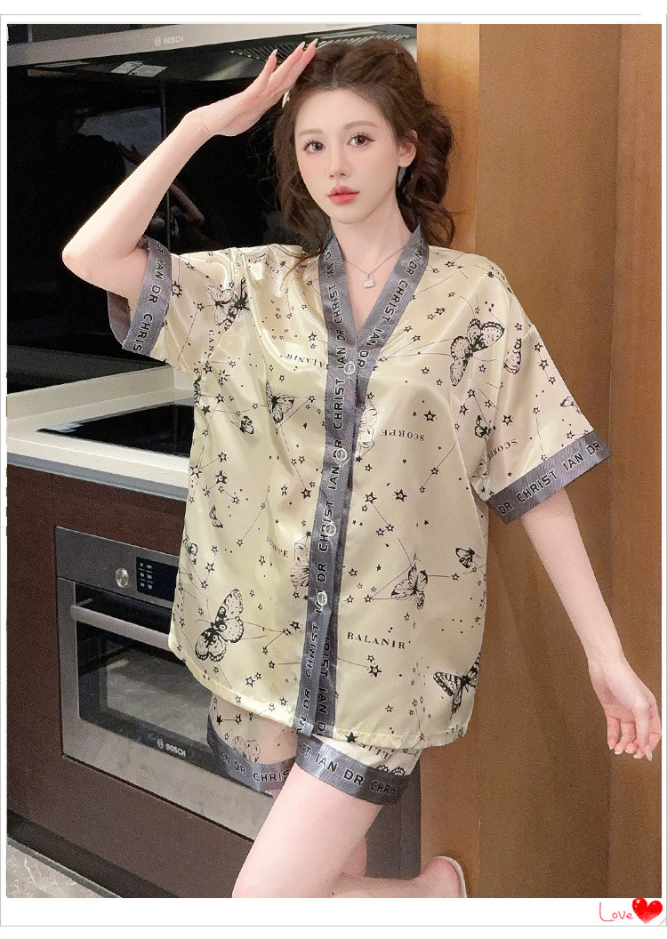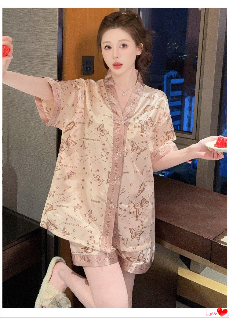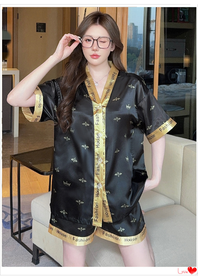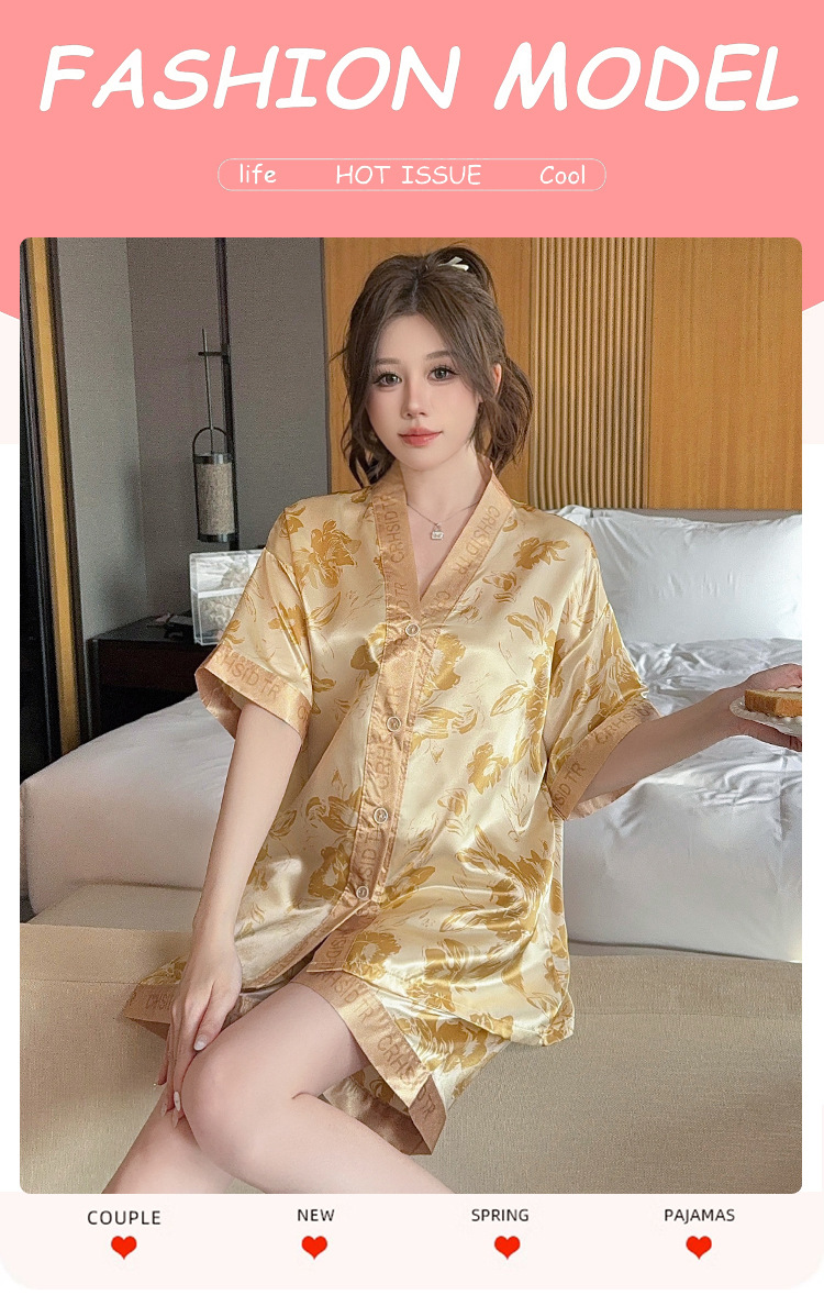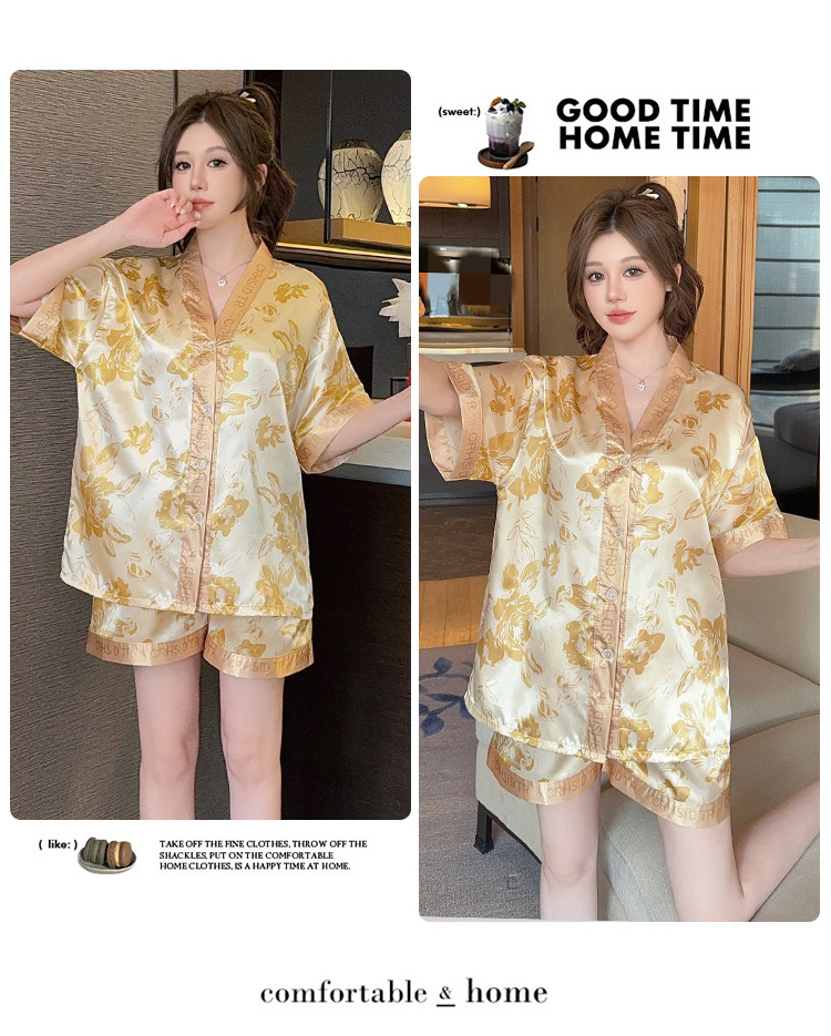 제조업체 실크 반팔 투피스 여성 잠옷 얇은 프린트 아이스 실크 홈웨어 인기 판매 새로운 크로스보더 주문스토어 가기
