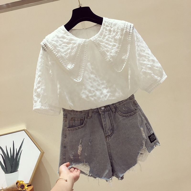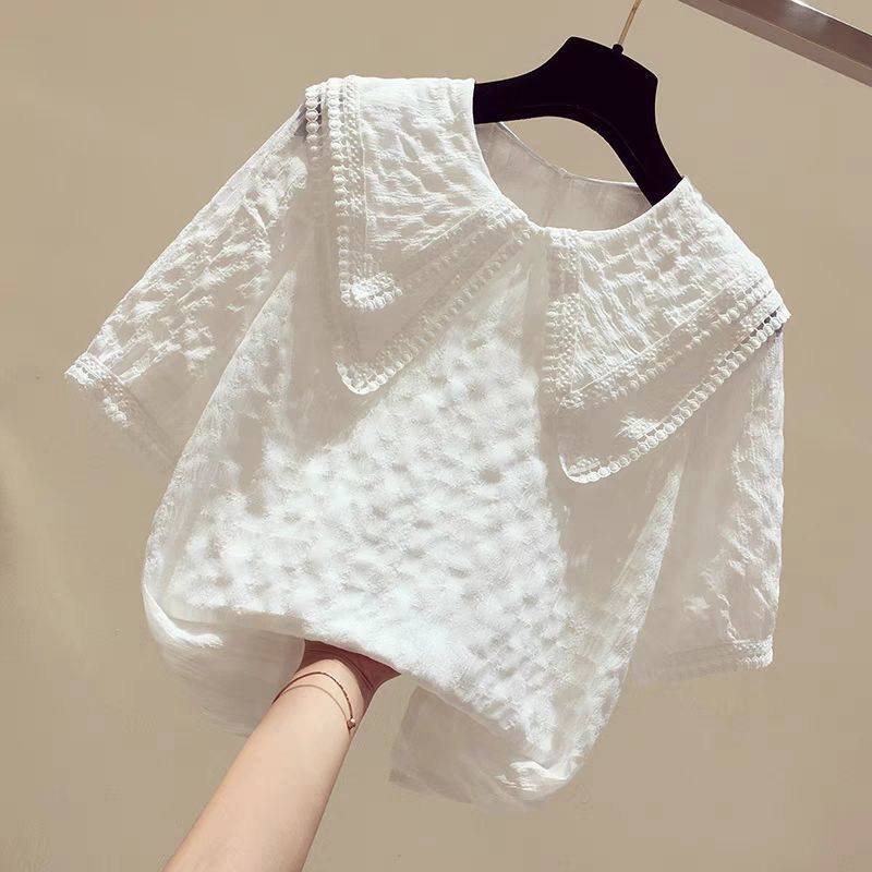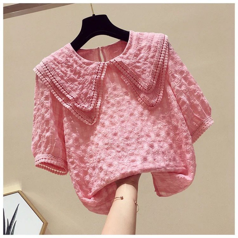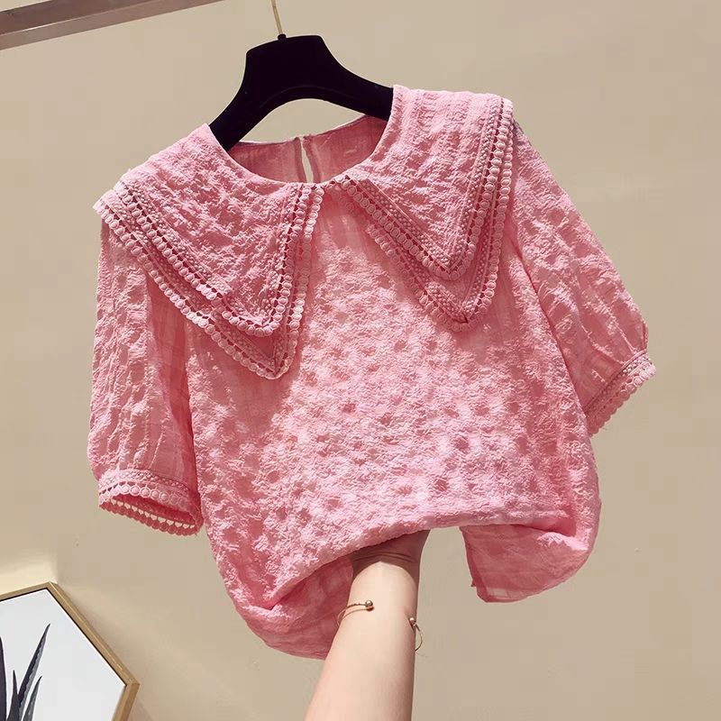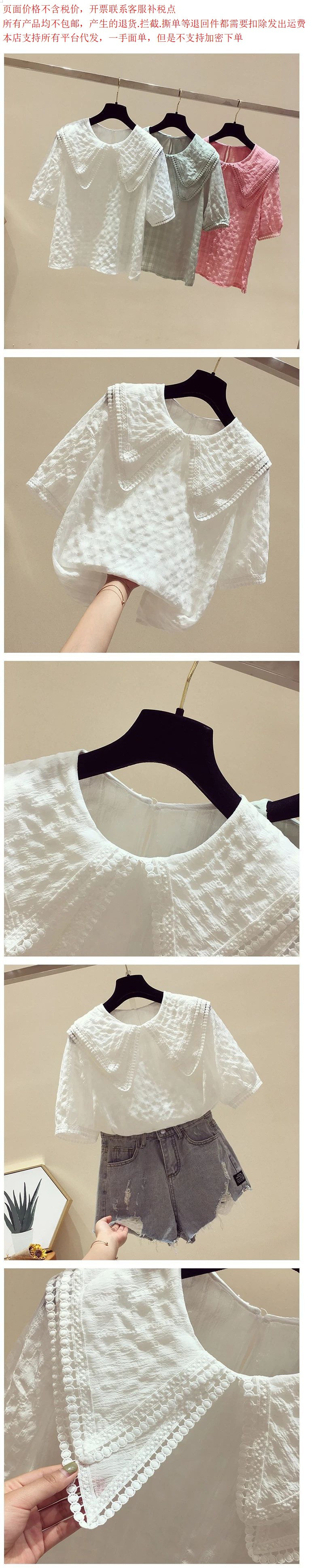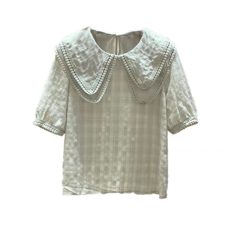 여자 반팔 티셔츠 2023 여름 새 스타일 인형 칼라 쉬폰 셔츠 여자 반팔 유행 프릴 탑스토어 가기