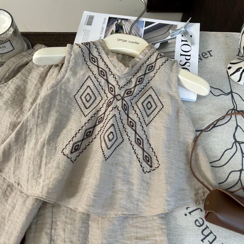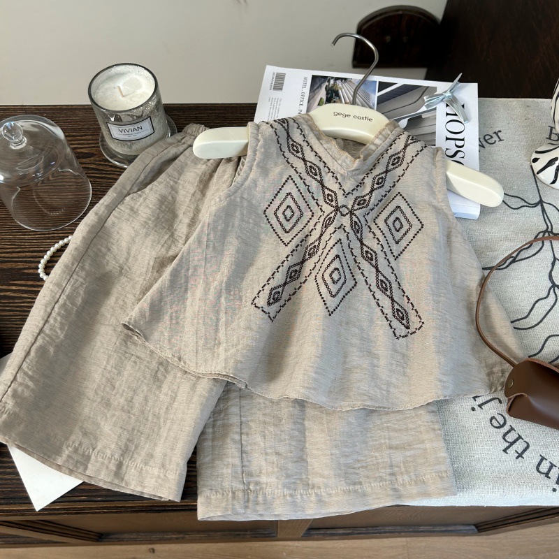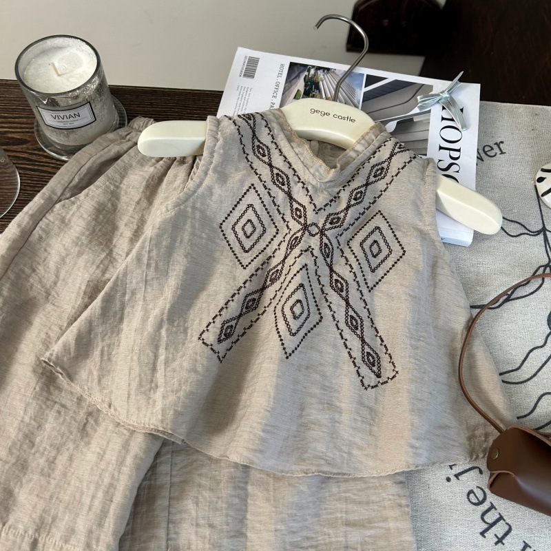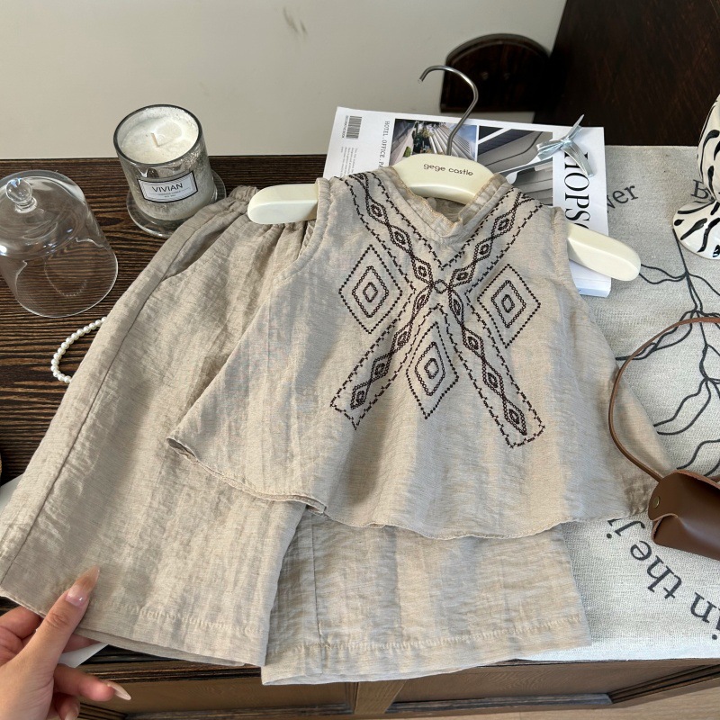 한국 스타일 아동복 2025 새로운 여름 소녀 수 놓은 인형 셔츠 정장 어린이 보헤미안 휴가 투피스 세트스토어 가기