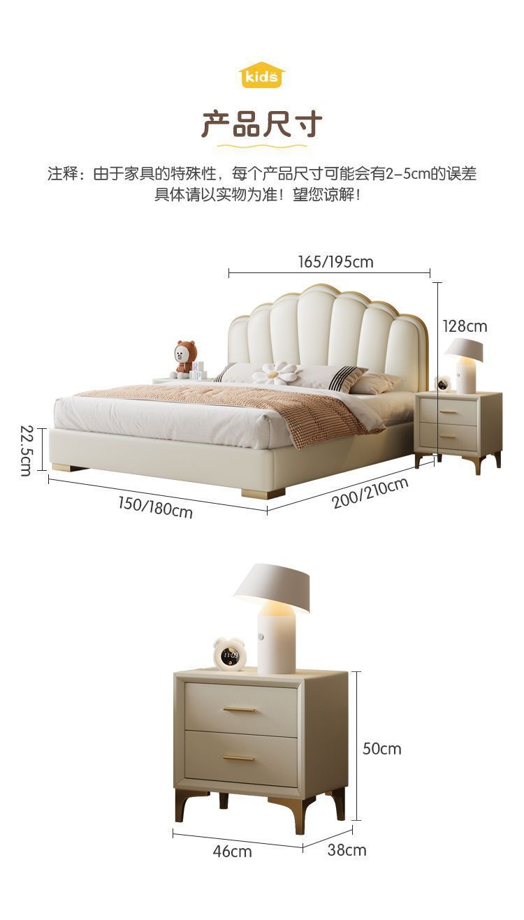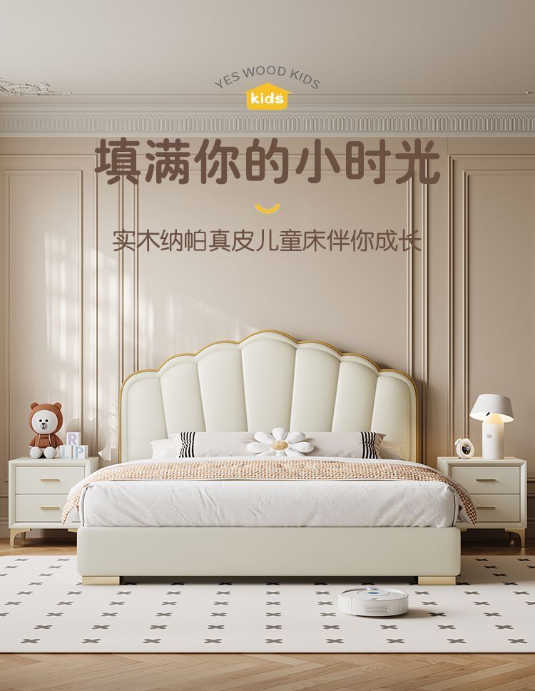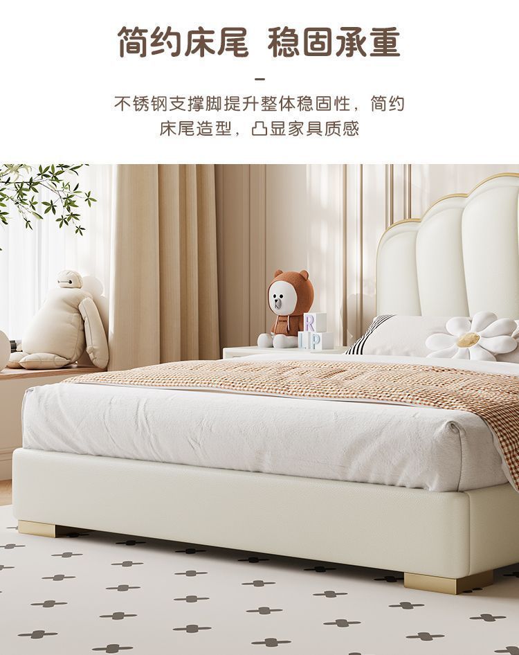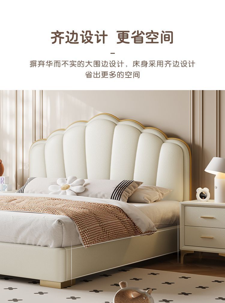 어린이 침대, 천연 가죽 침대, 심플 모던 더블 침대, 클래식 꽃잎 침대, 크림 라이트 럭셔리 인터넷 연예인 공주 침대 수납 침대